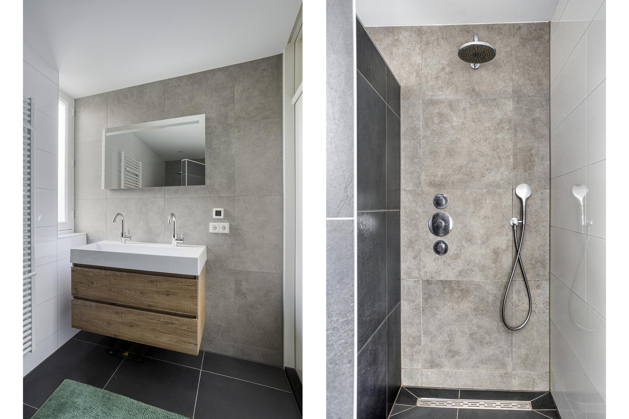 - Toilet, dubbele wastafel, wastafelmeubel en inloopdouche