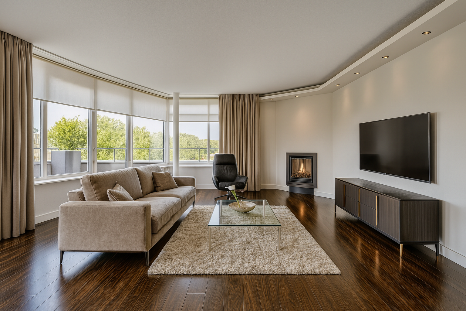 Vanuit de lift bereik je een portaal met enkel toegang tot dit penthouse en tot de eigen, ruime berging. Deze berging is eventueel om te bouwen als slaapkamer. Binnenkomst in de hal met dubbele, glazen deuren naar de riante living met een totale breedte van ruim 12 meter! De grote raampartijen met halfronde erker maken het tot een fantastisch lichte ruimte en bieden fraai en vrij uitzicht over de omgeving. Er is meer dan voldoende ruimte voor een riante zit- en eethoek. De living is afgewerkt met een gezellige gashaard en middels openslaande deuren is het dakterras bereikbaar. Het terras is gunstig gesitueerd op het zuidwesten, deels overkapt en strekt zich uit over de volle breedte van het penthouse. Het weidse uitzicht is vanaf dit niveau is erg mooi!