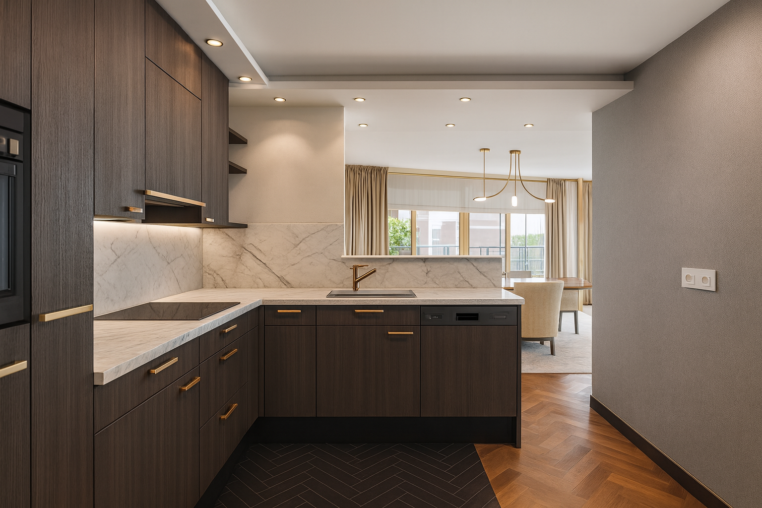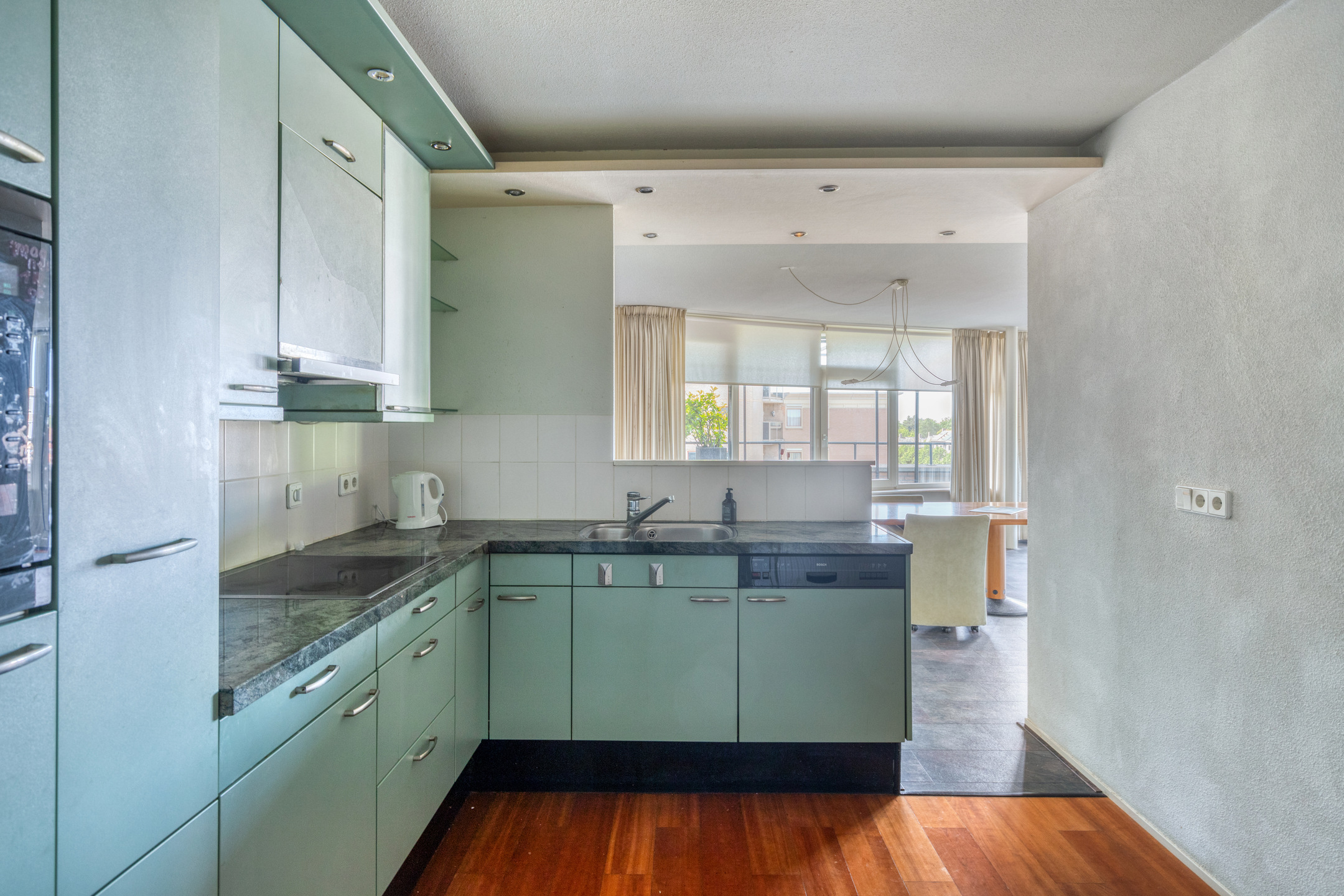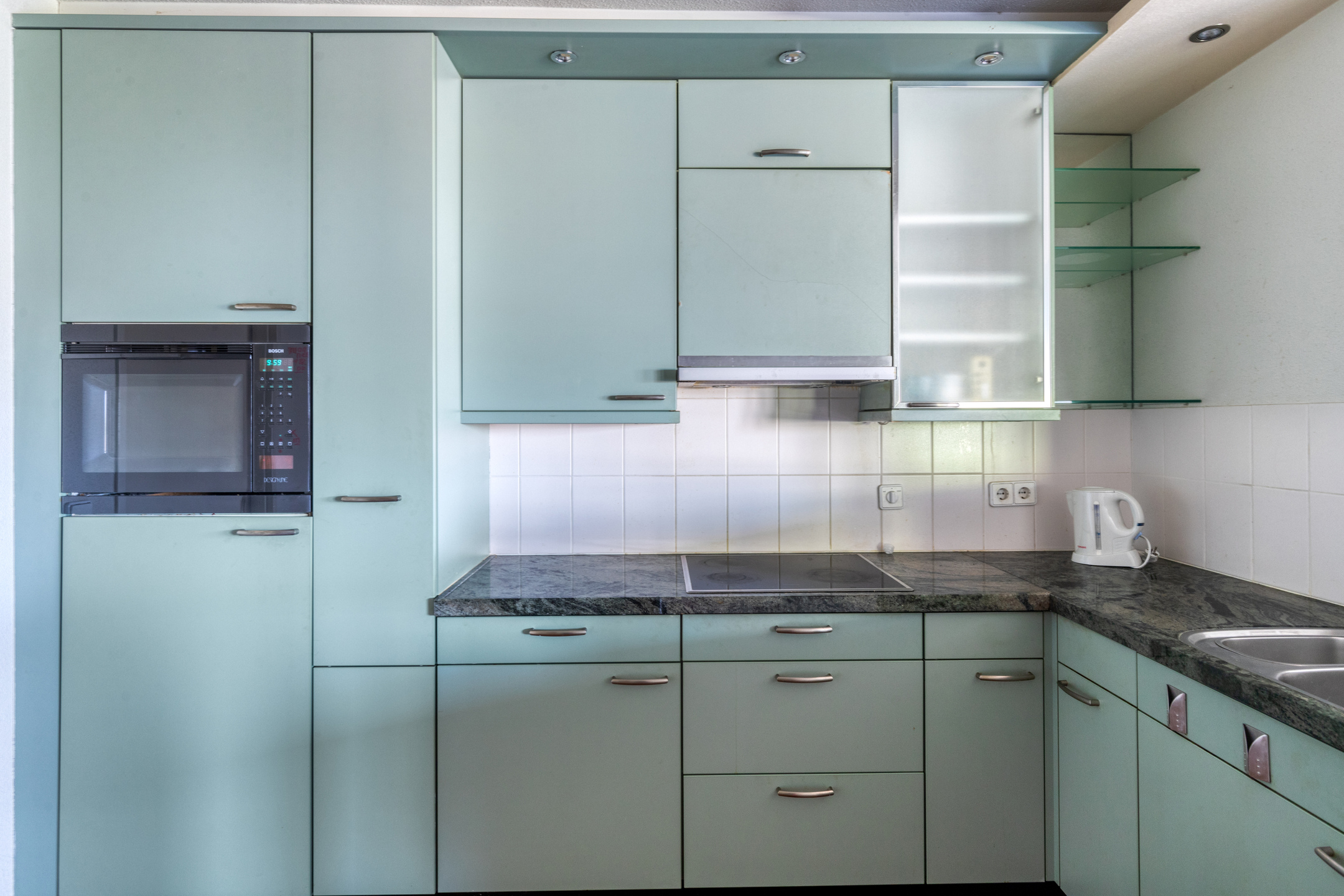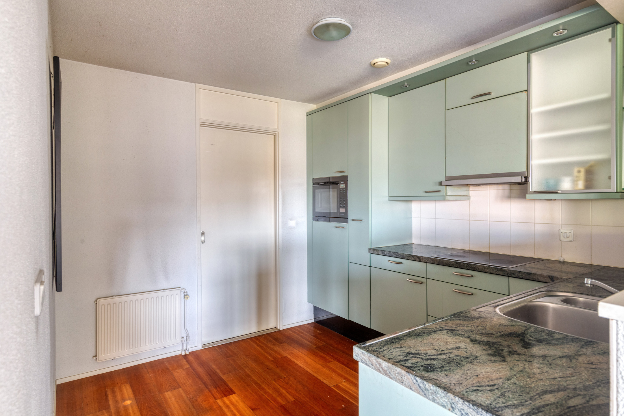 De keuken staat in open verbinding met de living en is voorzien van een keukenmeubel in een lichtgroene kleurstelling met een hoekvorming wandmeubel en diverse inbouwapparatuur zoals een combimagnetron, keramische kookplaat,afzuigkap, koelkast en een vaatwasser. Naast de keuken bevindt zich een bijkeuken met de aansluitingen voor de wasapparatuur, standplaats van de combi-ketel, mechanische ventilatie-unit en plek voor bijvoorbeeld een extra koelkast of vriezer.