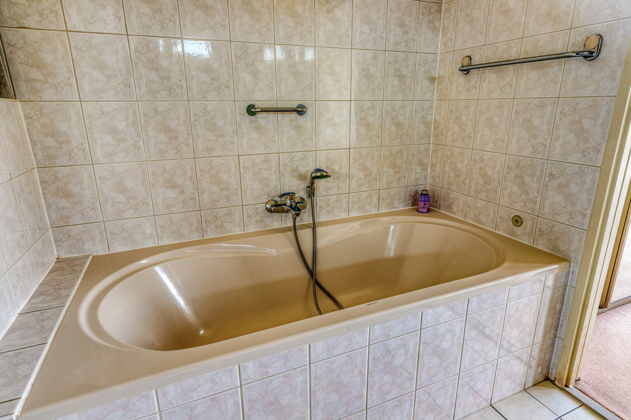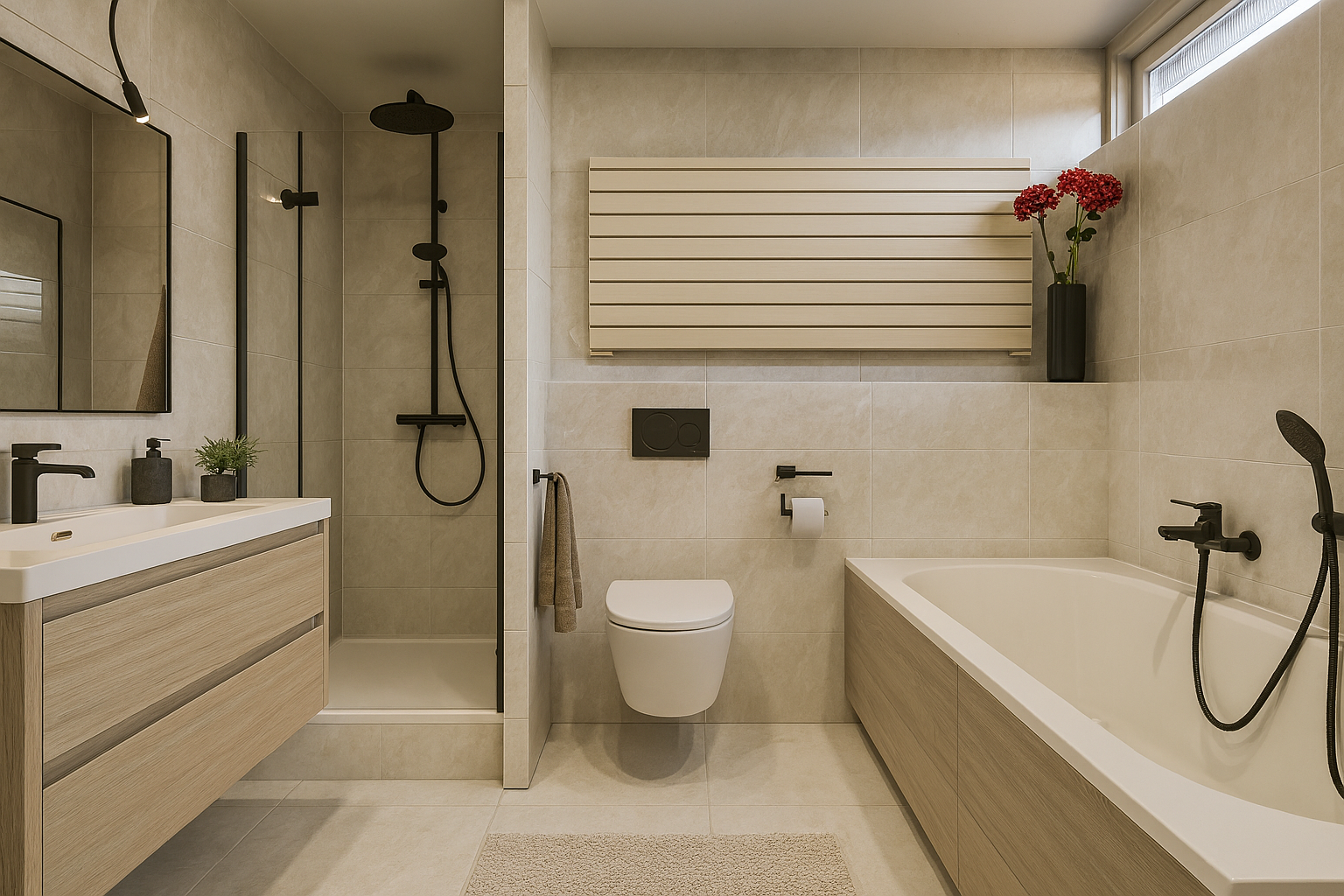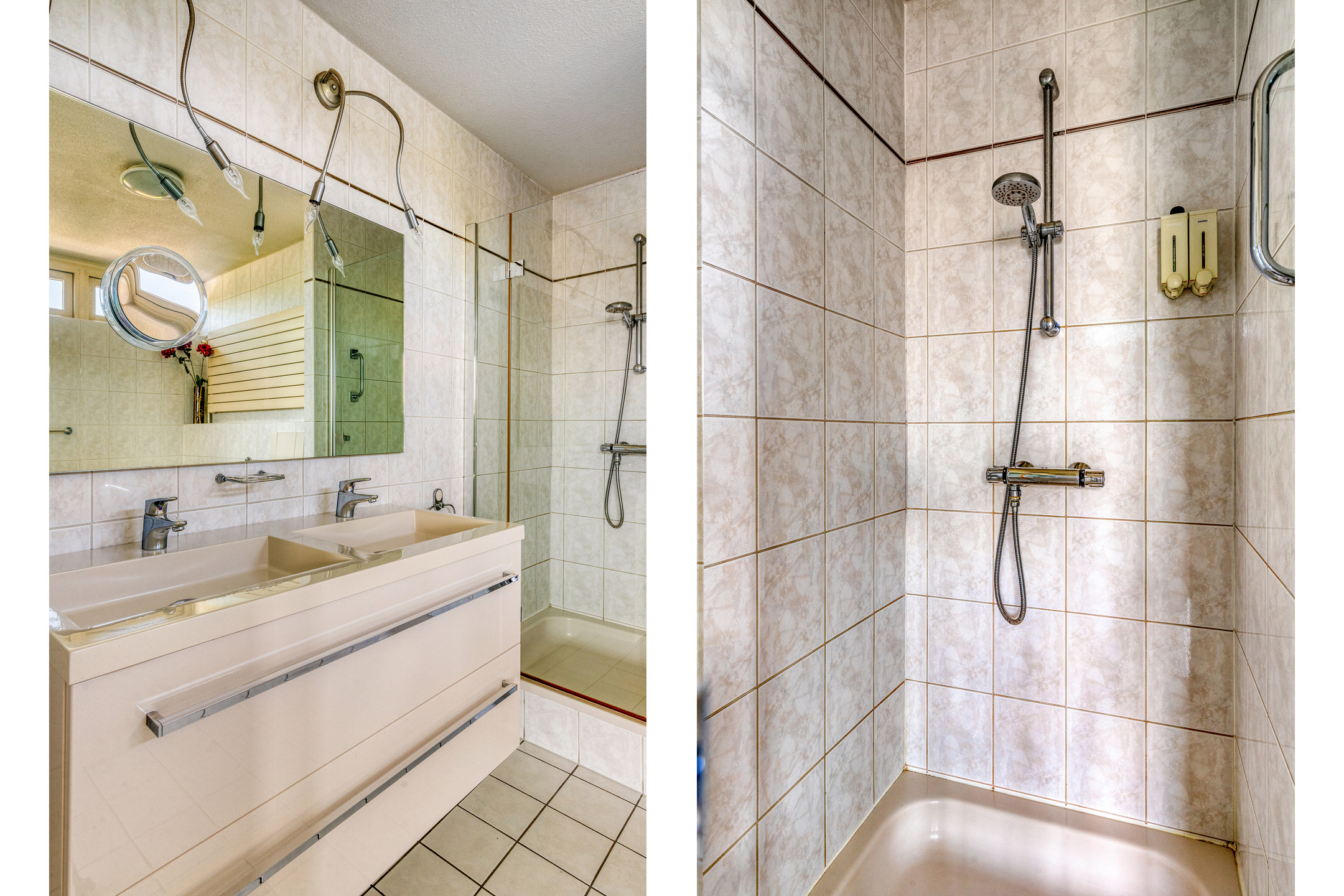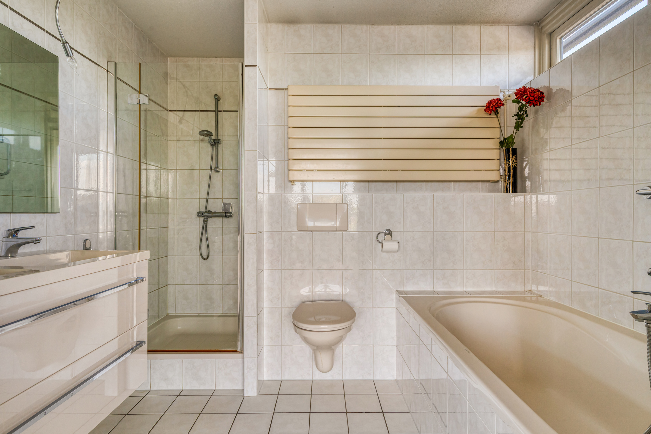 - Douche, wastafel, ligbad, toilet en dubbele wastafel