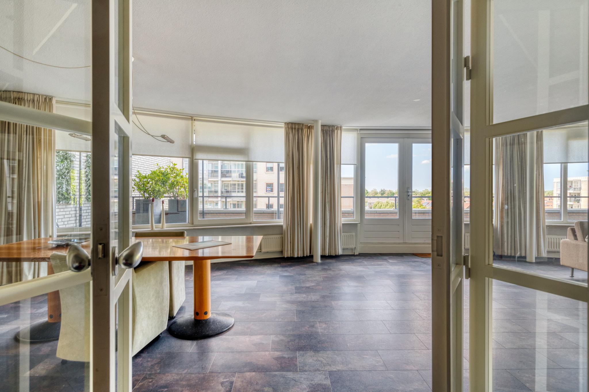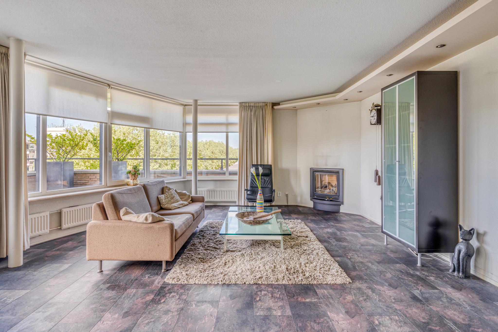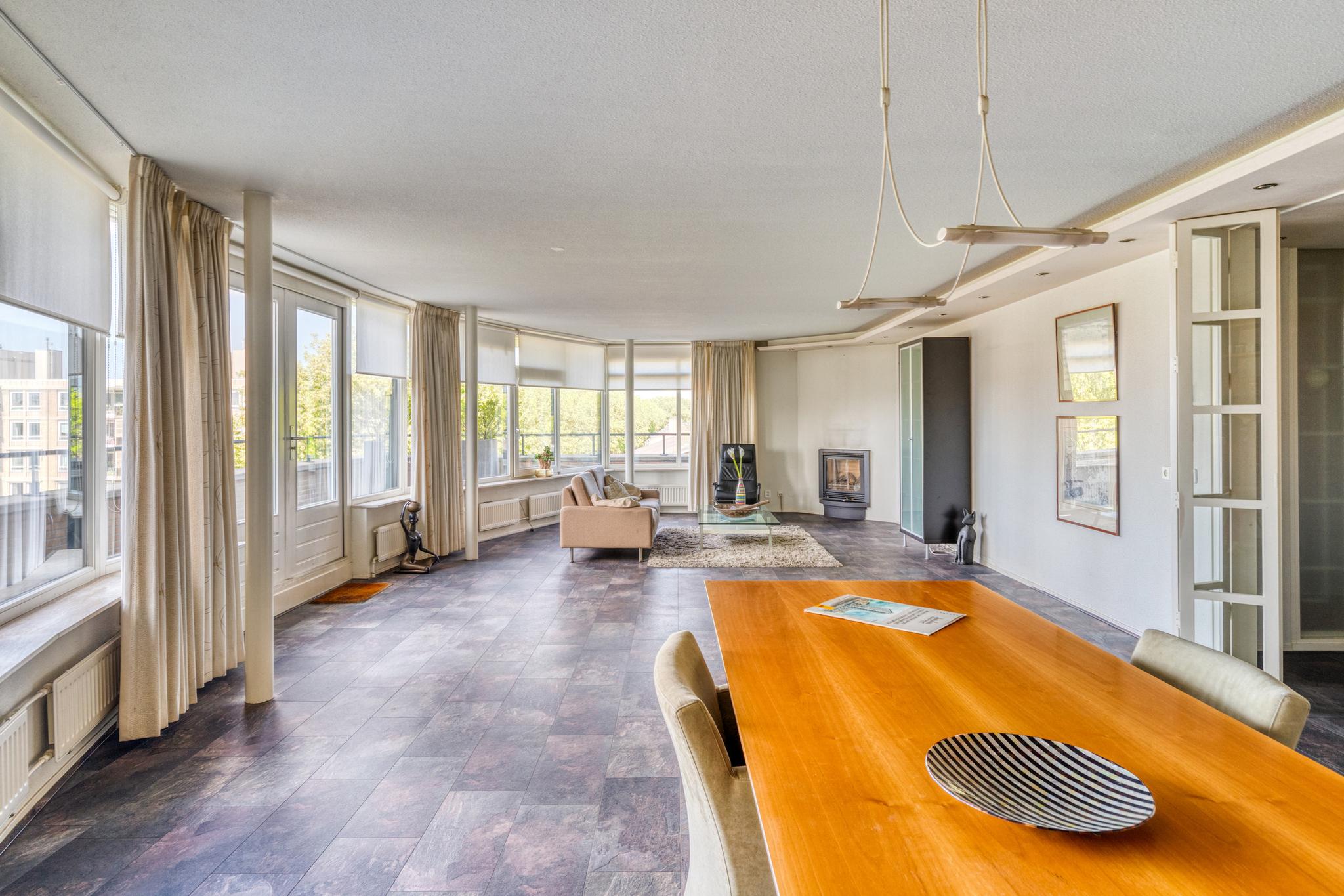 Vanuit de lift bereik je een portaal met enkel toegang tot dit penthouse en tot de eigen, ruime berging. Deze berging is eventueel om te bouwen als slaapkamer. Binnenkomst in de hal met dubbele, glazen deuren naar de riante living met een totale breedte van ruim 12 meter! De grote raampartijen met halfronde erker maken het tot een fantastisch lichte ruimte en bieden fraai en vrij uitzicht over de omgeving. Er is meer dan voldoende ruimte voor een riante zit- en eethoek. De living is afgewerkt met een gezellige gashaard en middels openslaande deuren is het dakterras bereikbaar. Het terras is gunstig gesitueerd op het zuidwesten, deels overkapt en strekt zich uit over de volle breedte van het penthouse. Het weidse uitzicht is vanaf dit niveau is erg mooi!