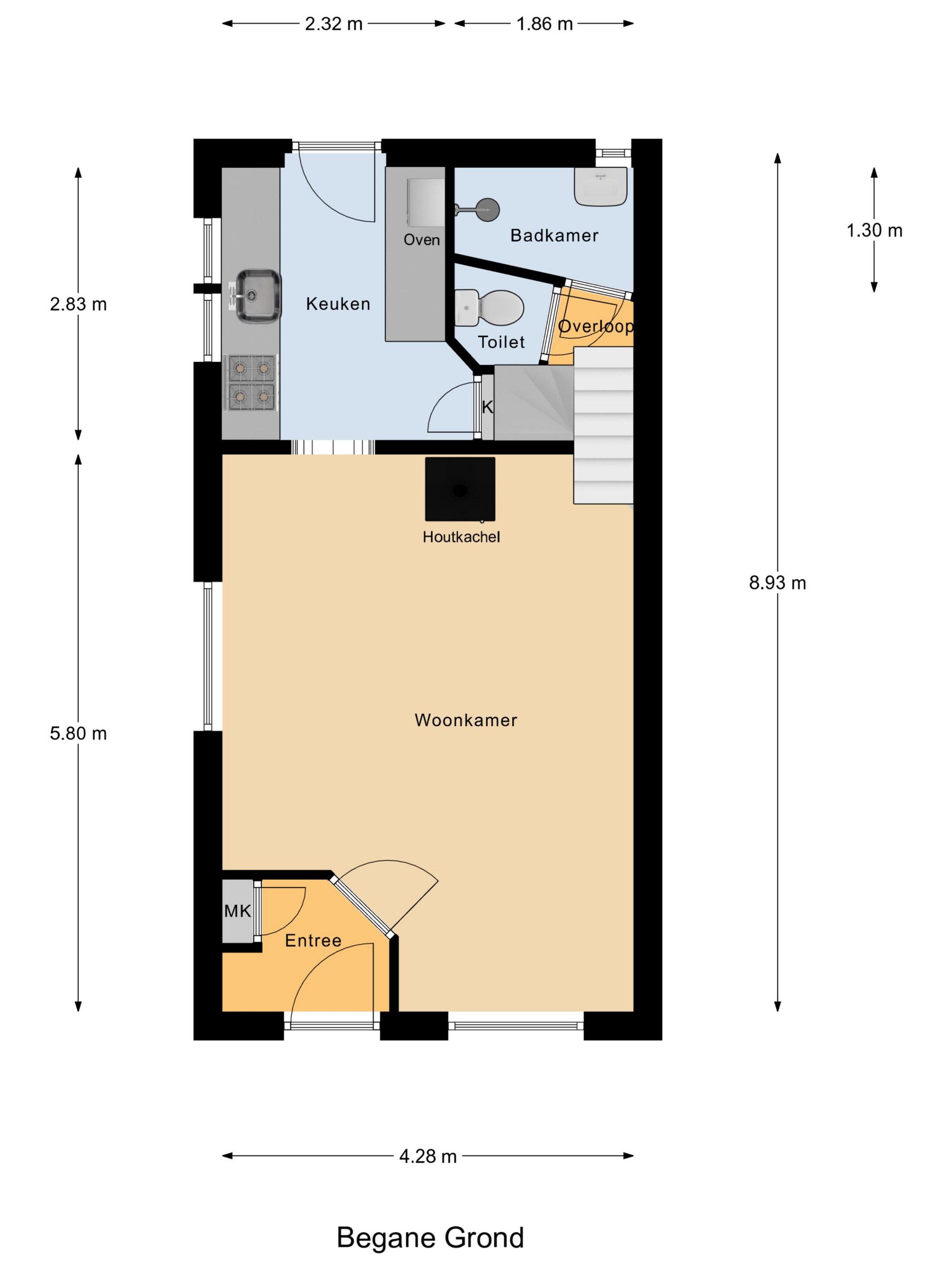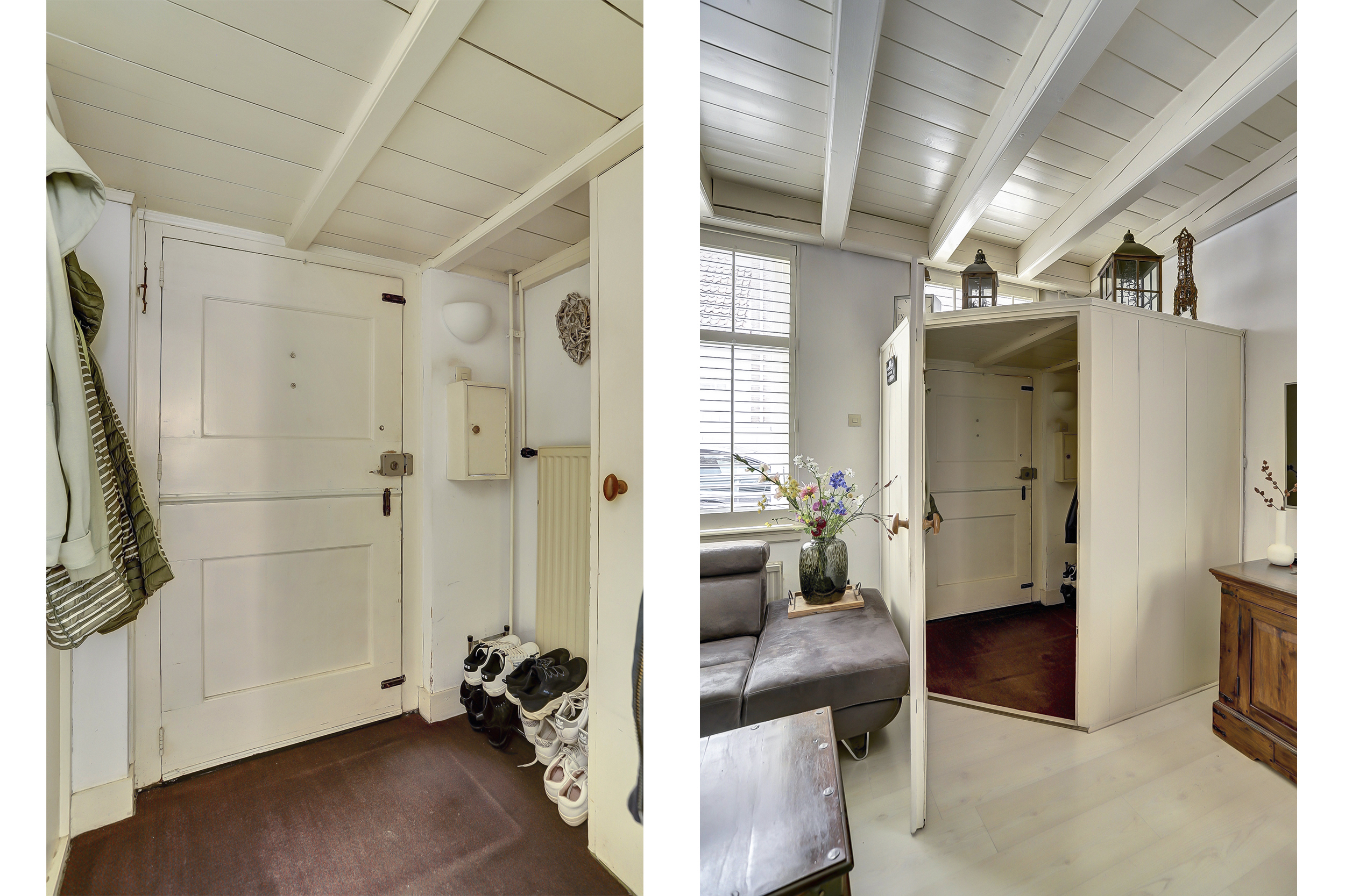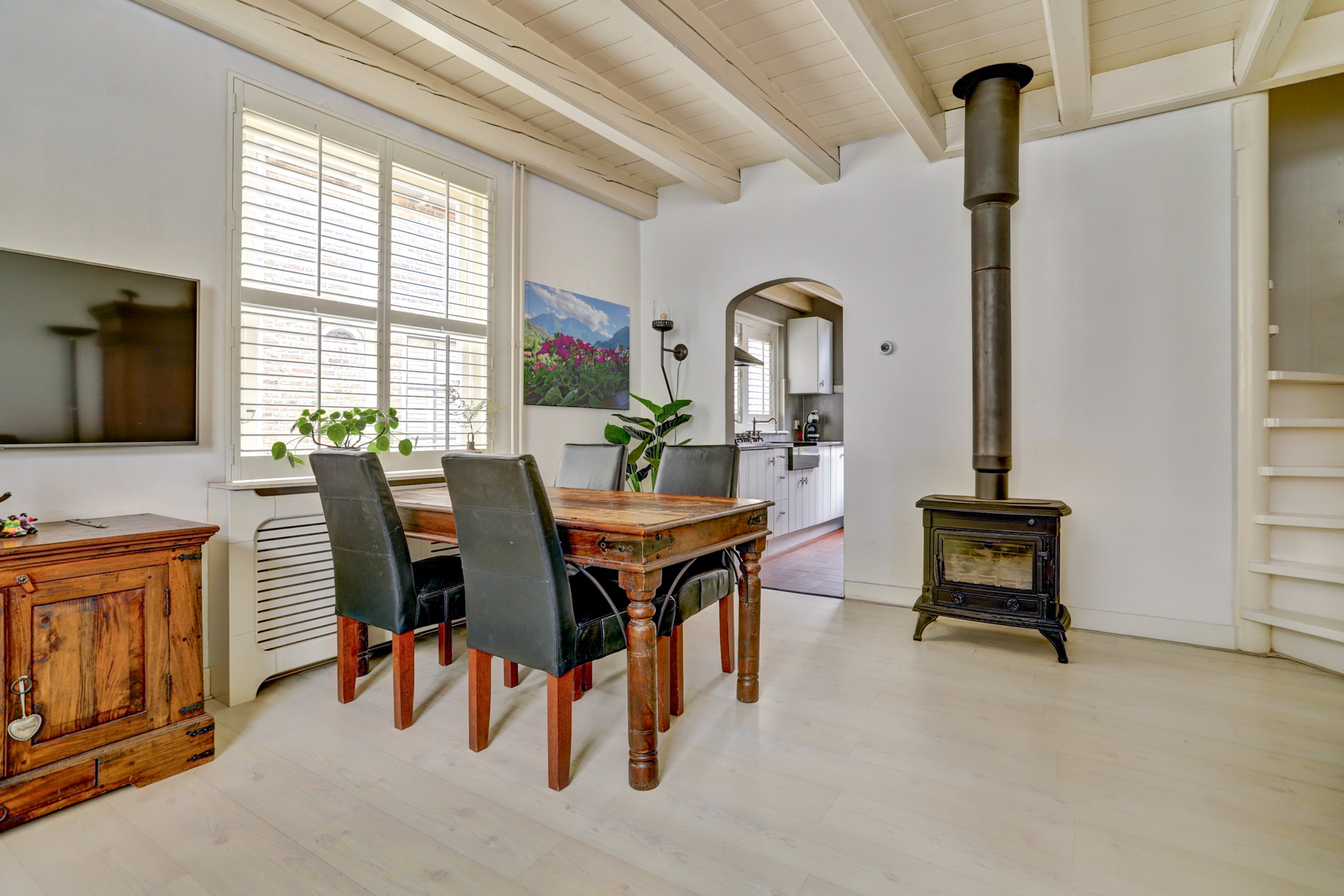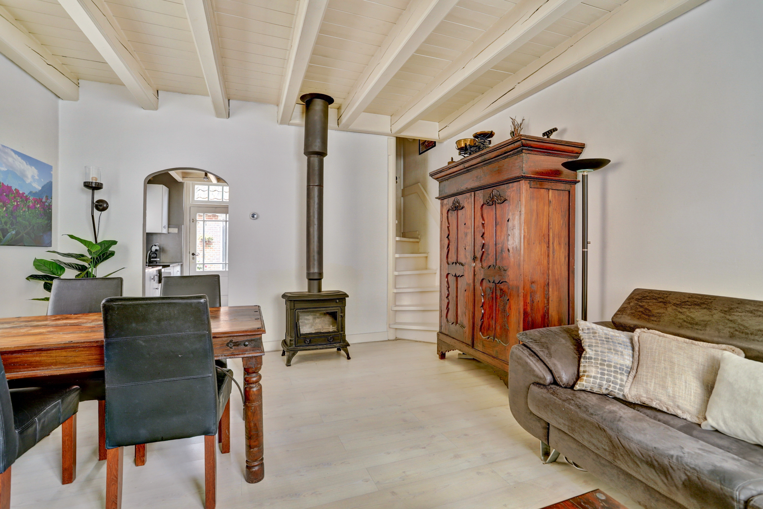 Bij binnenkomst stap je in een halletje waar de meterkast en de deur naar de woonkamer zijn. De woonkamer ademt direct warmte en gezelligheid uit: rechts een fijne zithoek met zicht op de straat, een houtkachel en een eethoek die het huis een huiselijk gevoel geeft. De lage hal, het grote raam aan de voorzijde en de speelse indeling zorgen voor veel charme en karakter.