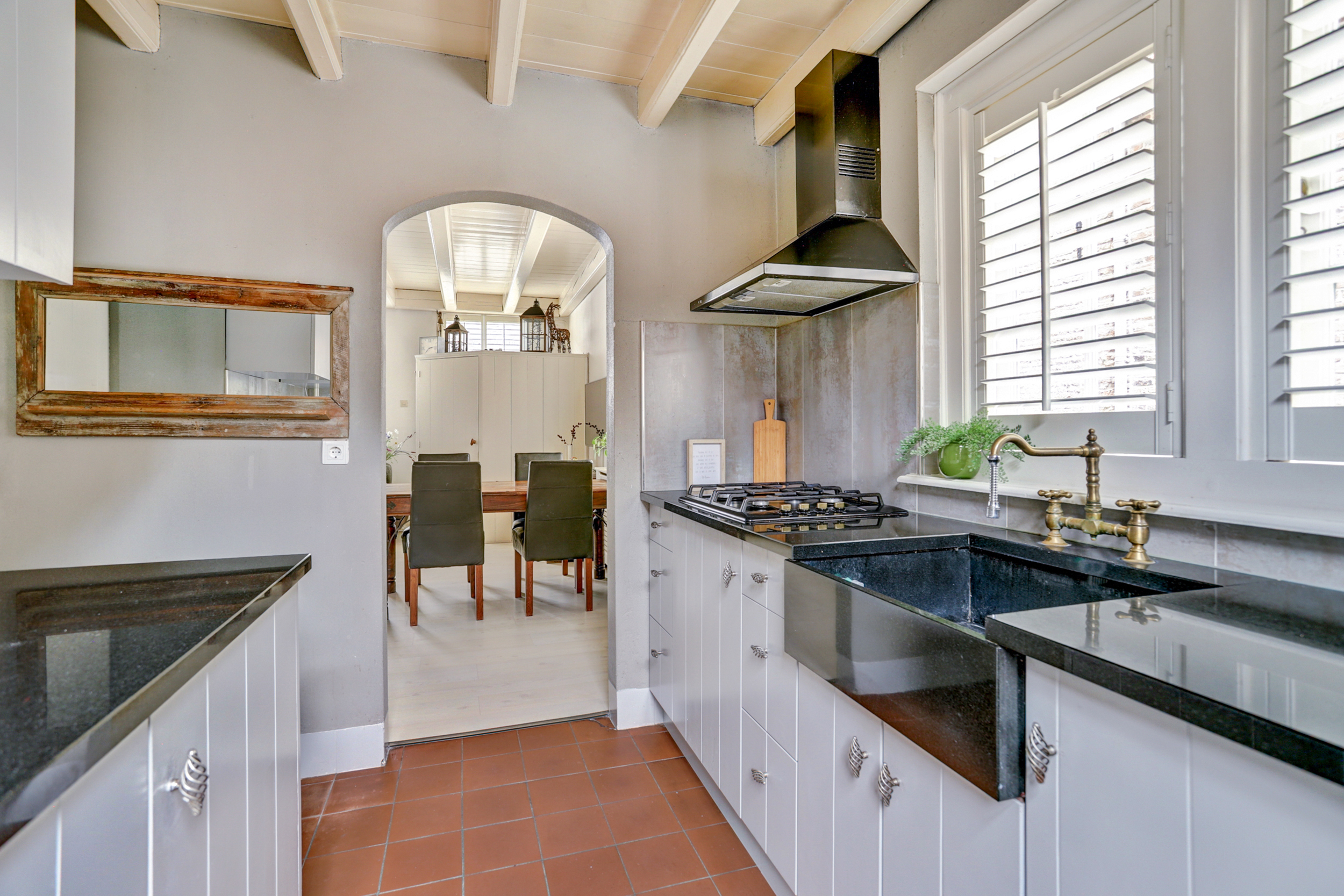 Links vanuit de woonkamer bereik je via een speelse boogmuur de landelijke keuken. Deze is voorzien van alle gemakken: inbouw-gasfornuis, afzuigkap, vaatwasser, koelkast én aansluiting voor de wasmachine. Ook is er een praktische voorraadkast aanwezig. Vanuit de keuken stap je zo de fijne achtertuin in.