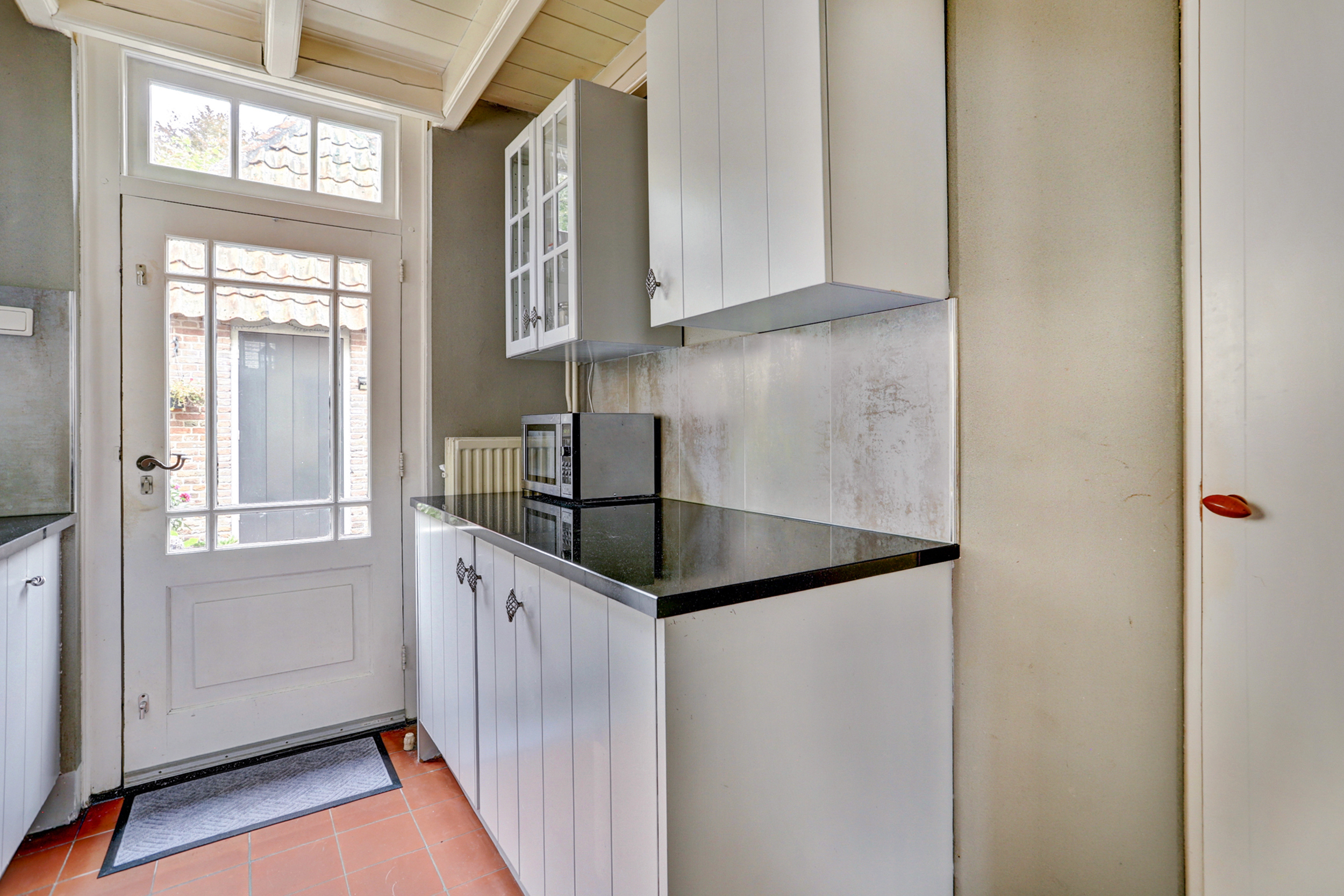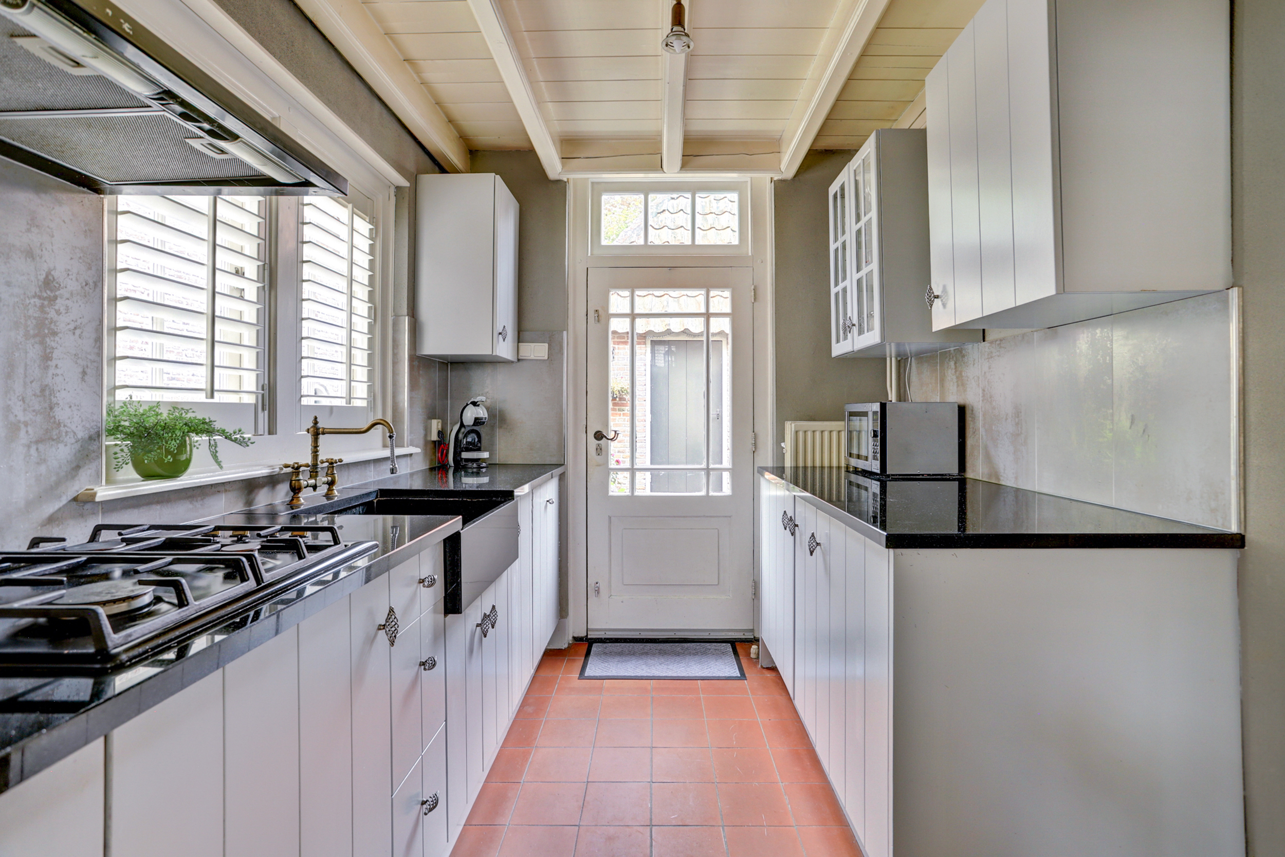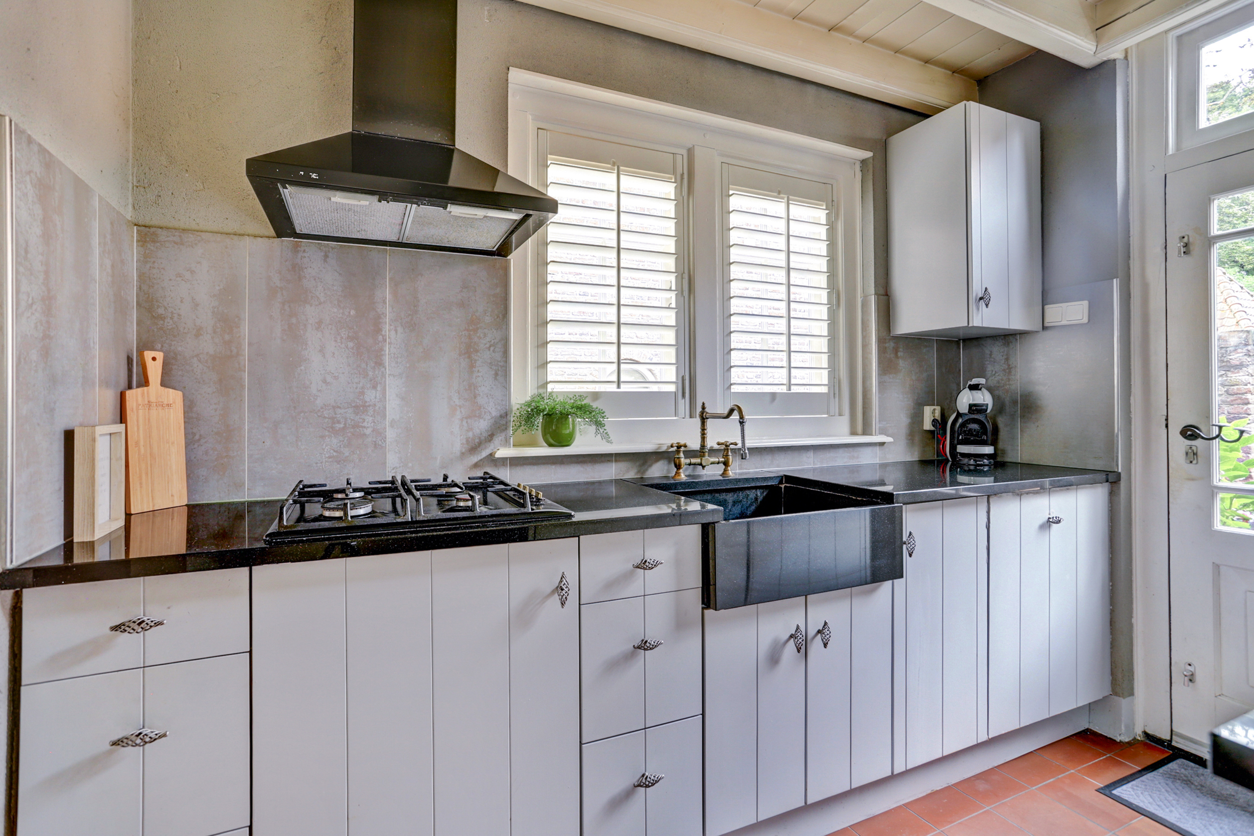 - Landelijke keuken met inbouwapparatuur en tuinuitgang;