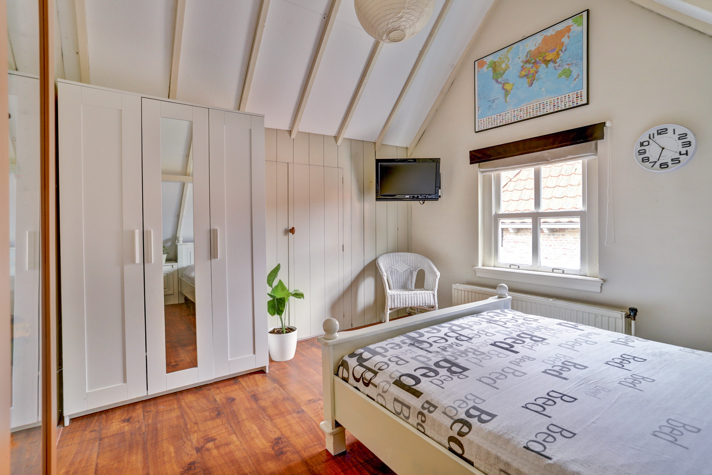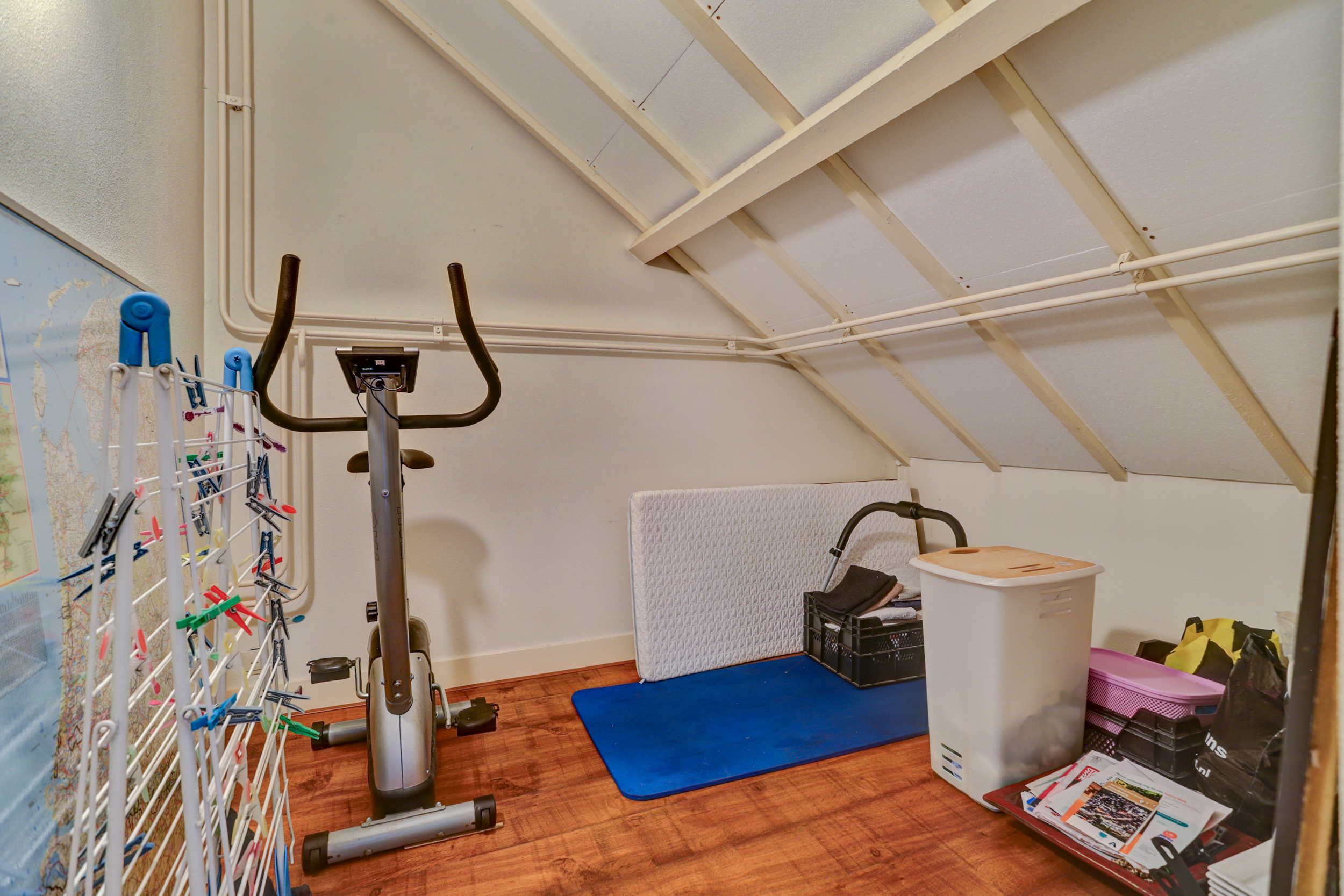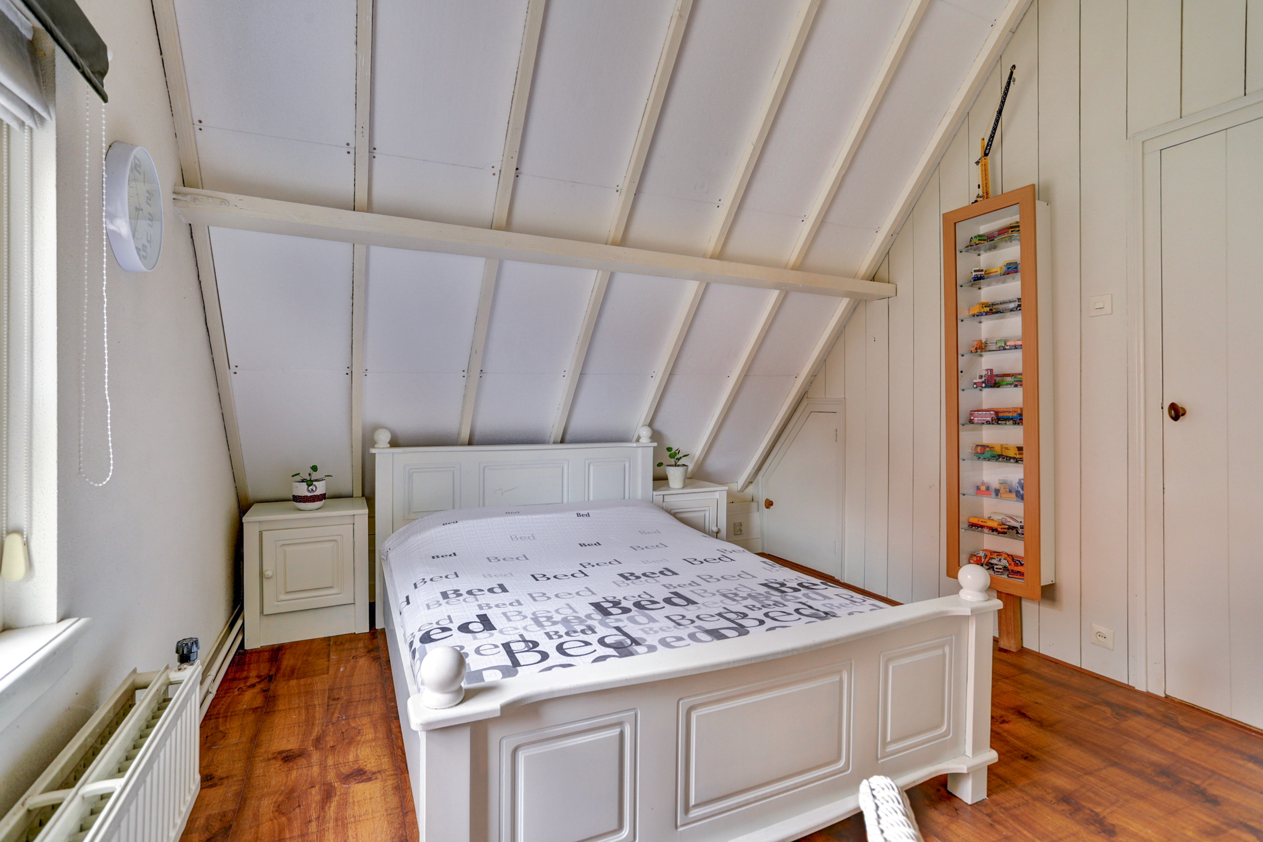 Tot slot brengt de vaste trap je naar de zolderverdieping, waar je de derde slaapkamer vindt met een indrukwekkend hoog plafond, bergruimte onder de schuine kap en genoeg plek voor nóg een ruim tweepersoonsbed. Ook de cv-installatie (2022) is hier netjes weggewerkt.