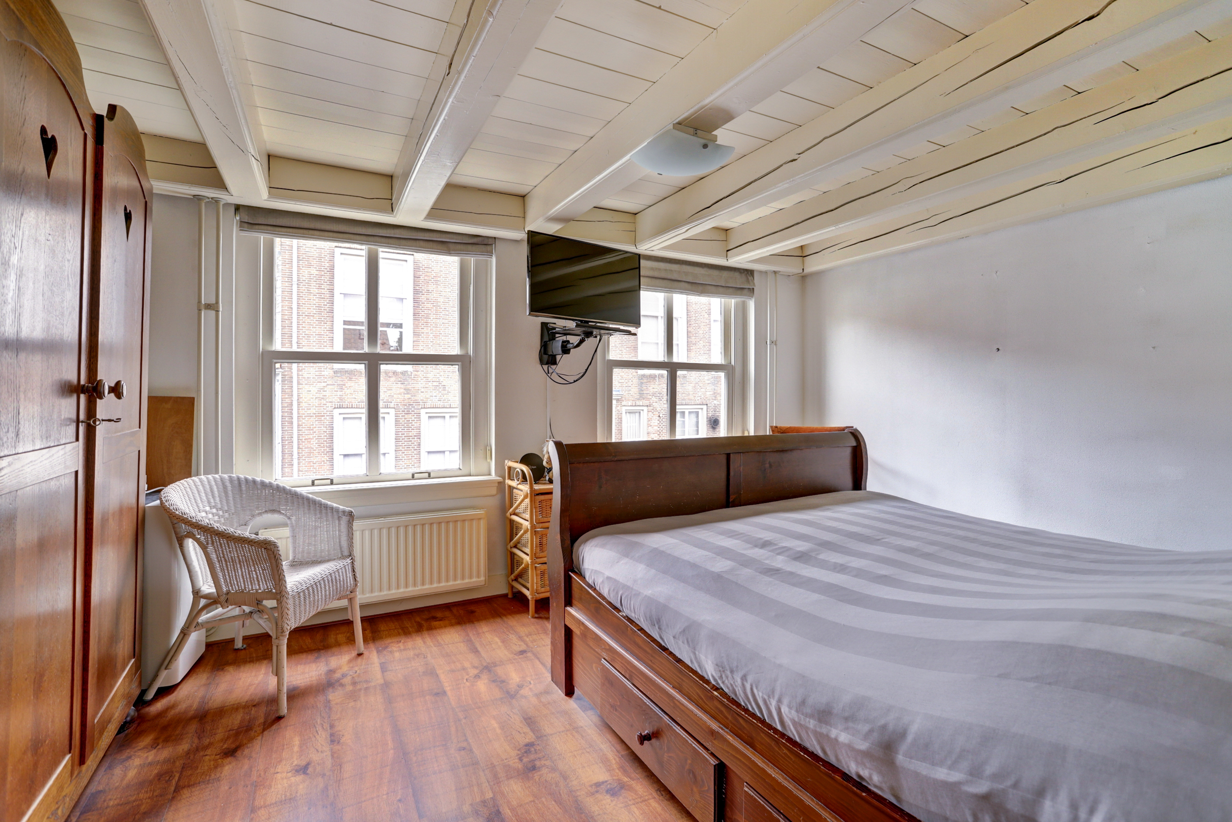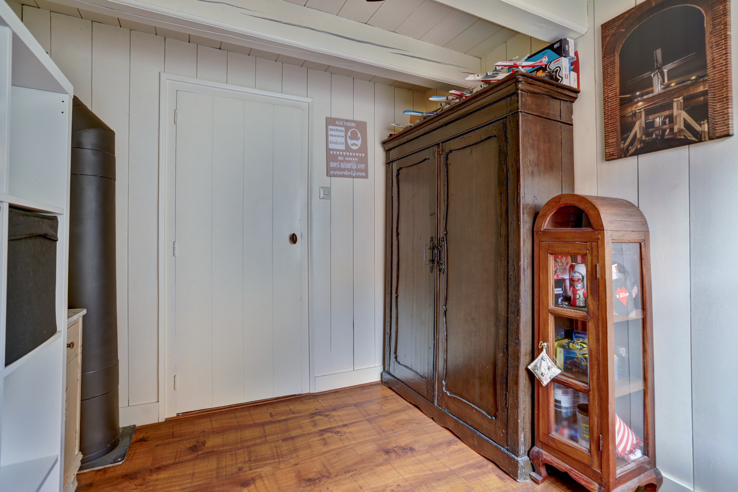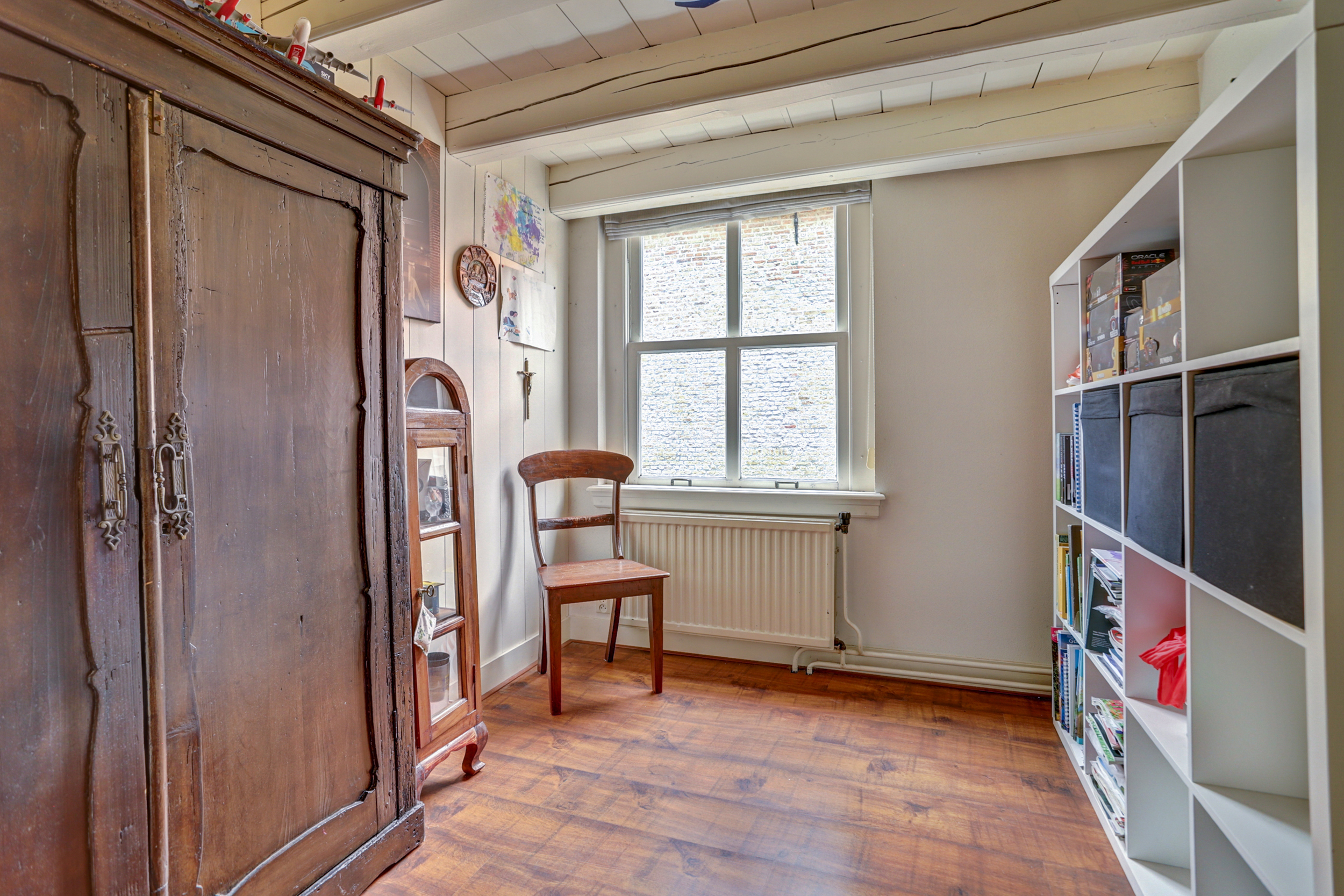 Tot slot brengt de vaste trap je naar de zolderverdieping, waar je de derde slaapkamer vindt met een indrukwekkend hoog plafond, bergruimte onder de schuine kap en genoeg plek voor nóg een ruim tweepersoonsbed. Ook de cv-installatie (2022) is hier netjes weggewerkt.