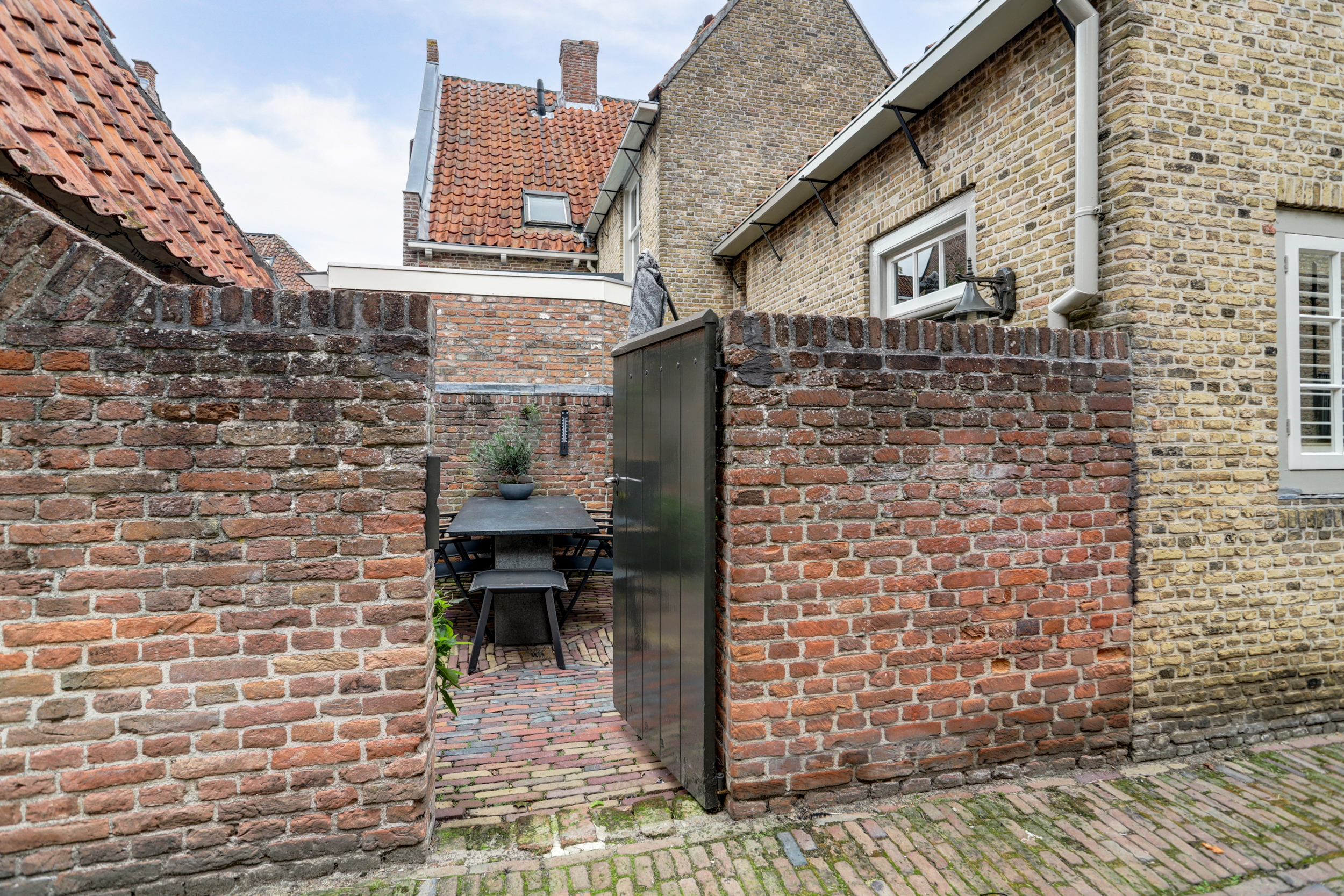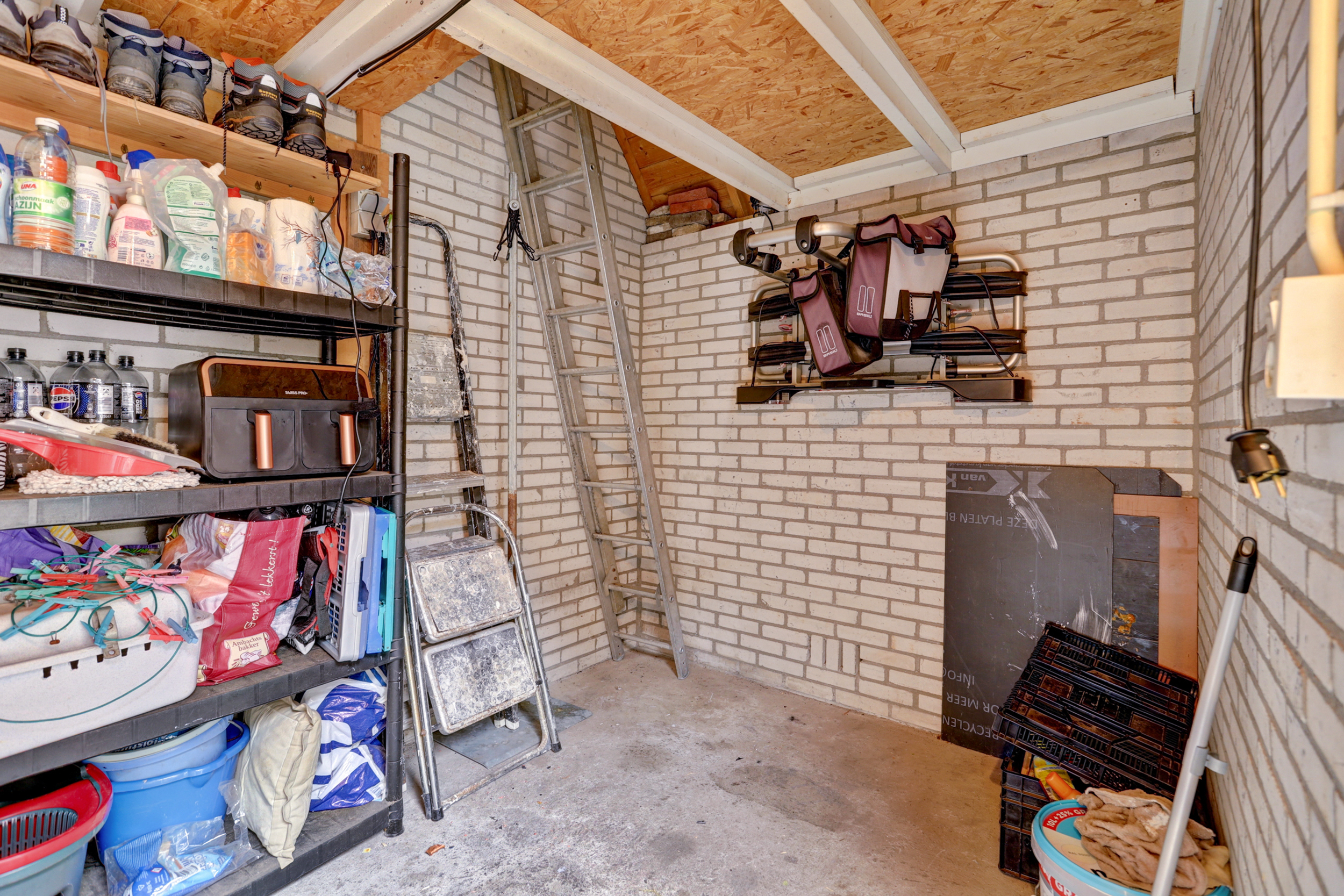 De achtertuin is een gezellige patio waar je eenvoudig een sfeervol zitgedeelte kunt creëren. Het is de ideale plek voor lange zomeravonden of om in de ochtend te genieten van een kop koffie in alle rust. Dankzij de aanwezige poort is er een praktische achterom, wat de woning extra gebruiksvriendelijk maakt. Achter in de tuin staat een ruime berging die volop mogelijkheden biedt. Je kunt hier fietsen en tuingereedschap stallen, maar ook een hobbyruimte of werkplek inrichten. Extra handig is de bergzolder boven de schuur, die zorgt voor nog meer opbergruimte. Zo is de buitenruimte niet alleen praktisch, maar sluit deze ook perfect aan bij het karakter en de charme van de woning.