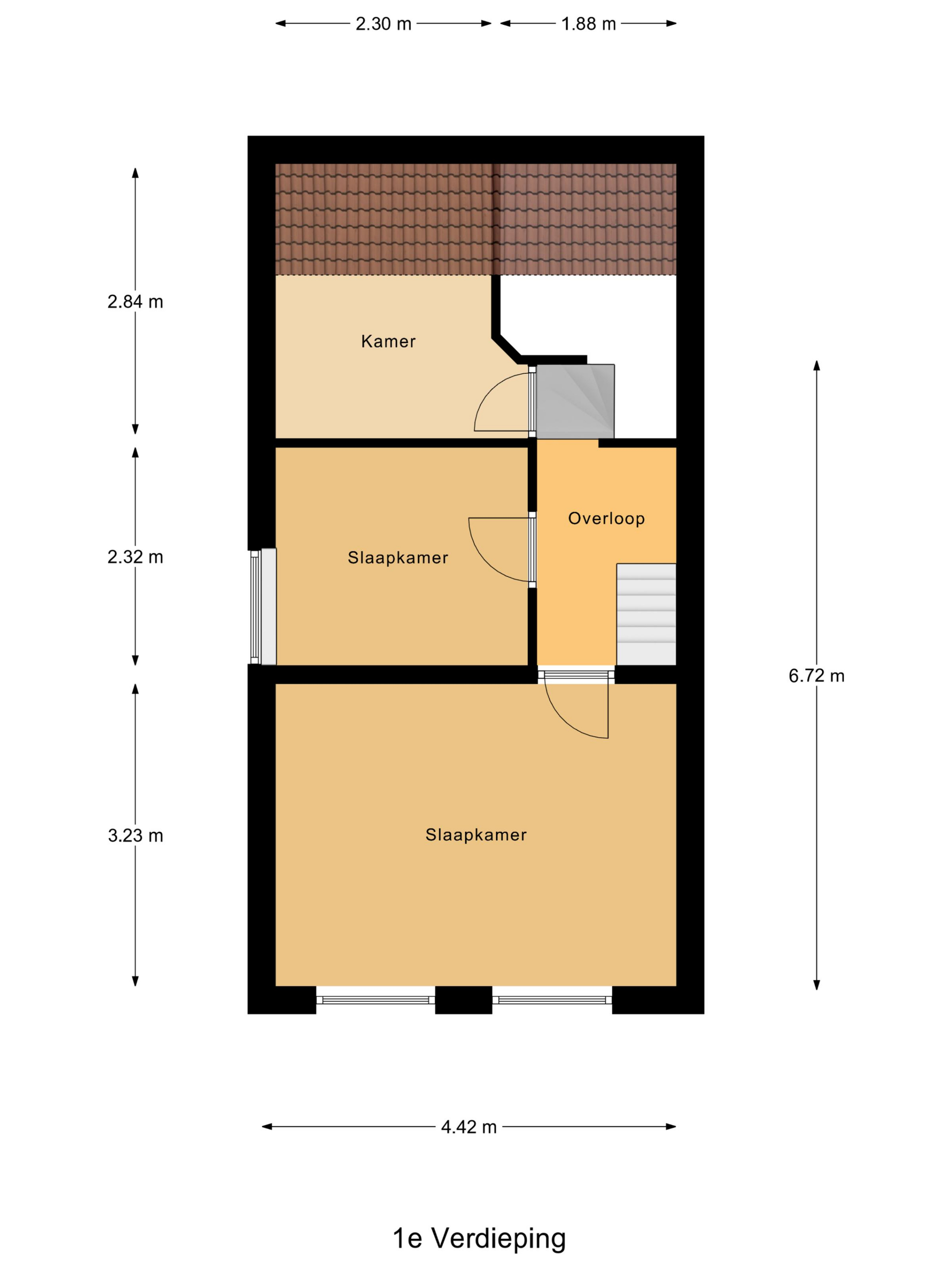 De indeling van deze woning is allesbehalve standaard. Wanneer je de trap omhoog volgt, kom je halverwege uit bij twee deuren: de eerste deur geeft toegang tot de badkamer met wastafel en douche, de tweede deur leidt naar het toilet. Loop je verder de trap op, dan bereik je een extra kamer die zich perfect leent als berging of hobbyruimte. Nog een niveau hoger bevindt zich de eerste slaapkamer, terwijl je rechtdoor doorloopt naar de ruime hoofdslaapkamer aan de voorzijde. Hier is voldoende plek voor een tweepersoonsbed, en dankzij de grote raampartijen geniet je van veel lichtinval en uitzicht. Vanuit de overloop loop je langs de tweede slaapkamer, die ideaal te gebruiken is als kinderkamer, werkkamer of kledingkamer.