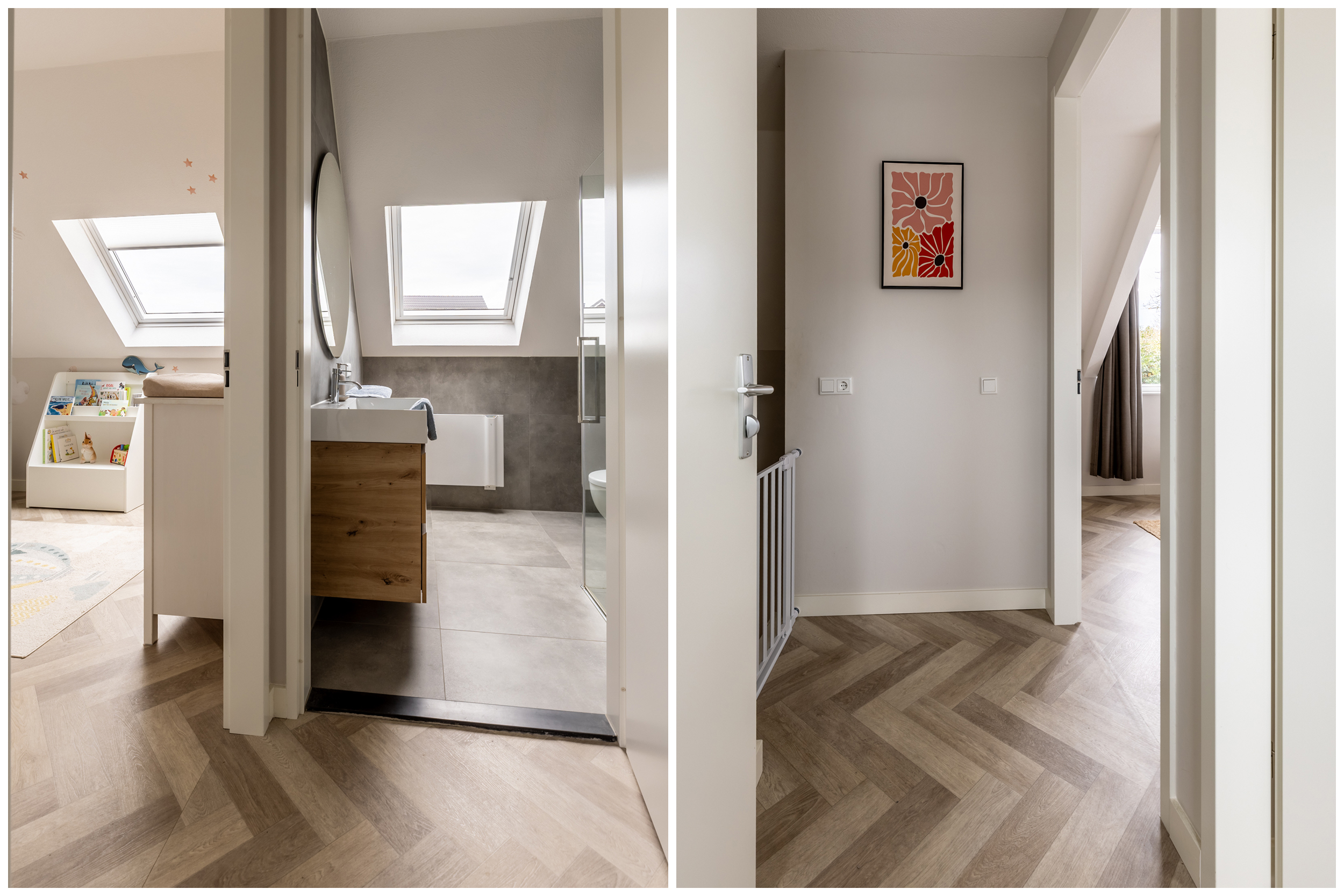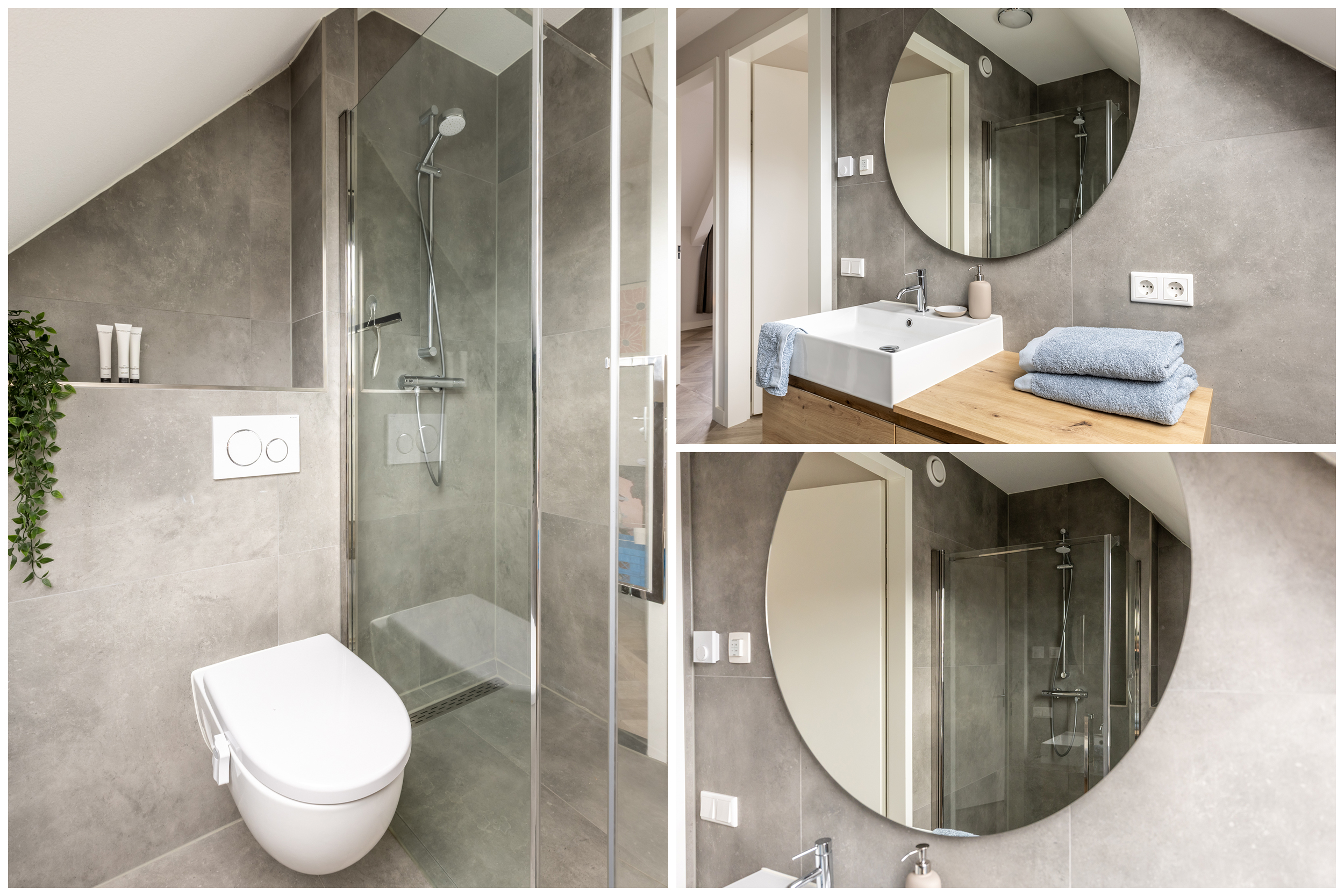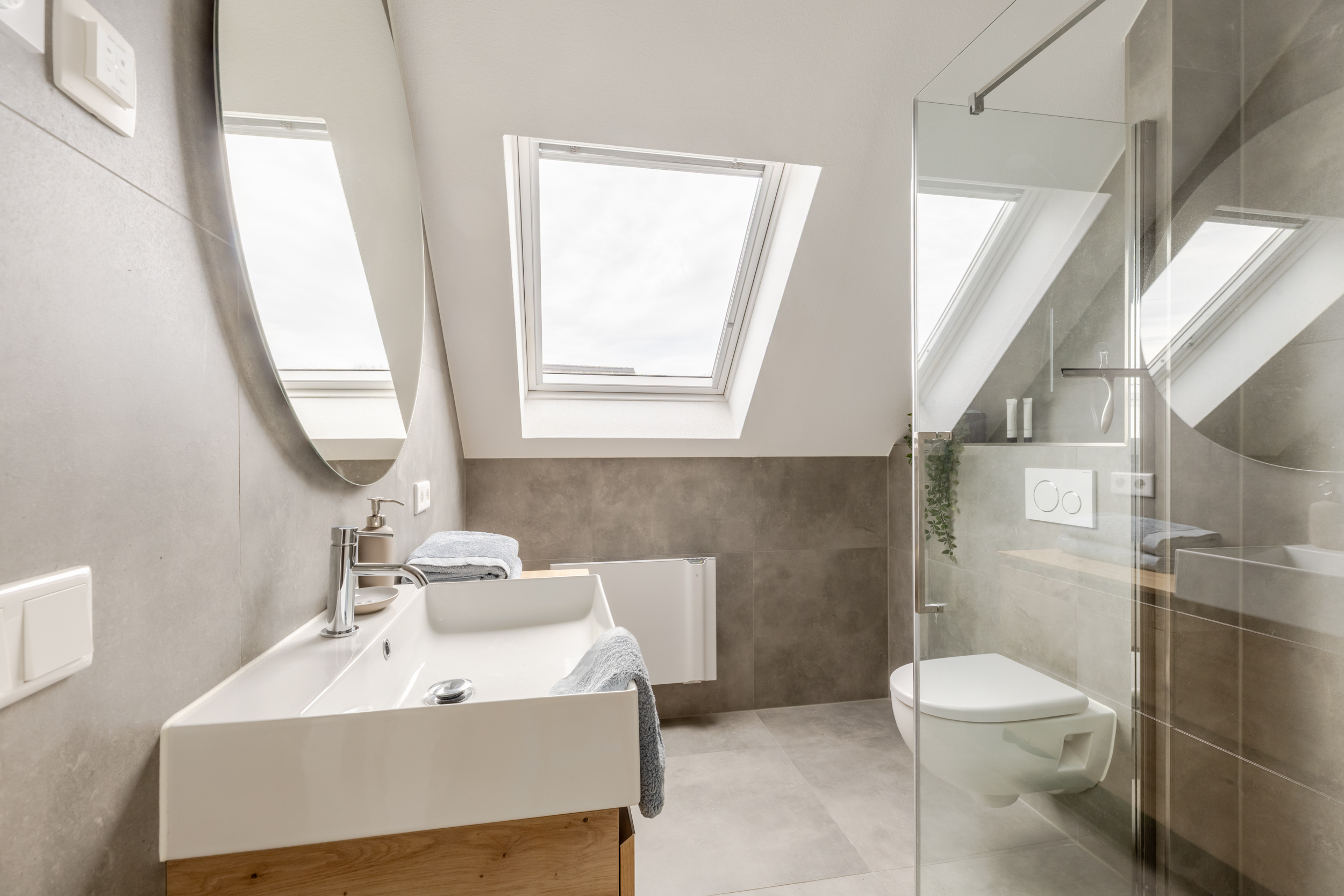 De tweede badkamer is uitgevoerd in moderne grijs- en aardetinten. De combinatie van de betonlook tegels, het houten badkamermeubel en de strakke, ronde spiegel vormt een stijlvol geheel. Dankzij het grote dakraam valt er veel natuurlijk licht naar binnen en voelt de badkamer ruim en fris aan. De hoogwaardige afwerking past perfect bij de rest van de woning.