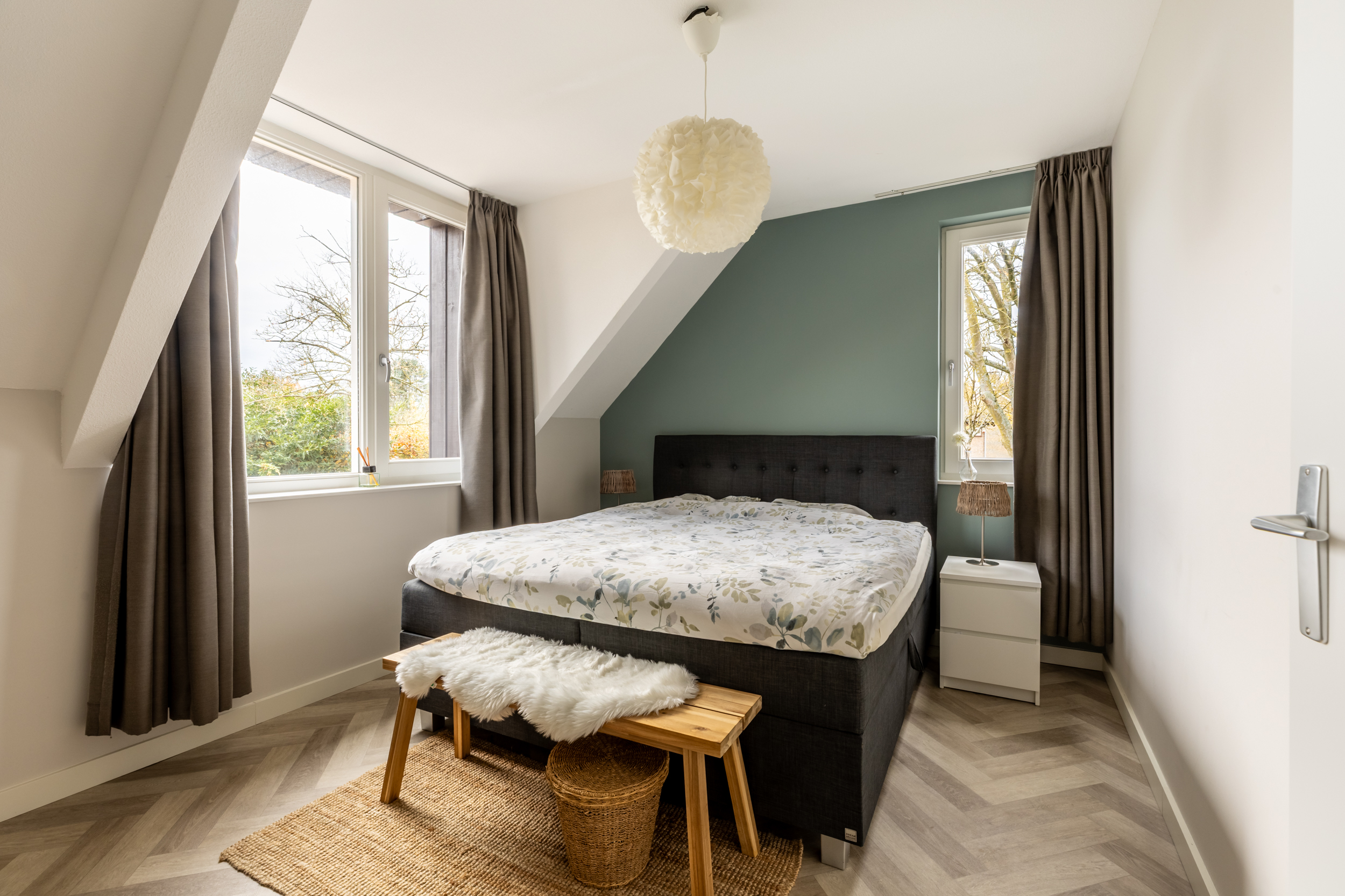 Aan de achterzijde ligt de royale hoofdslaapkamer. De grote dakkapel zorgt voor extra ruimte en lichtinval. De vloer bestaat uit een stijlvol houtlook visgraat vinyl, dat doorloopt over de gehele verdieping.