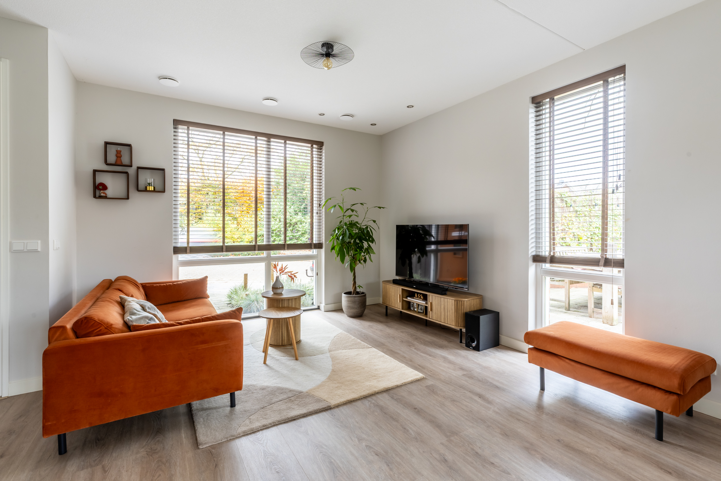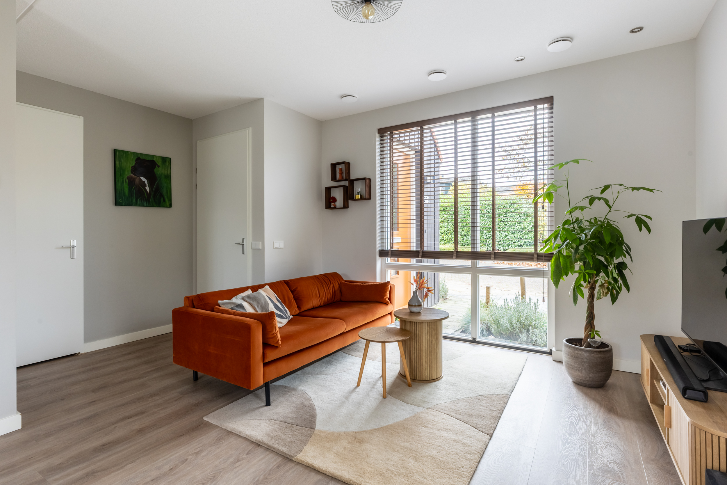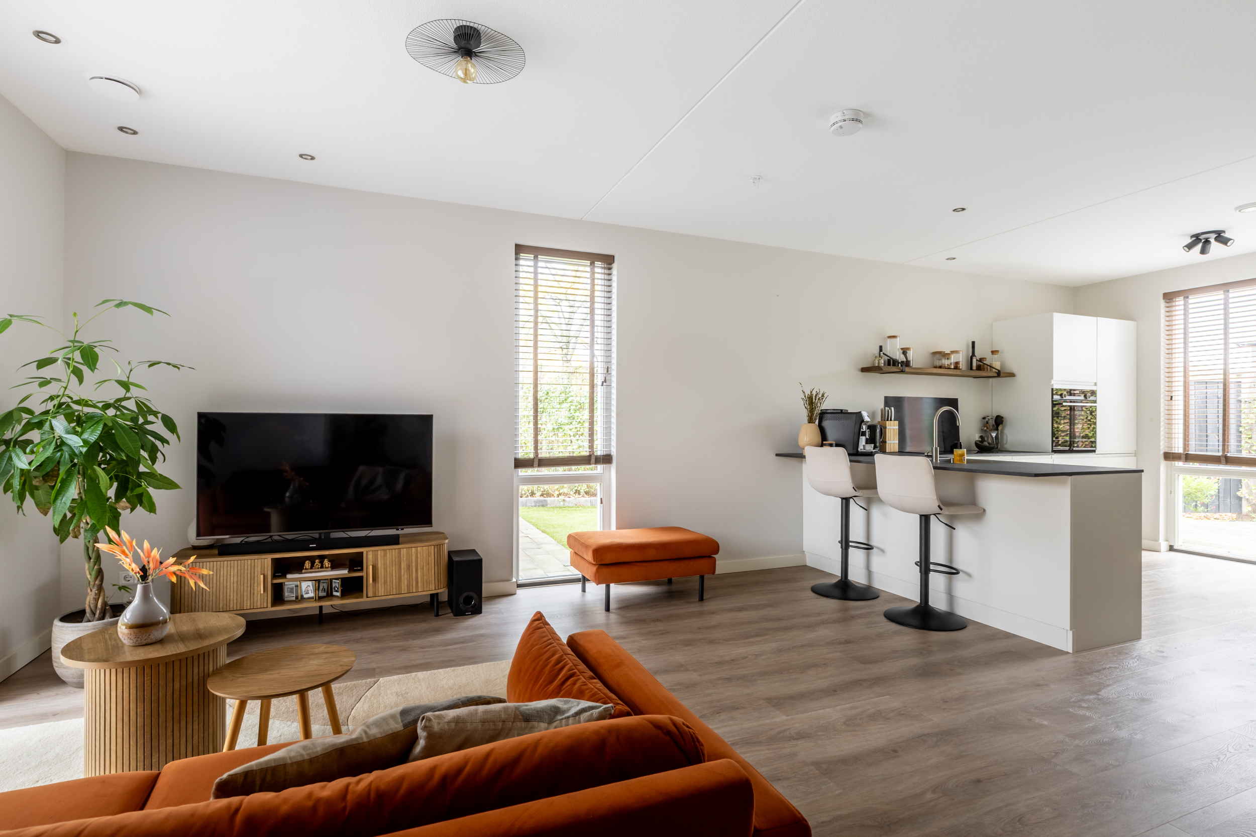 De ruime woonkamer is aan de voorzijde gelegen en tuingericht en staat in open verbinding met de keuken. Dankzij de grote ramen en de lichte vloer voelt de ruimte modern en sfeervol aan. De hoekligging zorgt voor extra privacy en licht. De gehele begane grondvloer is voorzien van comfortabele vloerverwarming (die zowel koelt als verwarmd).