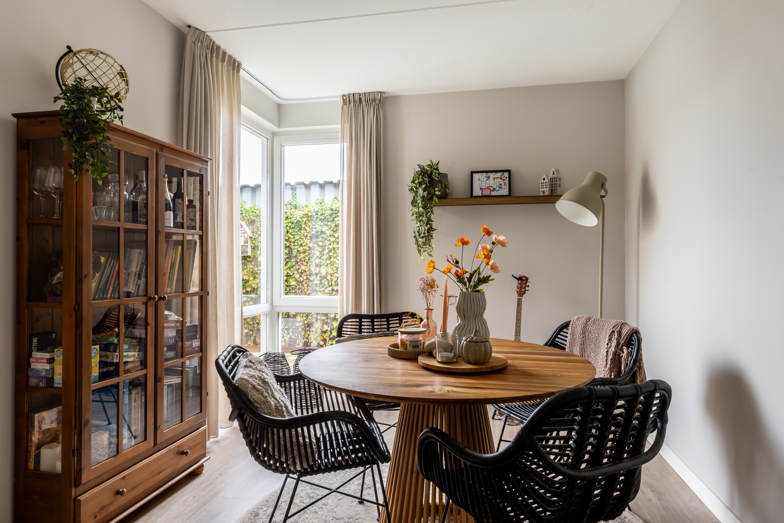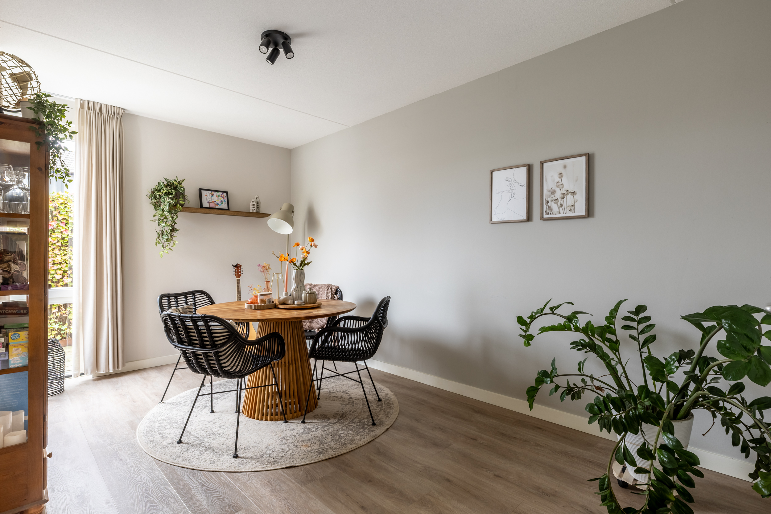 Aangrenzend aan de eetkeuken bevindt zich een multifunctionele kamer die nu stijlvol is ingericht als eetkamer. De ruimte voelt warm en huiselijk aan en biedt voldoende plek voor een grote eettafel. Door de ligging naast de woonkamer en dichtbij de keuken is dit een heerlijke plek om te tafelen, maar de kamer kan desgewenst altijd weer als slaapkamer of kantoorruimte worden gebruikt.