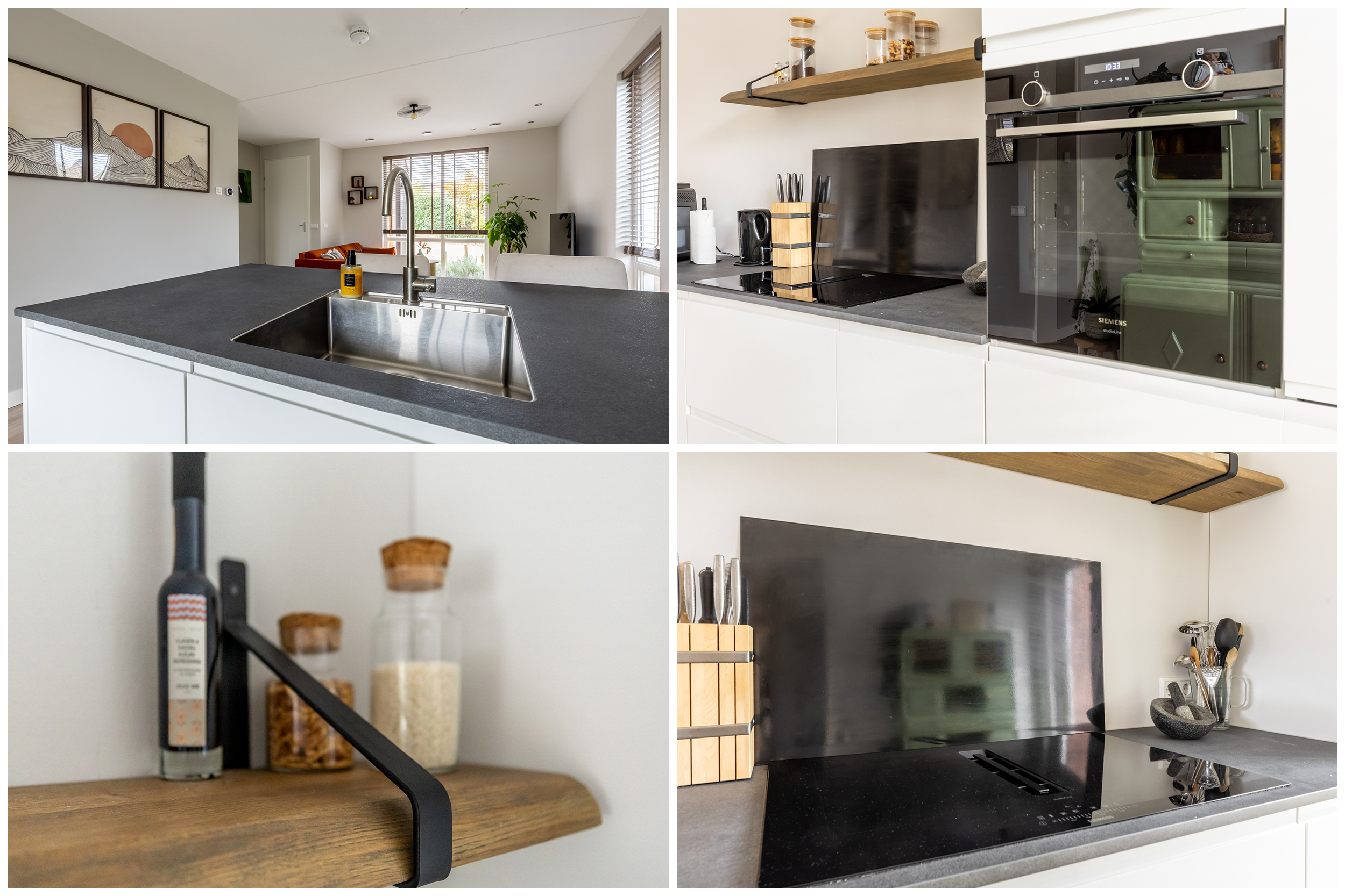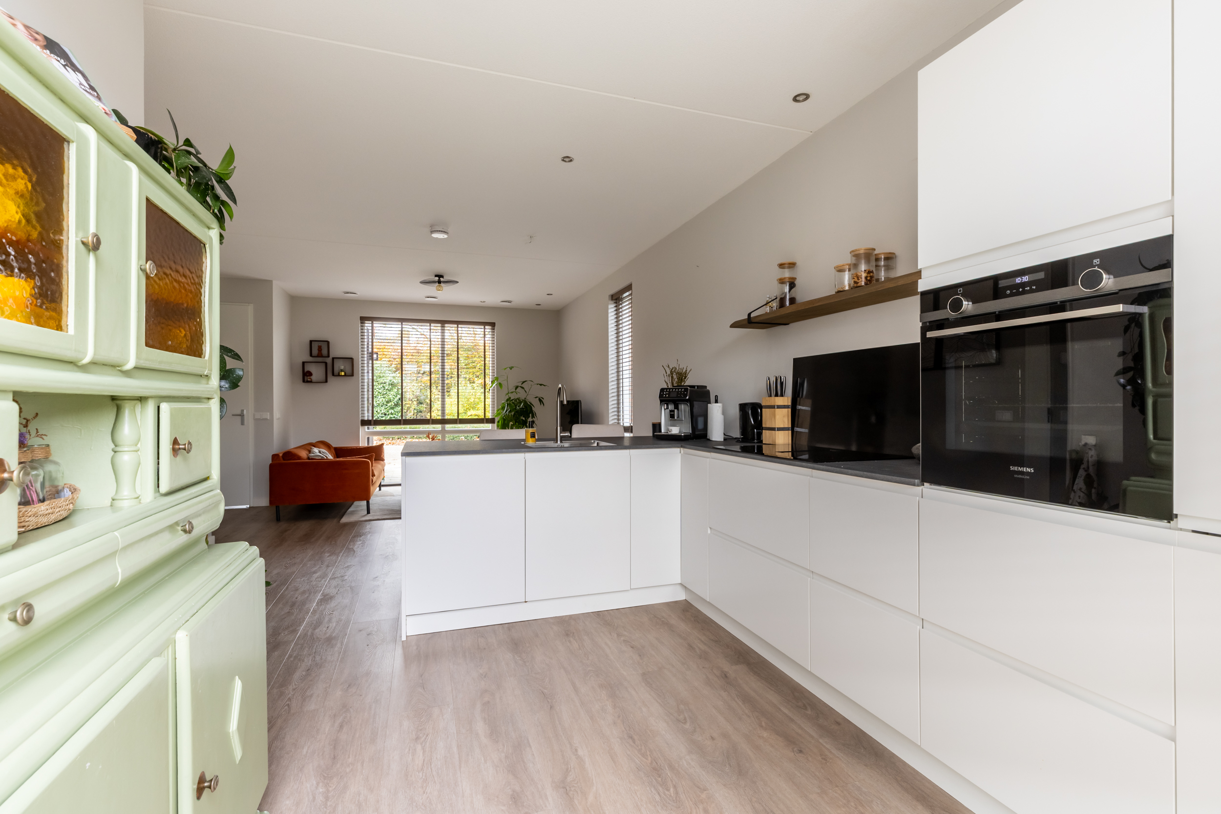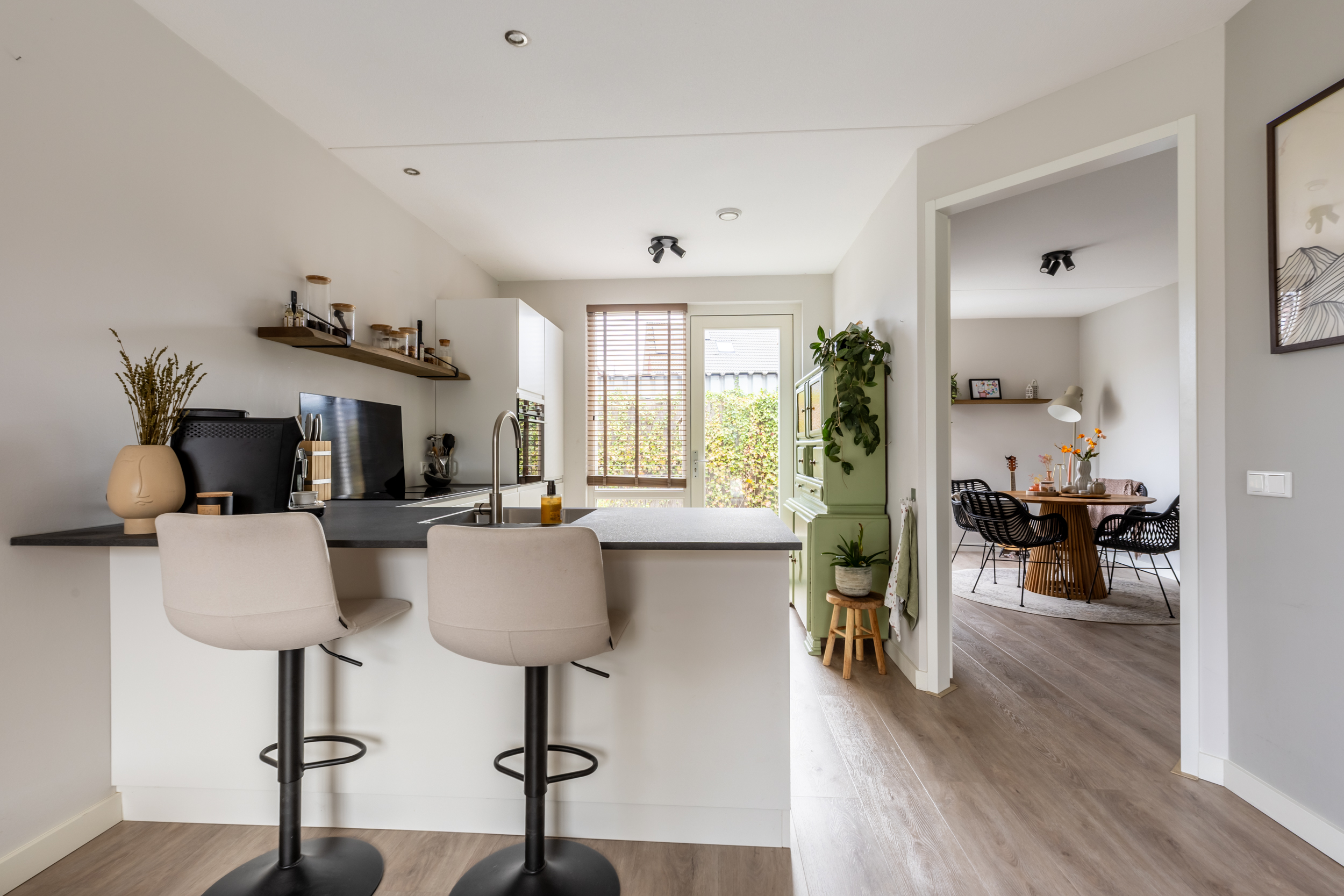 De moderne keuken ligt aan de achterzijde van de woning en is voorzien van ruime werkbladen, een luxe oven, inductiekookplaat en voldoende kastruimte. Een fijne toevoeging is het gezellige bar aan de keuken. Het barretje maakt de keuken extra functioneel én uitnodigend.