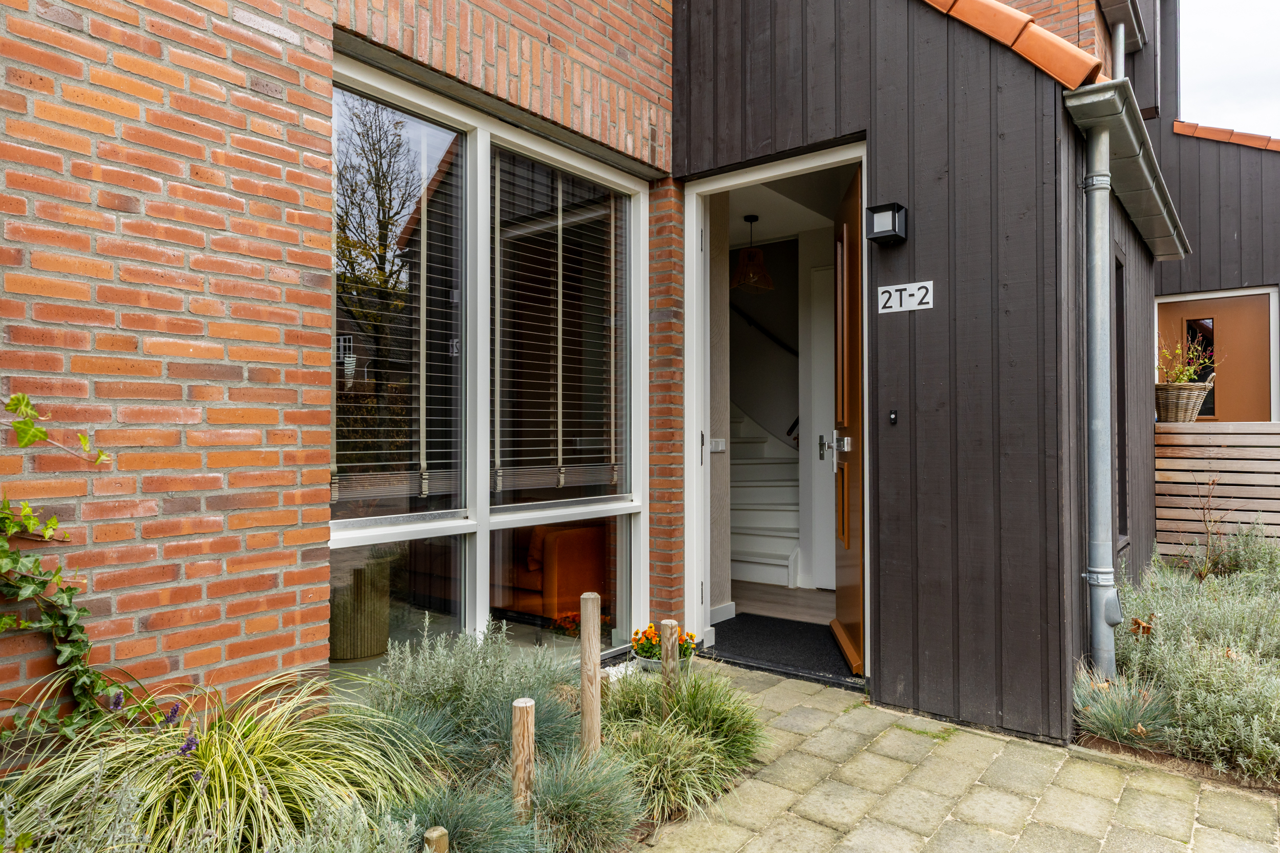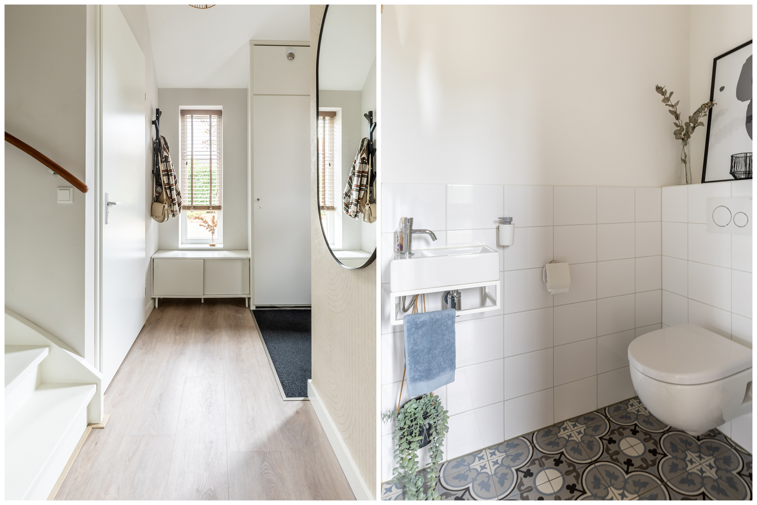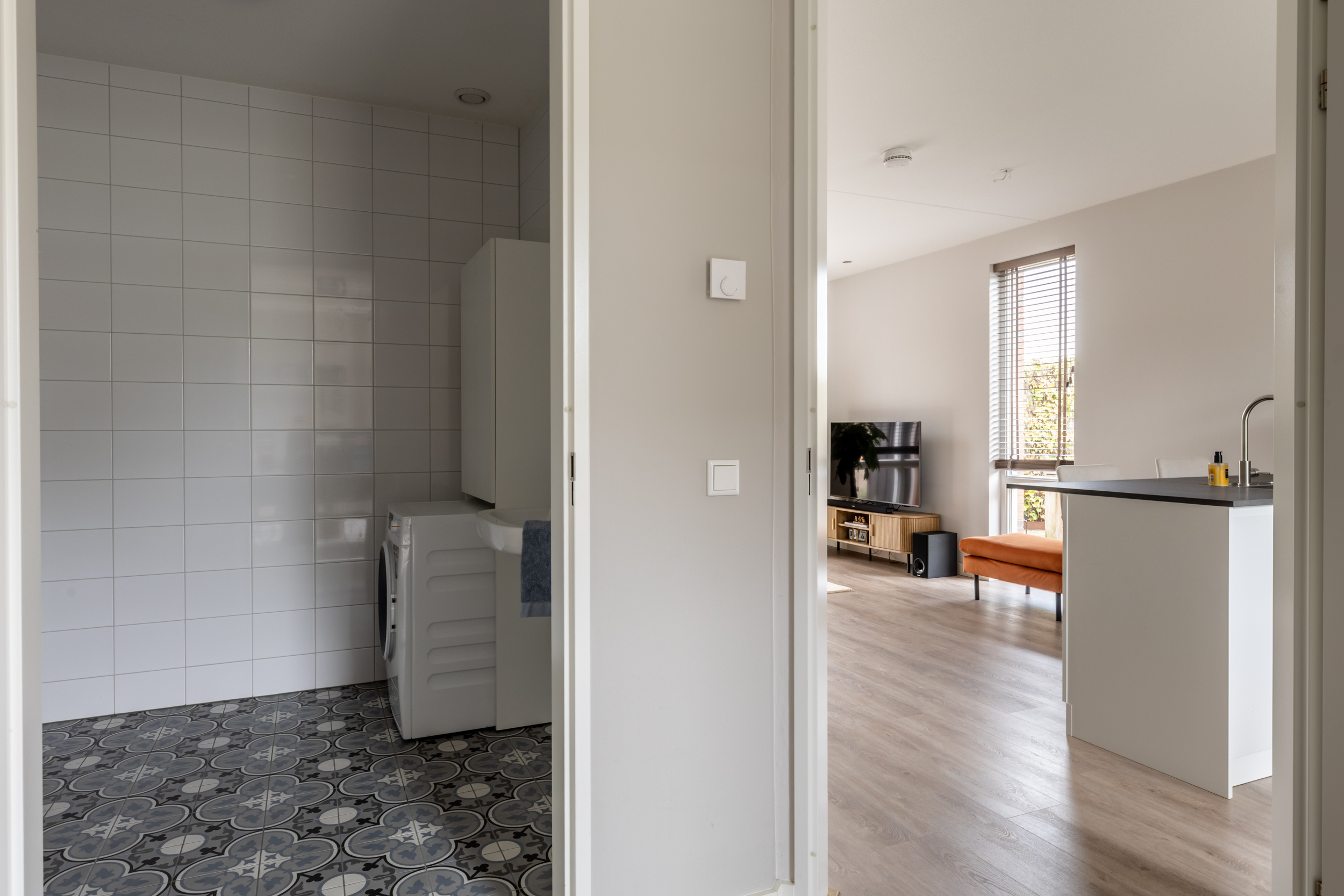 Via de voordeur kom je binnen in de lichte entreehal. Hier vind je ruimte voor de garderobe, toegang tot het toilet en de trapopgang naar boven. De strakke afwerking en rustige kleuren creëren direct een warm welkom. Vanuit de hal is er toegang tot de woonkamer.