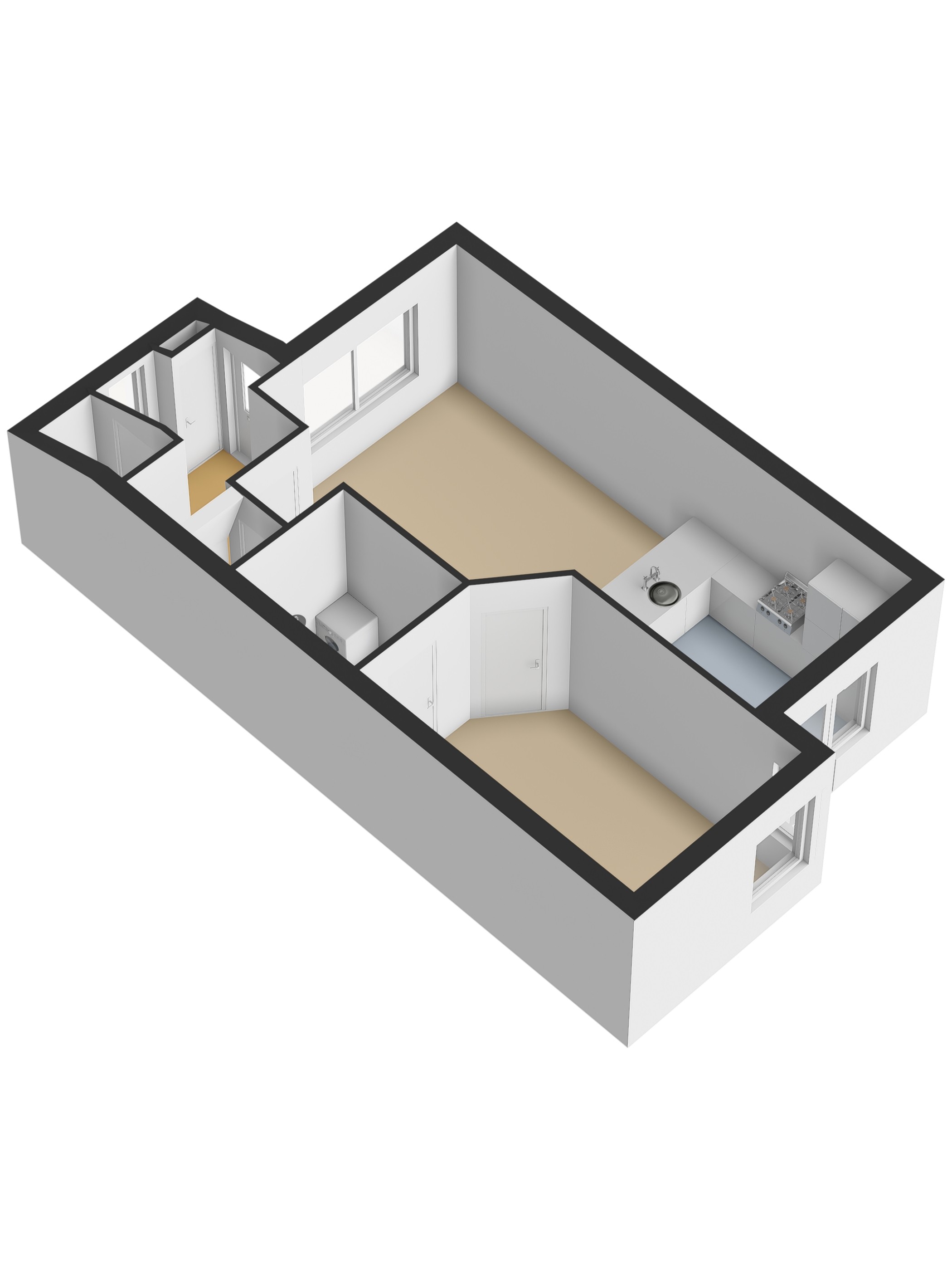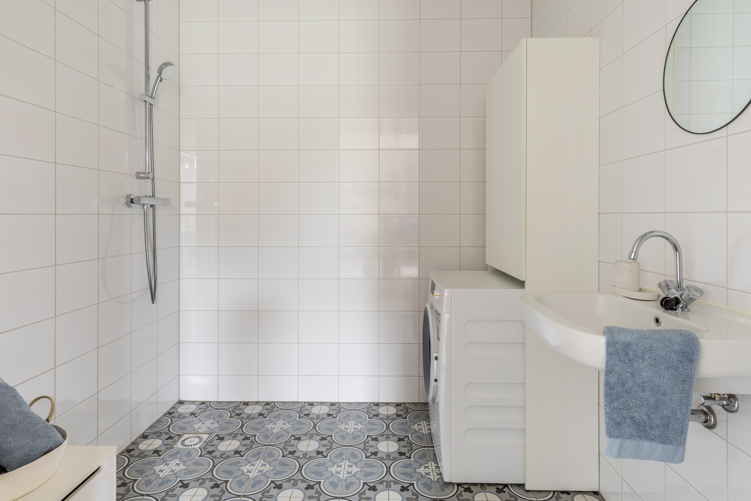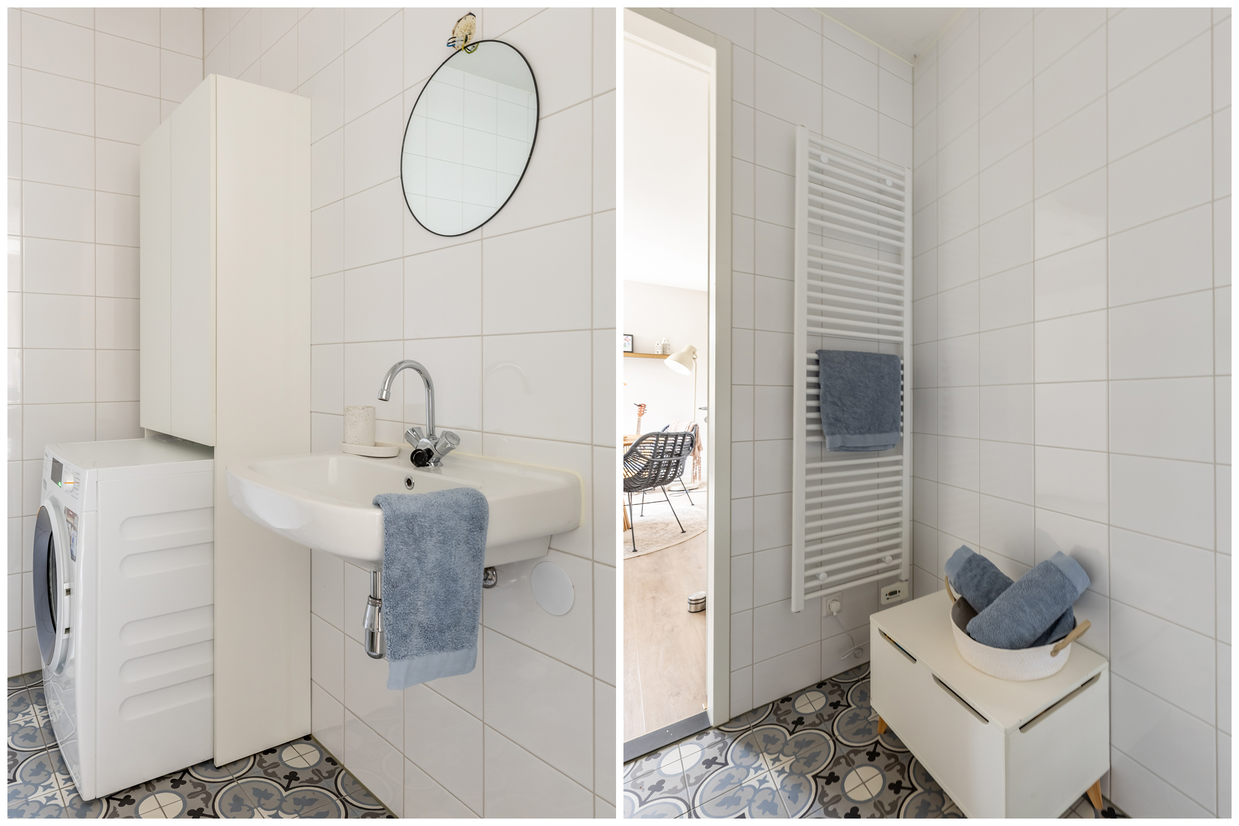 - Douche, wastafel, wasmachineaansluiting, toilet en wastafelmeubel