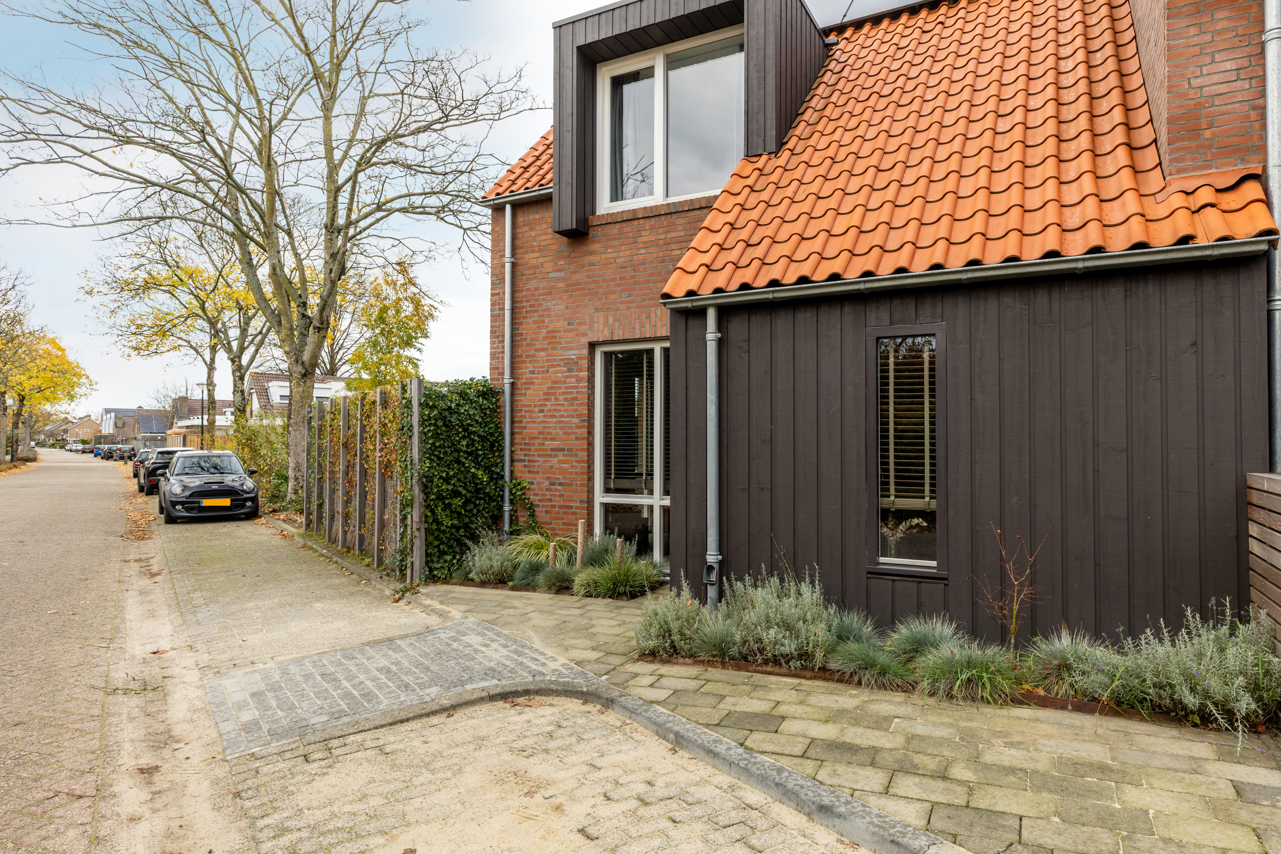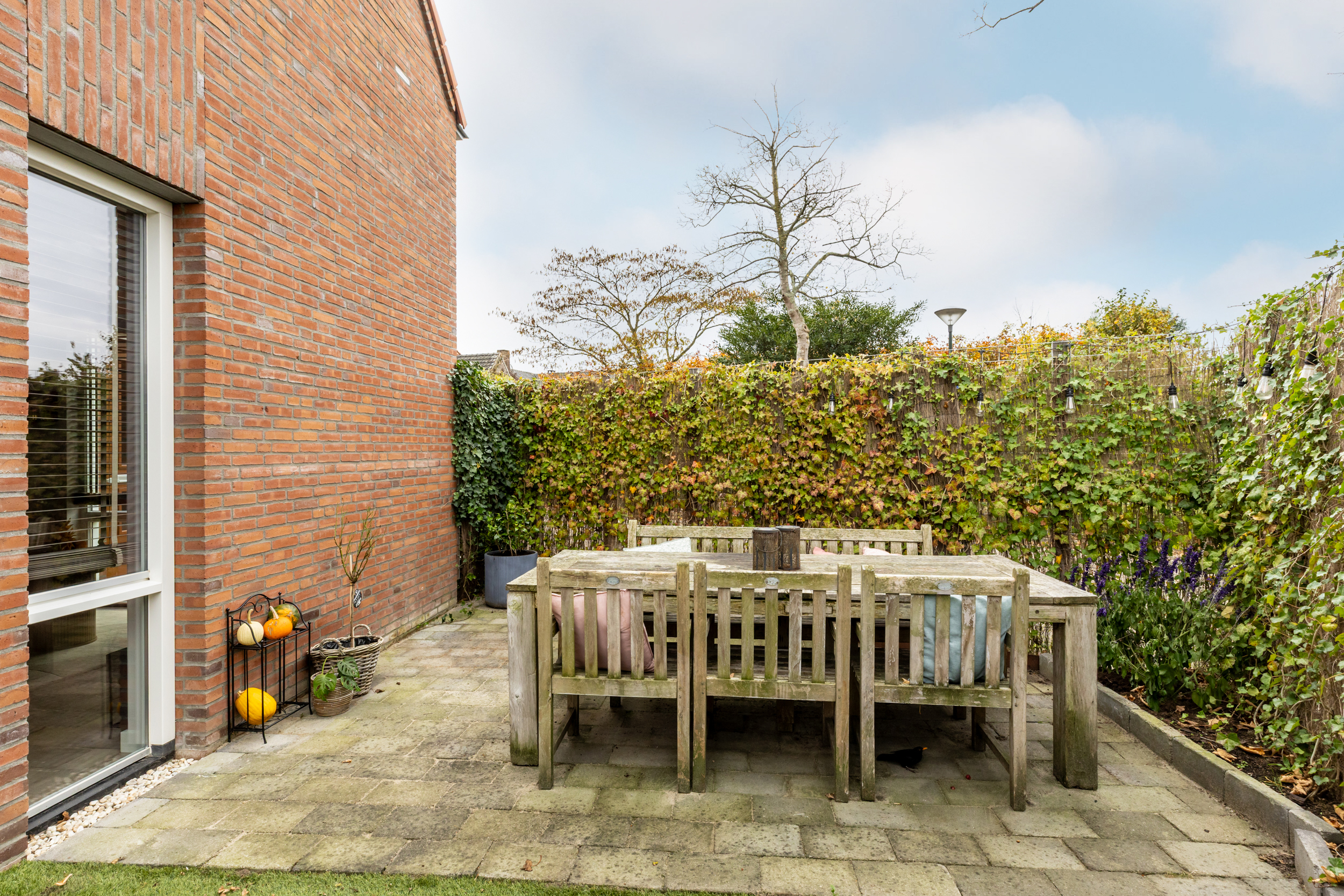 Aan de zijkant van het perceel bevindt zich de achterom, waardoor je gemakkelijk met fietsen, tuingereedschap of boodschappen achterlangs naar binnen kunt. Dit maakt de tuin ook praktisch bruikbaar voor dagelijks gebruik.