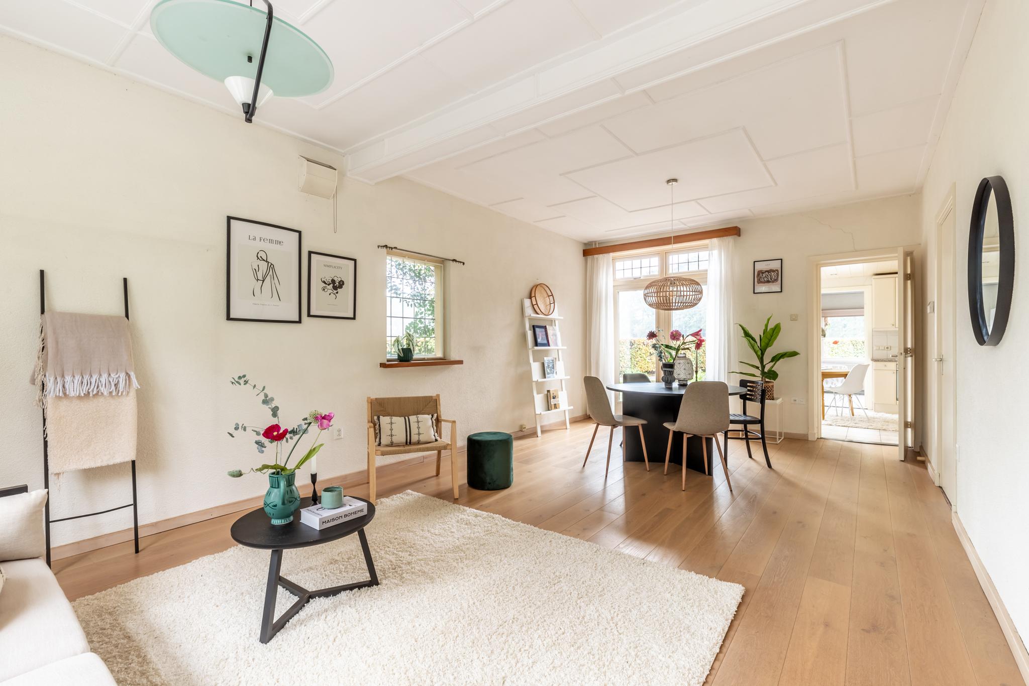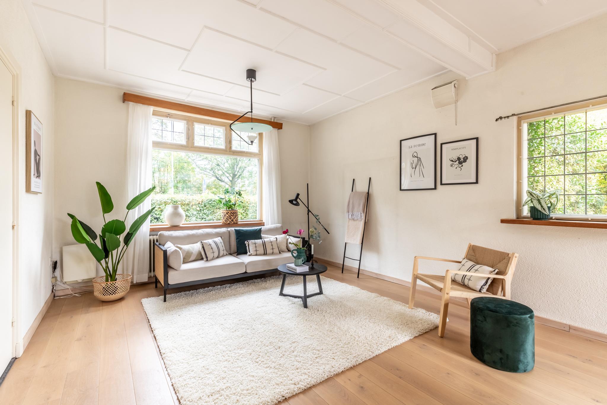 •Woonkamer met openslaande tuindeuren en een vaste kast. Het originele plafond is een lust voor het oog en geeft samen met het aanwezige glas in lood een gezellige touch aan de woonkamer. De vloer is vrij recent vernieuwd (nieuwe betonvloer met isolatie en vloerverwarming) afgewerkt met eikenhouten vloerdelen.