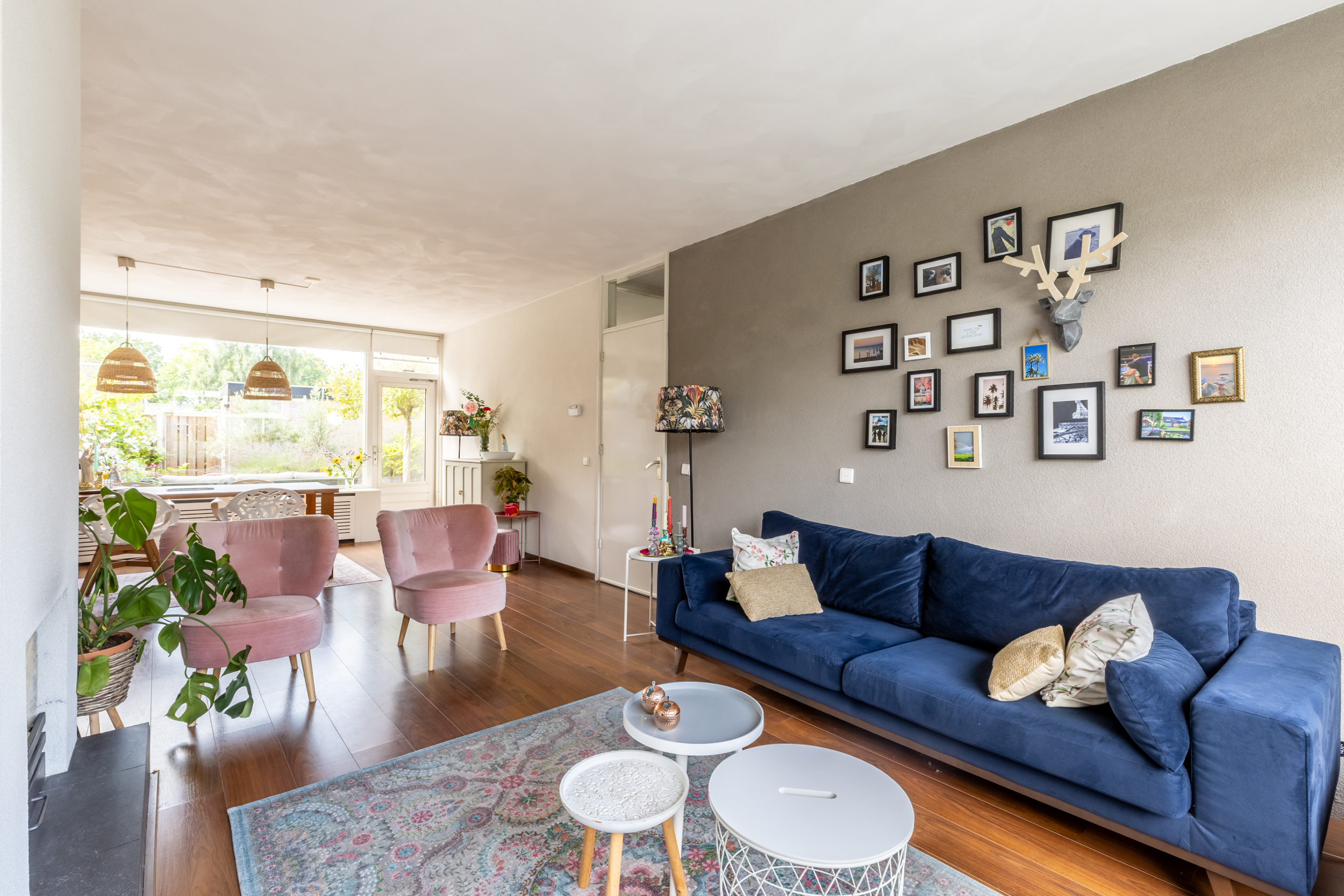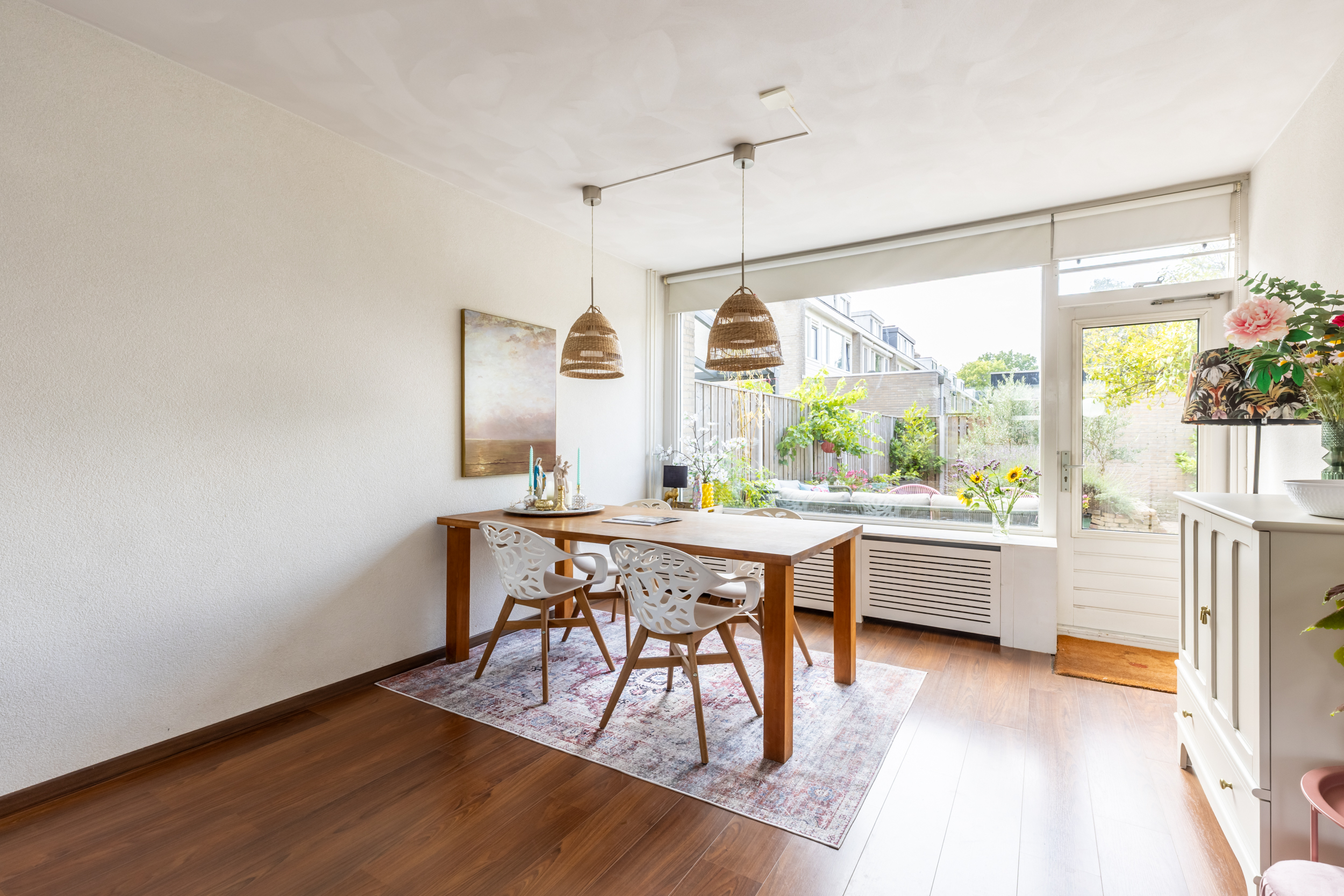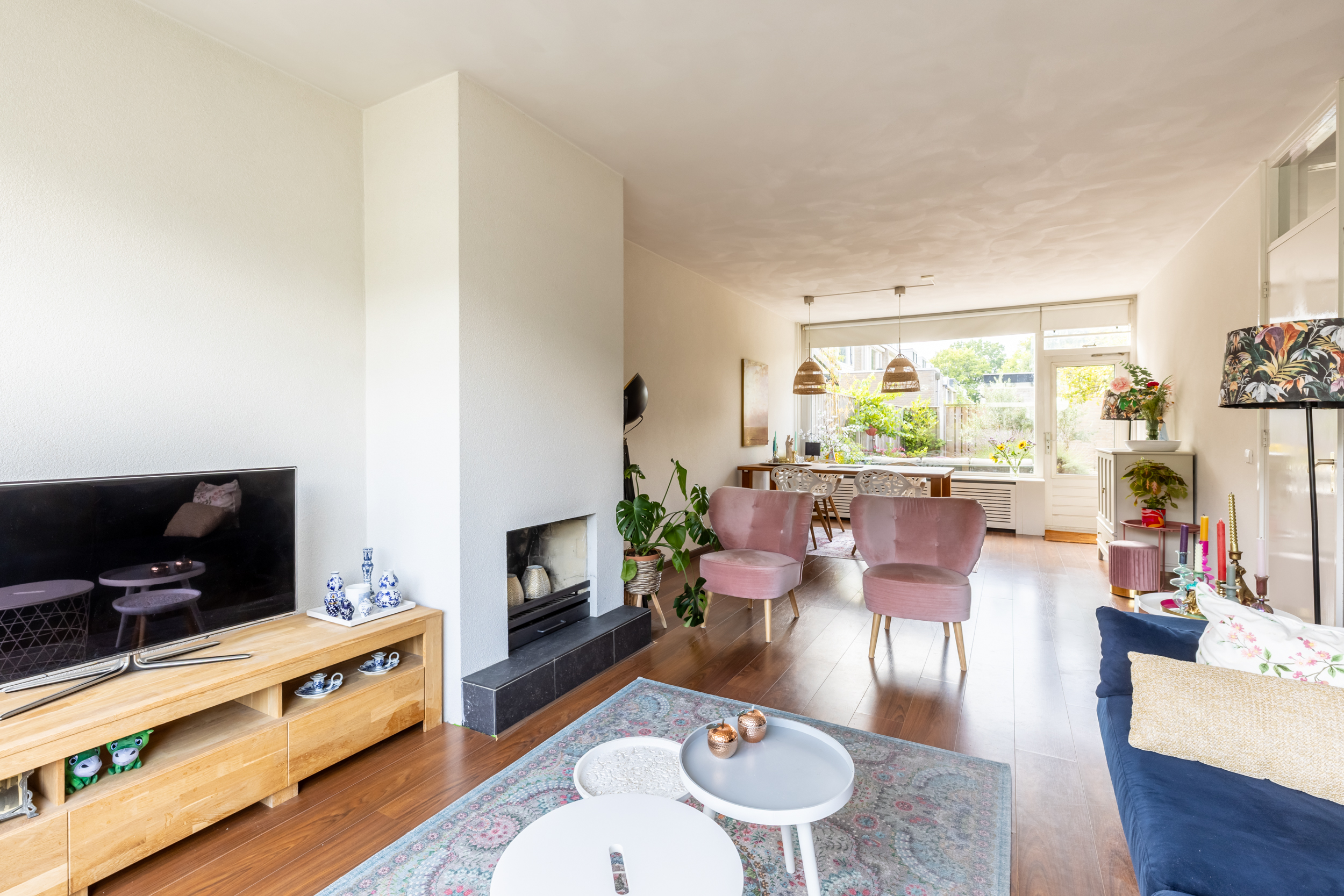 De ruime doorzonwoonkamer is opvallend licht en zonnig dankzij de grote raampartijen aan zowel de voor- als achterzijde. Aan de voorzijde bevindt zich een sfeervolle zithoek met open haard. De achterzijde biedt ruimte aan een royale eettafel voor zes personen, met directe toegang tot de tuin via de tuindeur. De gehele woonkamer is voorzien van een nette laminaatvloer.