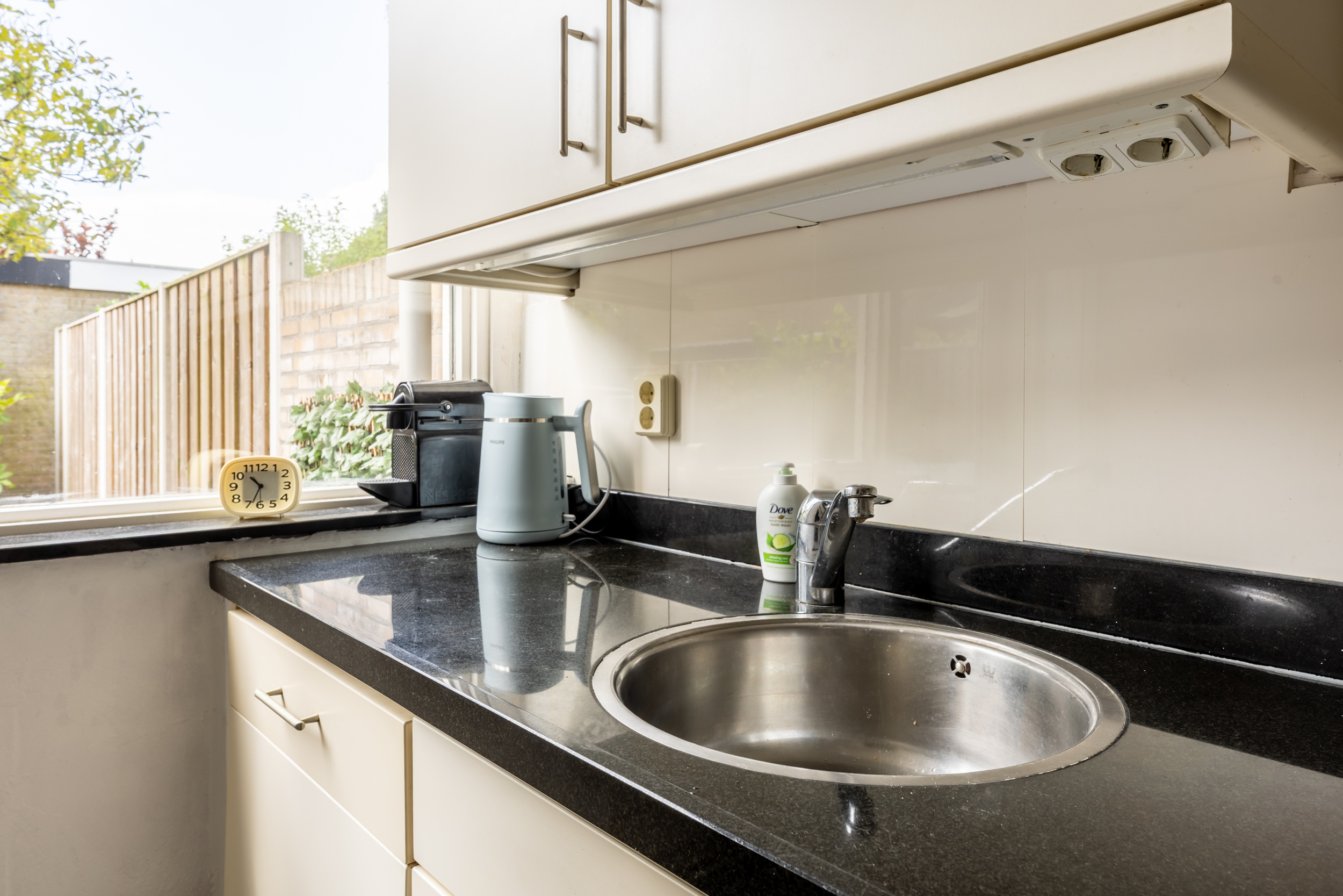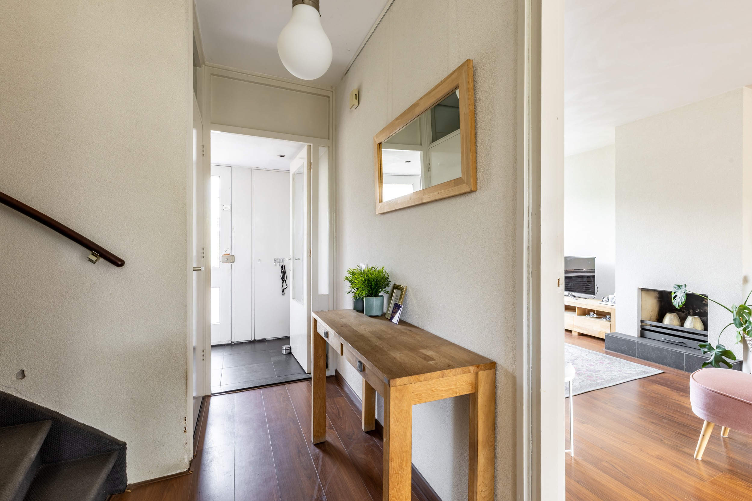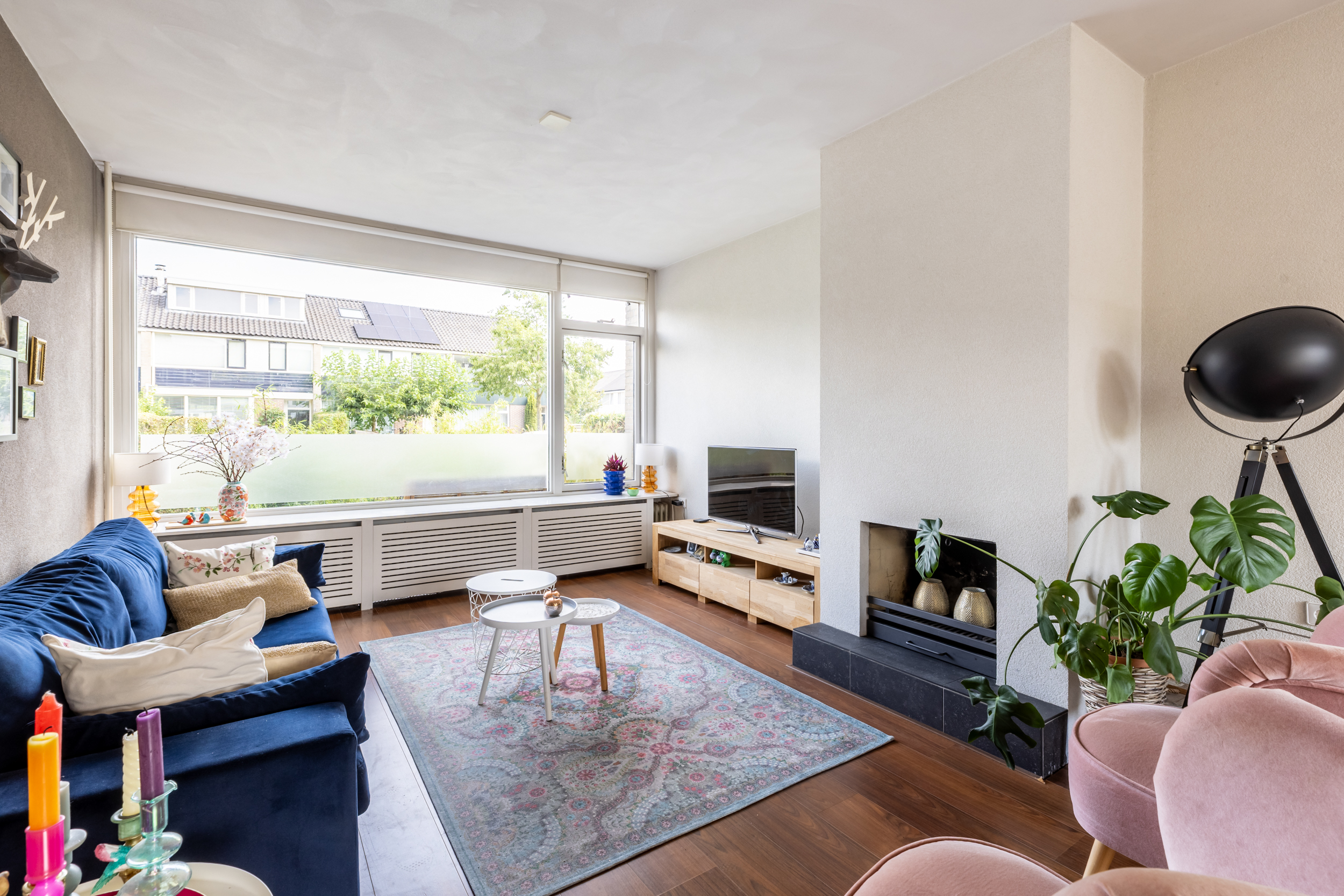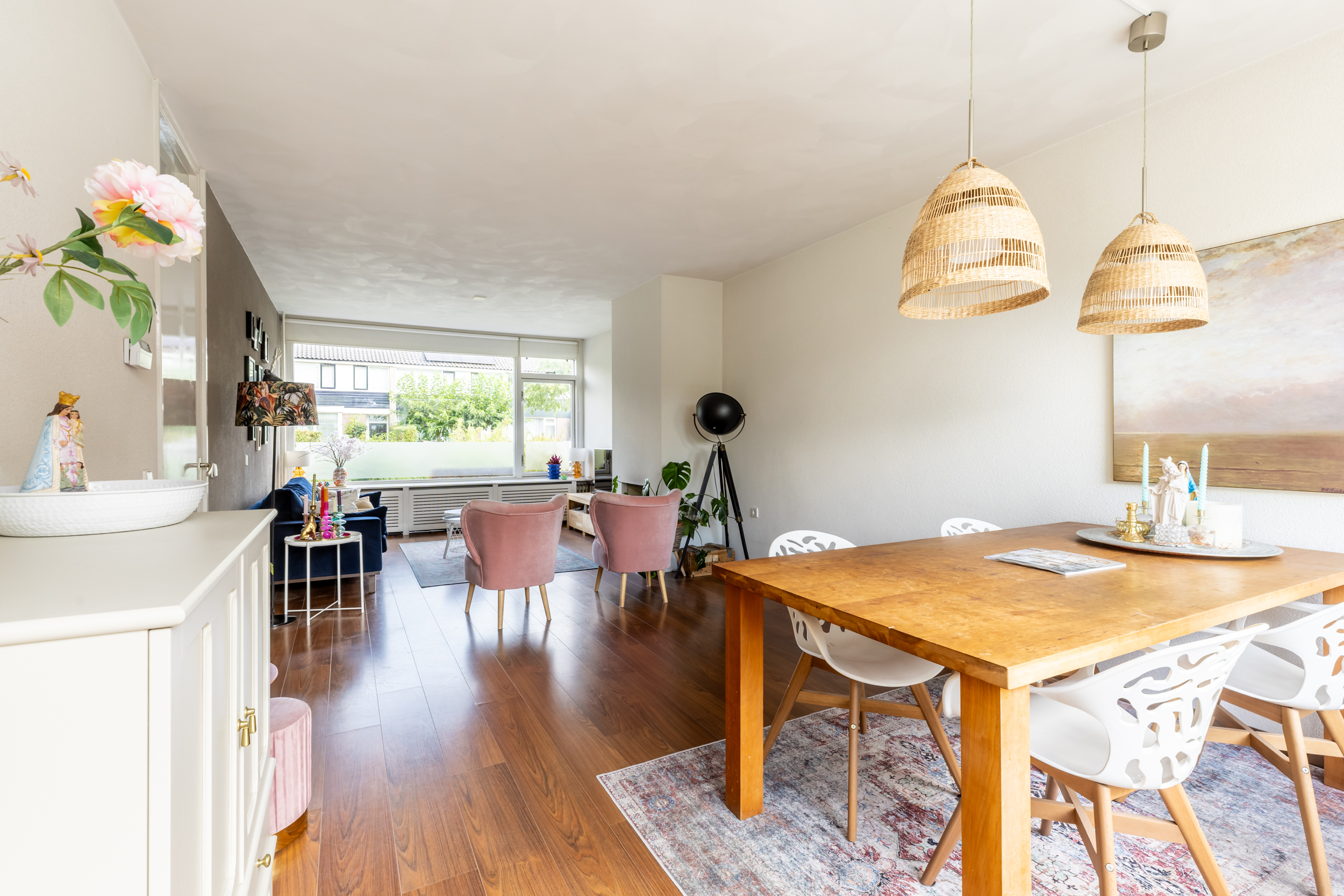 De ruime doorzonwoonkamer is opvallend licht en zonnig dankzij de grote raampartijen aan zowel de voor- als achterzijde. Aan de voorzijde bevindt zich een sfeervolle zithoek met open haard. De achterzijde biedt ruimte aan een royale eettafel voor zes personen, met directe toegang tot de tuin via de tuindeur. De gehele woonkamer is voorzien van een nette laminaatvloer.