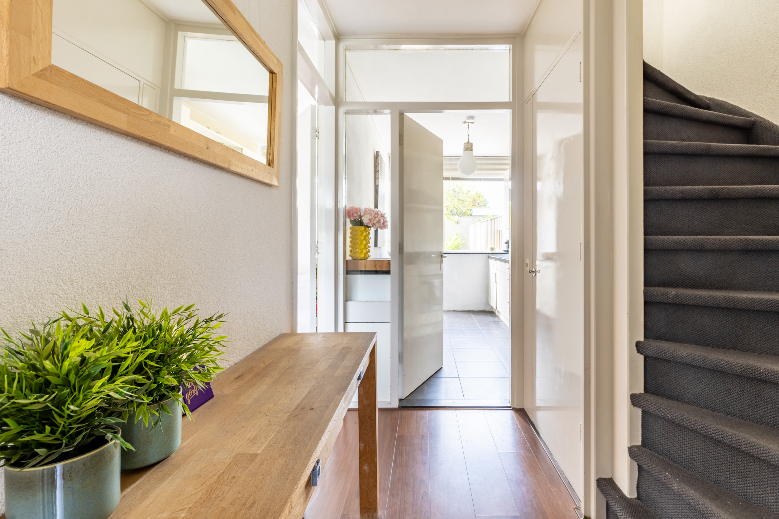Via de entree komt u binnen in de hal. Deze is afgewerkt met een fraaie antraciet tegelvloer. In deze ruimte is de meterkast gesitueerd. Vanuit de hal is toegang tot een tussenportaal. Hier ligt een laminaatvloer en vindt u het moderne, hangende toilet met fonteintje, de trapkast en de trapopgang naar de eerste verdieping.
