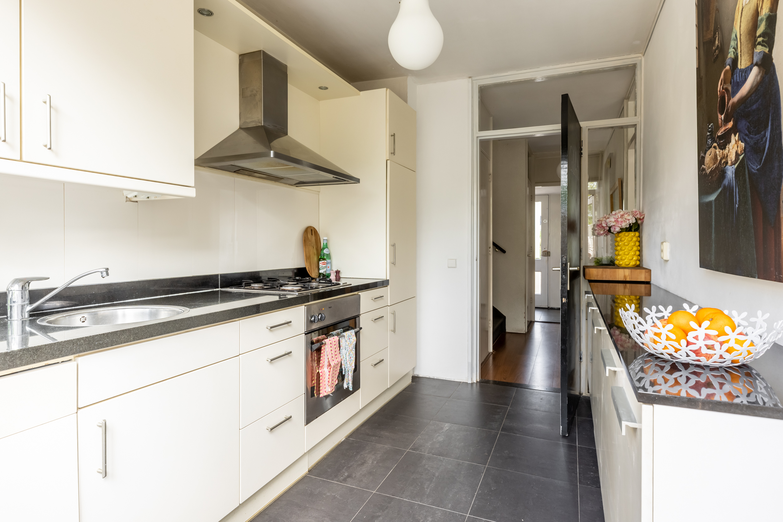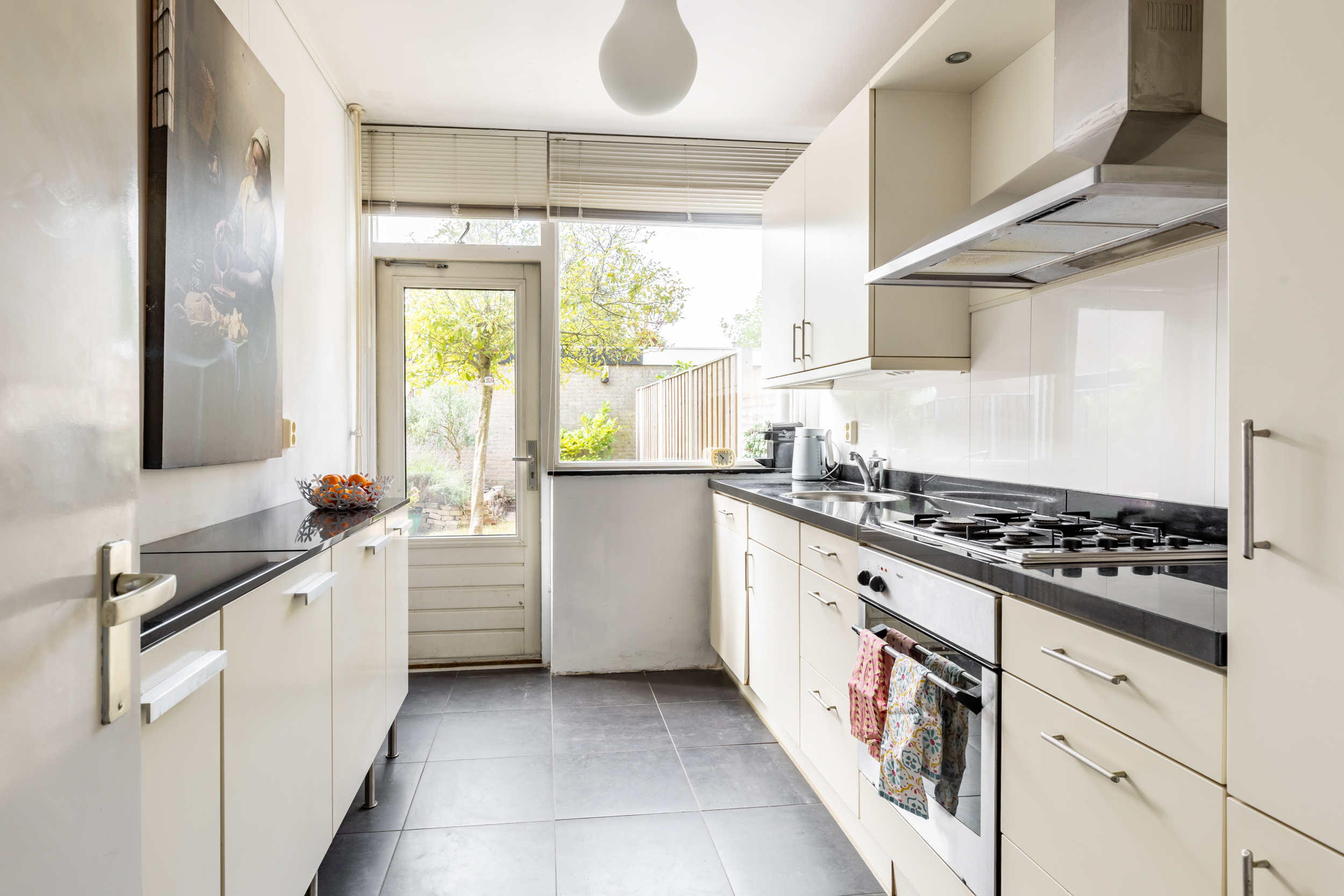 De gesloten keuken is functioneel en netjes ingericht. Deze is uitgerust met een Pelgrim oven, een 4-pits gaskookplaat, een afzuigkap, een ingebouwde vaatwasser, koelkast, vriezer en een ruim werkblad. De vloer in de keuken is gelijk aan die van de hal: een stijlvolle en onderhoudsvriendelijke antraciet tegelvloer. Ook hier is een deur naar de tuin aanwezig.