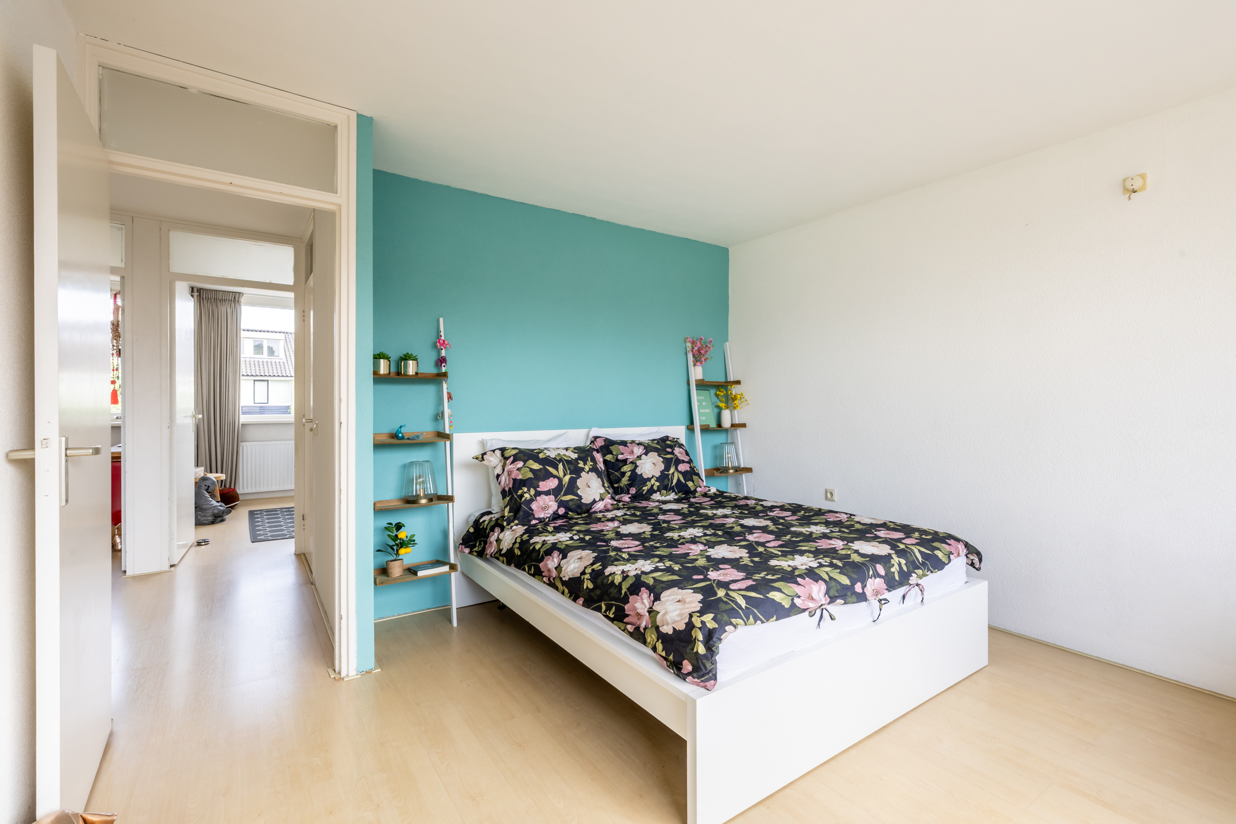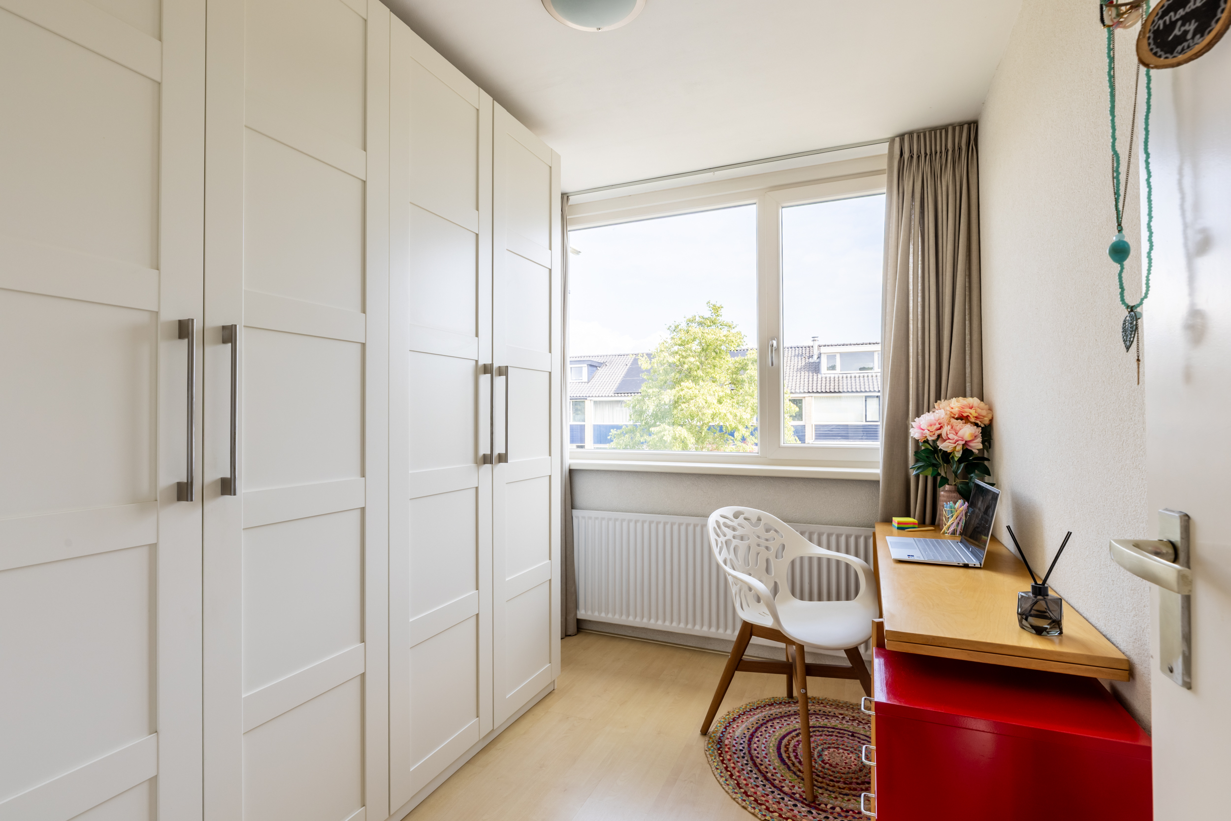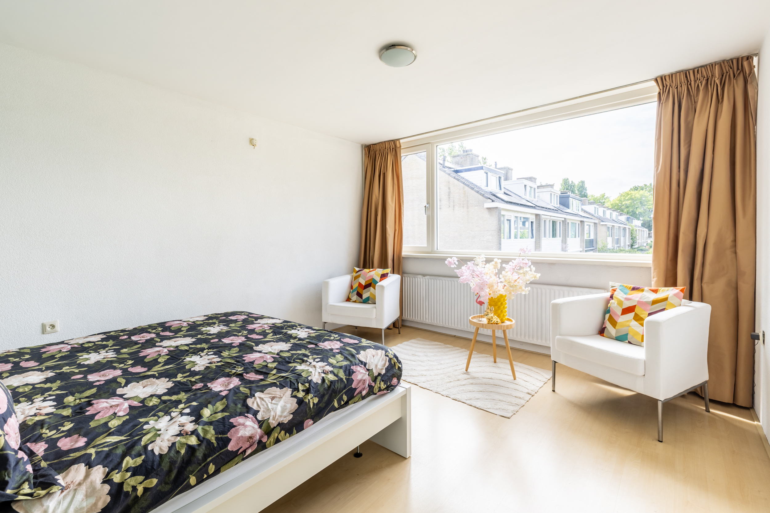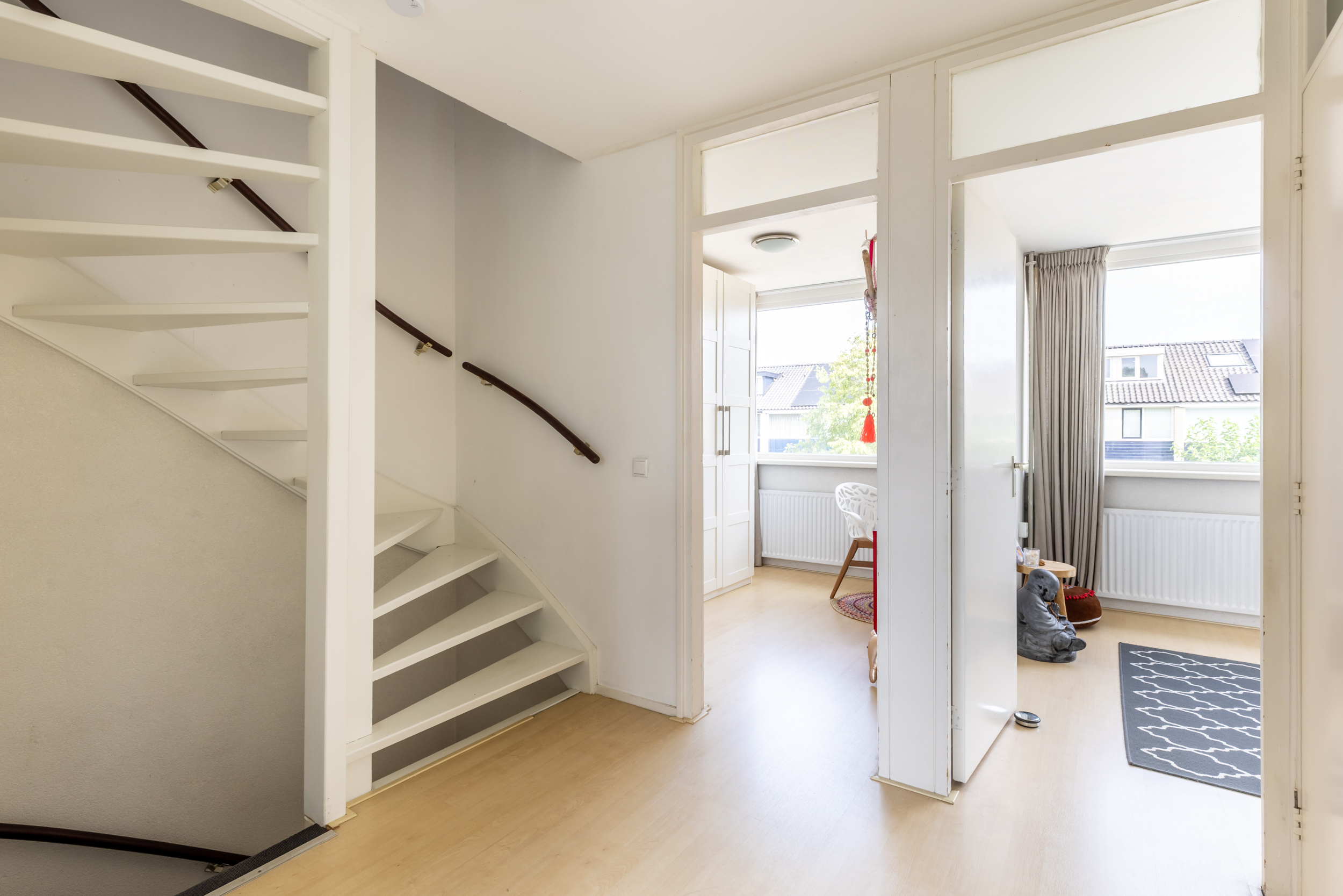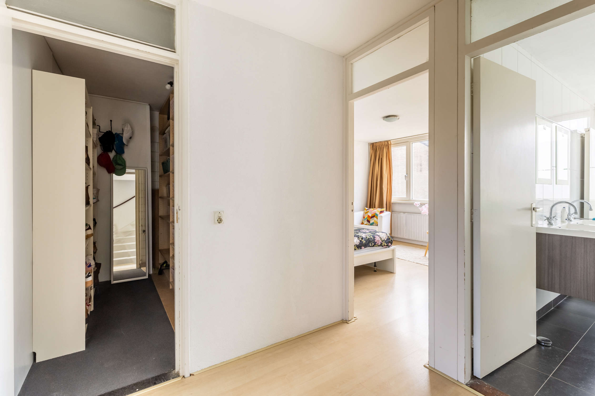 Via de overloop heeft u toegang tot drie volwaardige slaapkamers, de badkamer en een royale inloopkast (voorheen badkamer). De slaapkamers hebben grote raampartijen die zorgen voor veel natuurlijk licht.