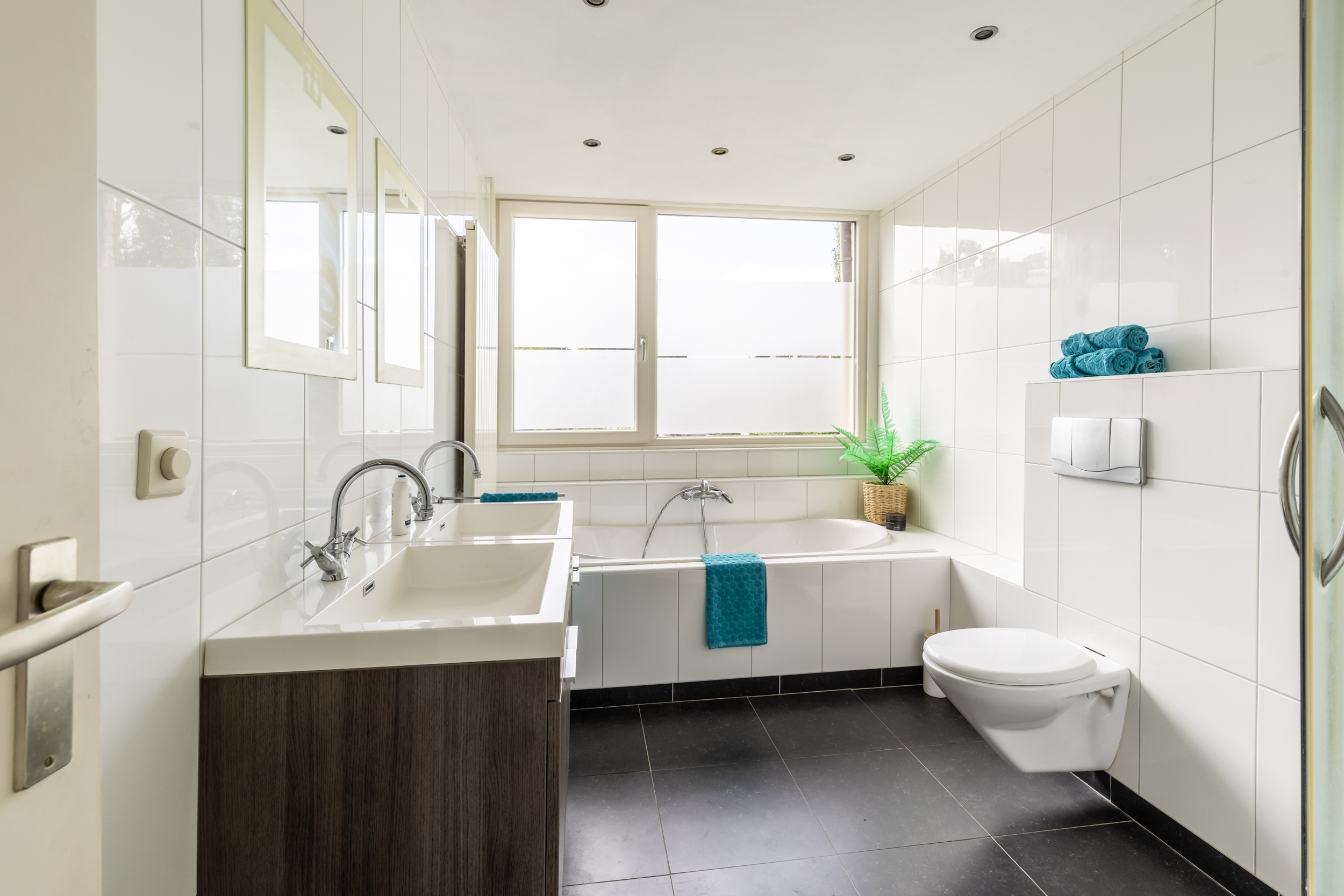 De badkamer is verplaatst naar een van de slaapkamers en is zeer ruim en modern ingericht. Deze is voorzien van een ligbad, een aparte douchecabine, een dubbele wastafel, een hangend toilet en een designradiator. De ruimte is afgewerkt met een stijlvolle grijze tegelvloer en witte wandtegels. Ook hier zorgen grote ramen met draaikiepstand voor een aangename lichtinval en goede ventilatie.