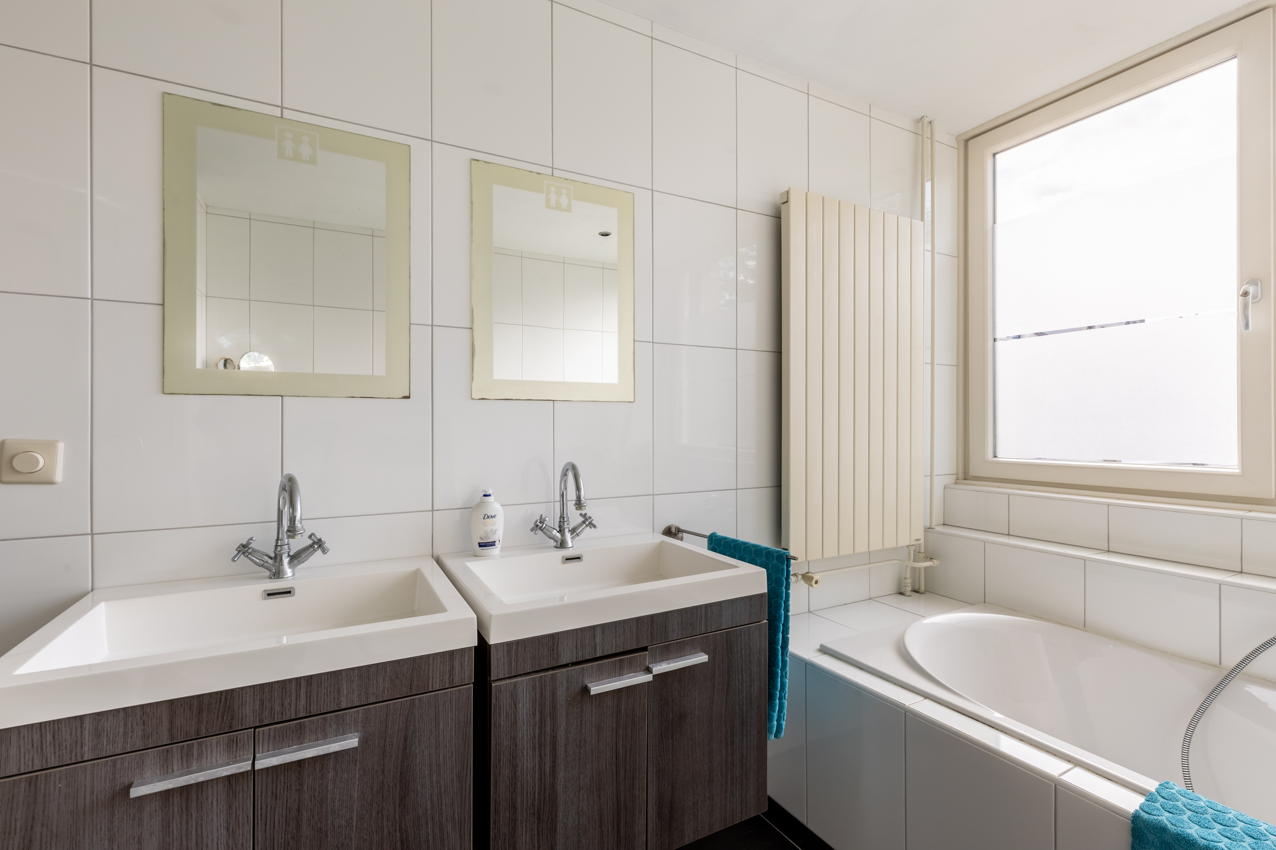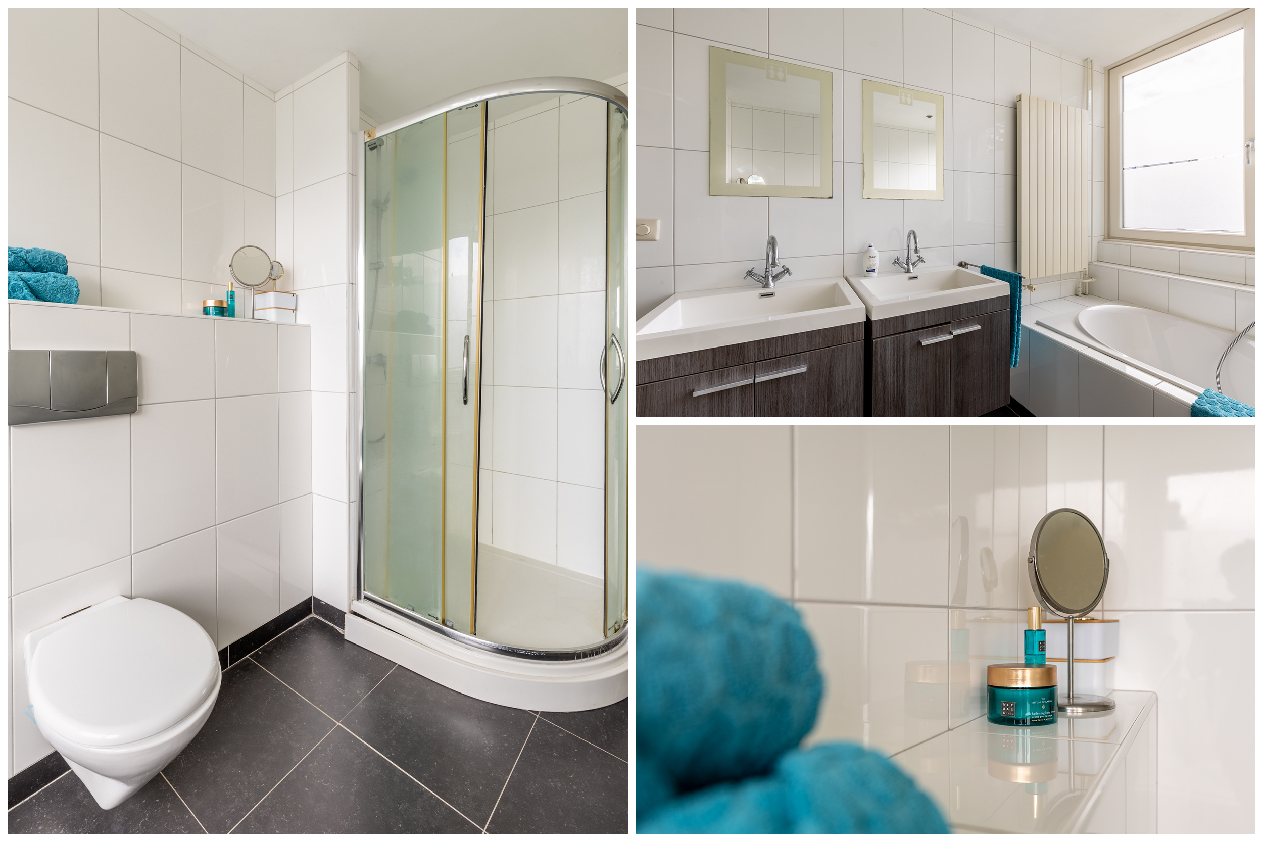 - Ligbad, toilet, douche en dubbele wastafel