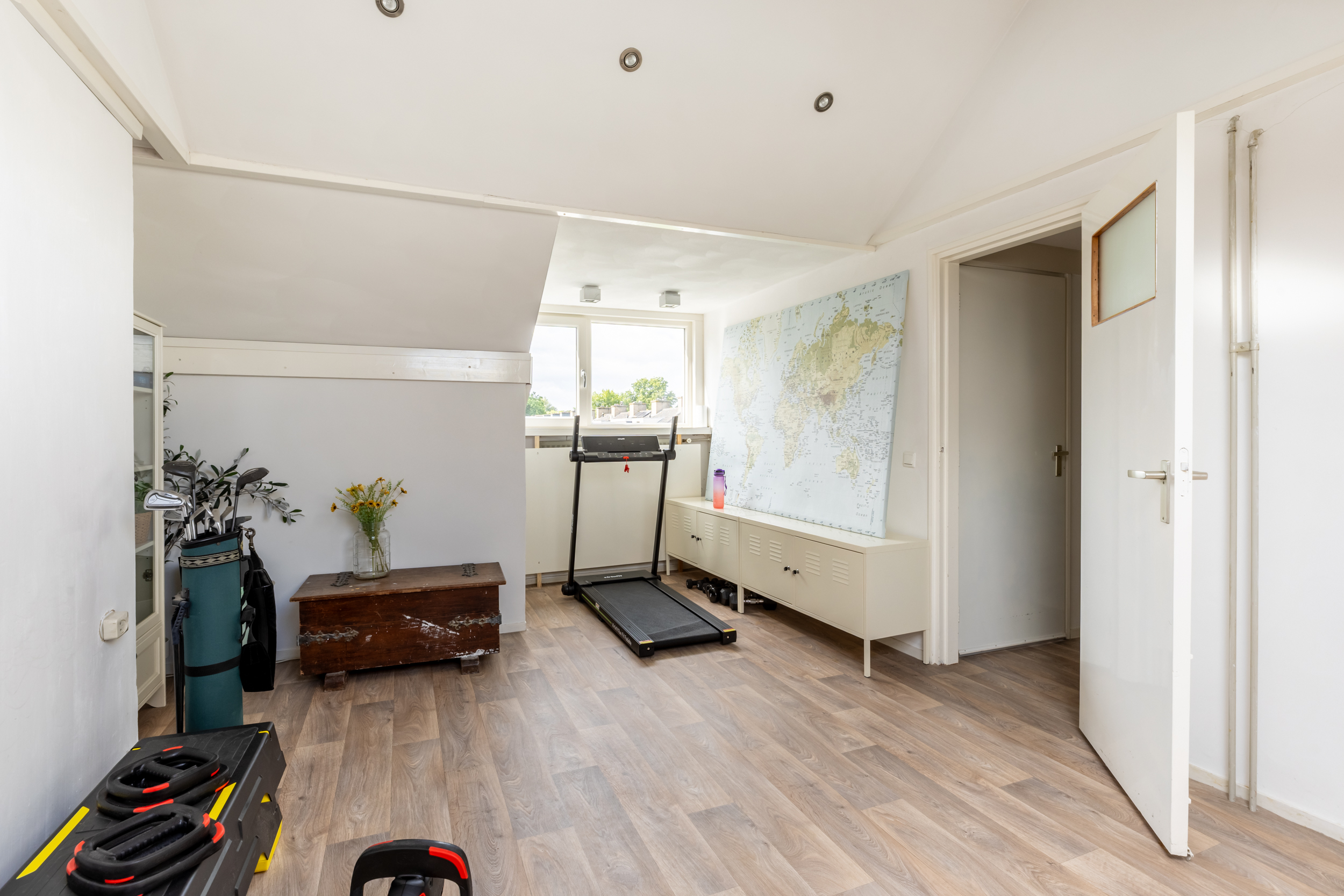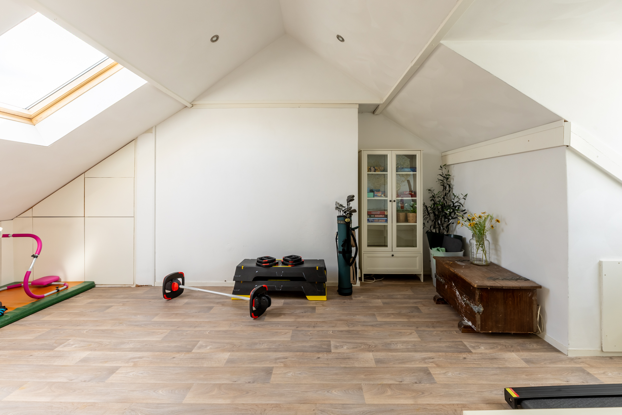 Een vaste trap leidt naar de tweede verdieping, waar een vierde slaapkamer is gerealiseerd. Deze kamer wordt momenteel gebruikt als hobbyruimte, maar is ook uitstekend geschikt als extra slaapkamer of thuiswerkplek. Dankzij de lichte laminaatvloer, het Velux dakraam én de geplaatste dakkapel die doorloopt over de wasruimte, voelt deze verdieping extra licht en ruim aan.