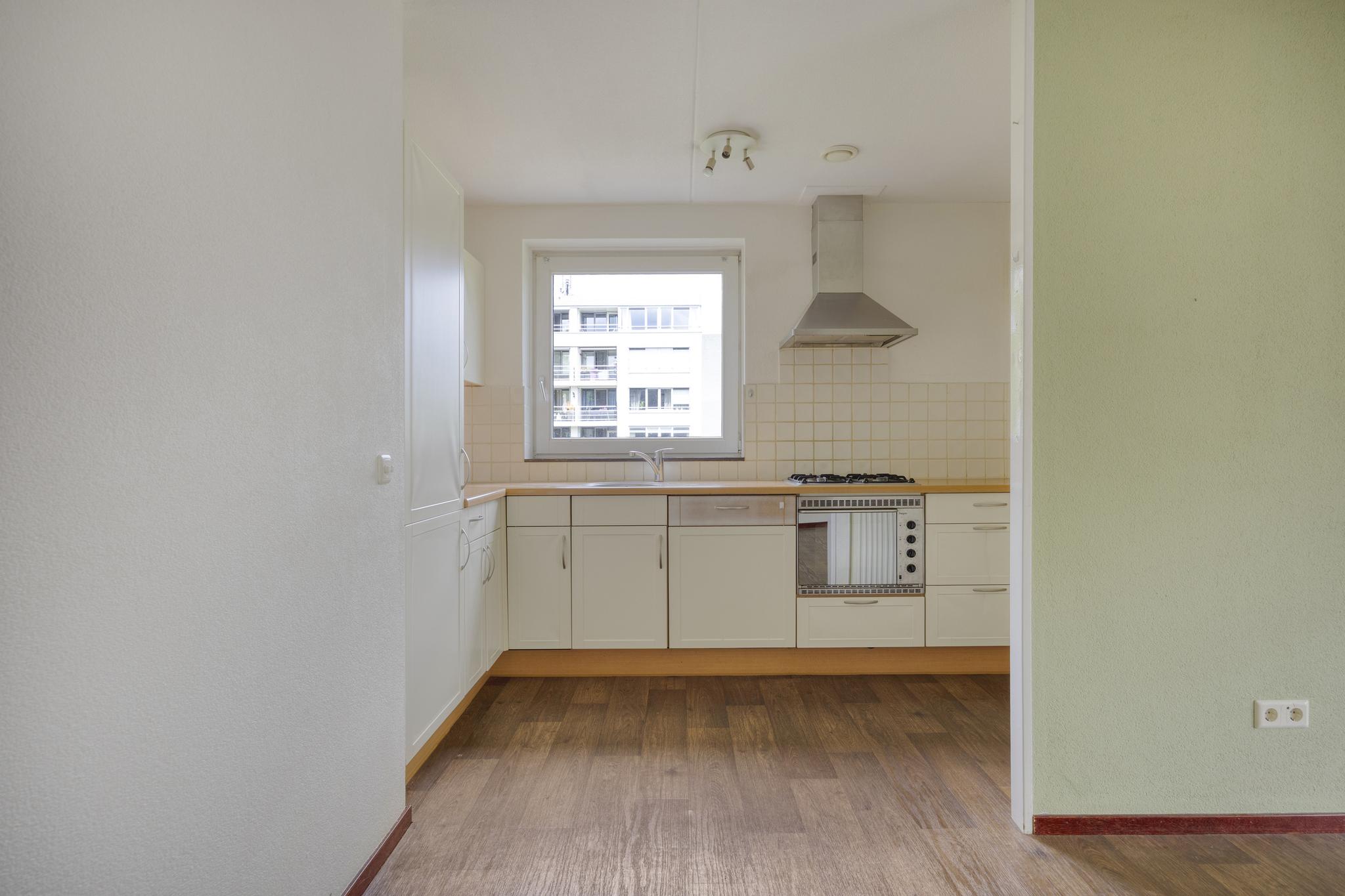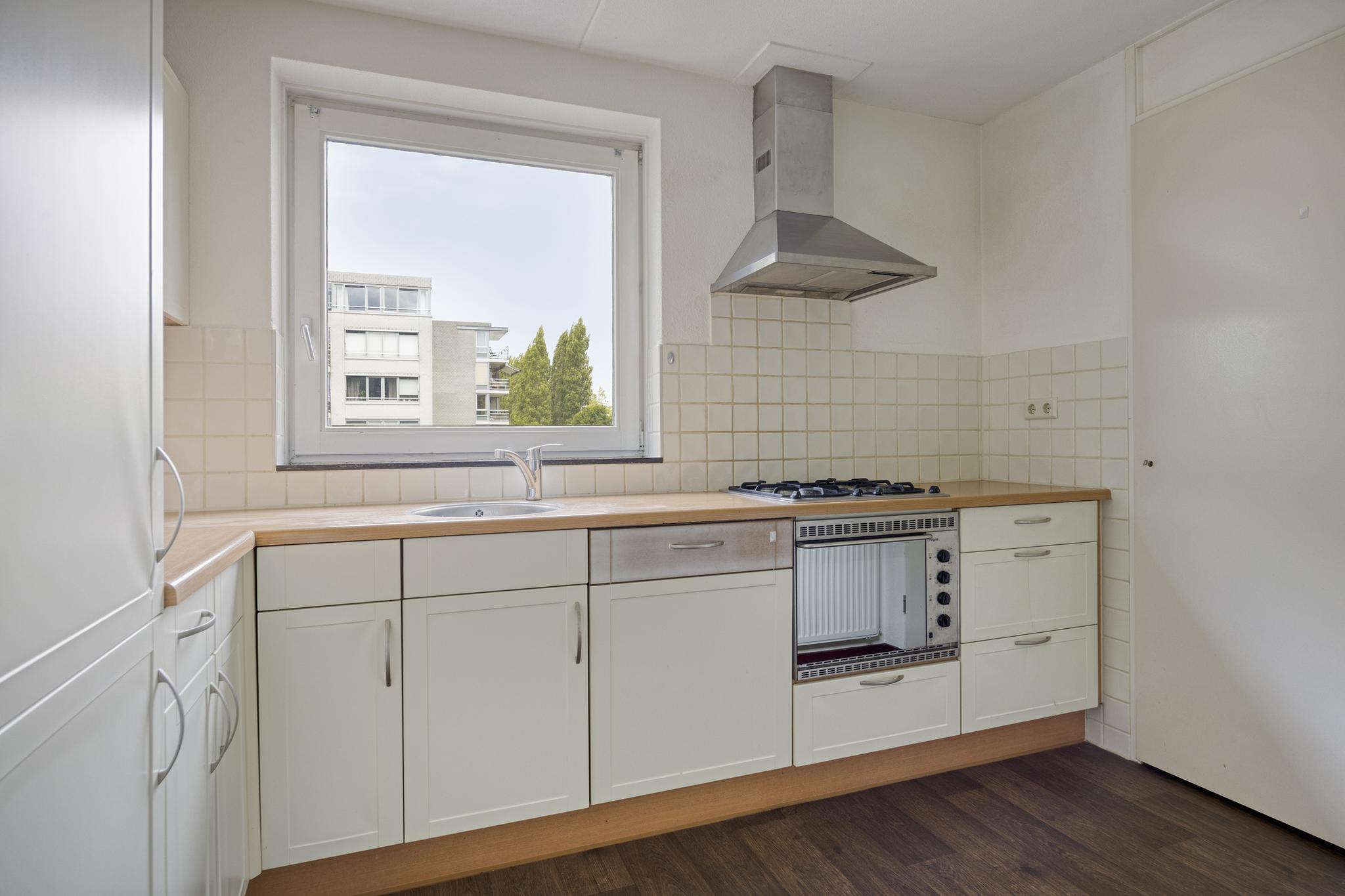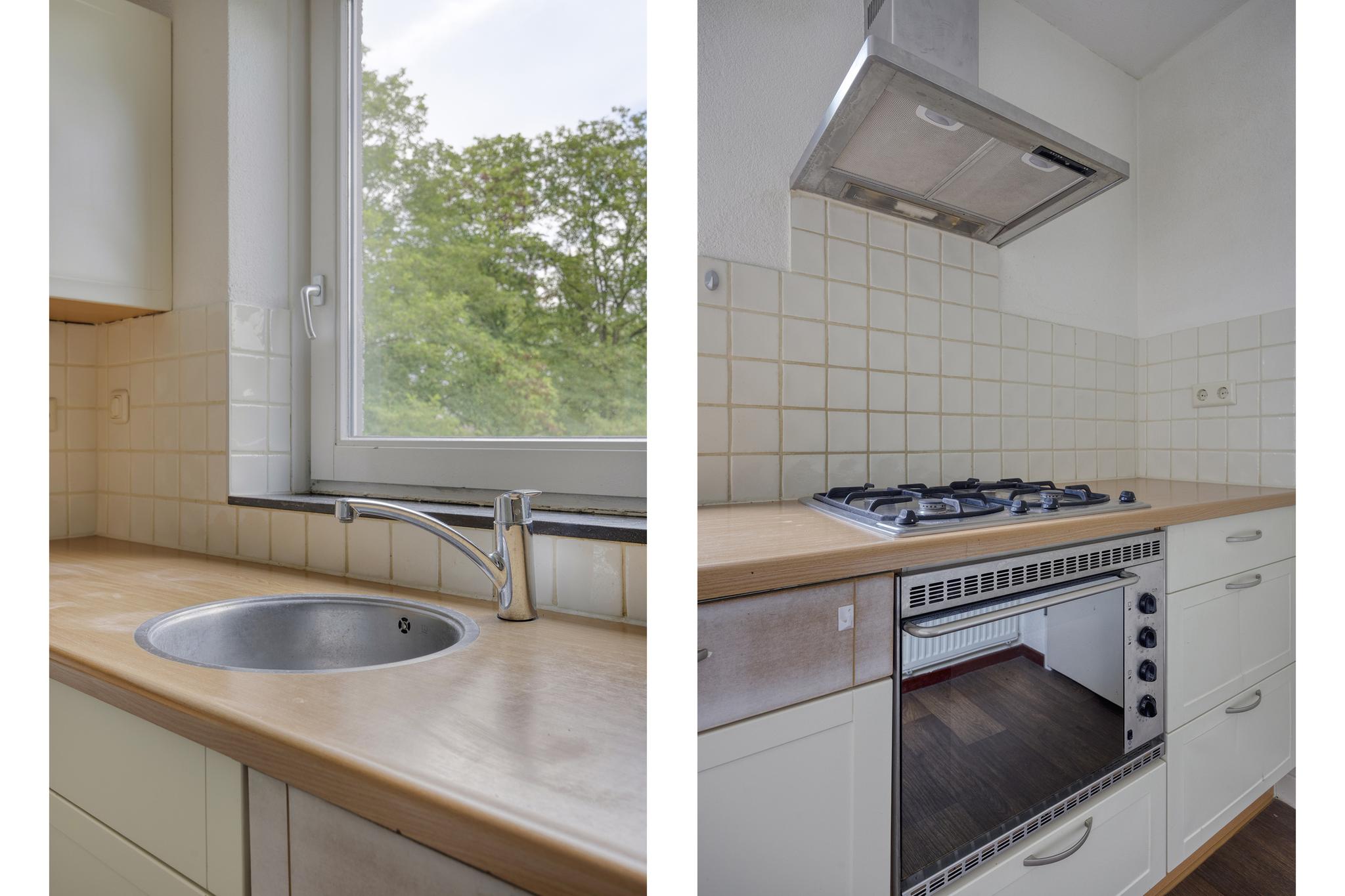 De eethoek staat in prettige verbinding met de halfopen keuken. De keuken is geplaatst in een hoekopstelling en voorzien van diverse inbouwapparatuur. Vanuit de keuken is de bijkeuken bereikbaar. Hier bevindt zich naast de aansluitingen voor de wasapparatuur voldoende ruimte voor het plaatsen van een extra koelkast/vriezer en het bergen van uw proviand.