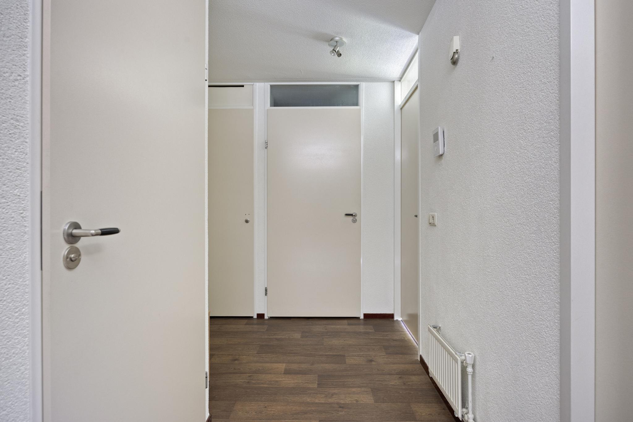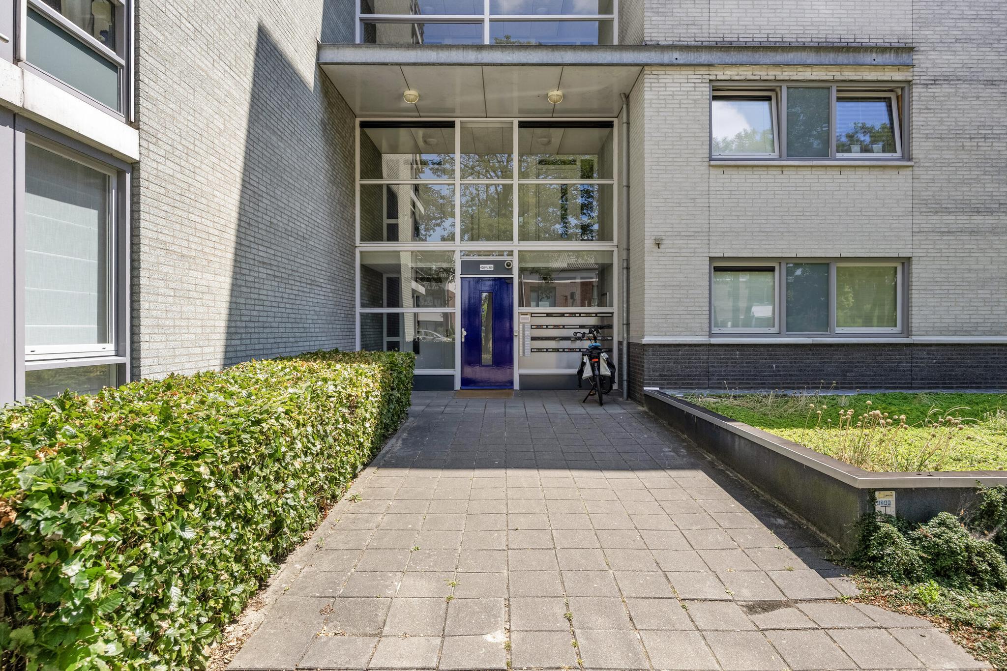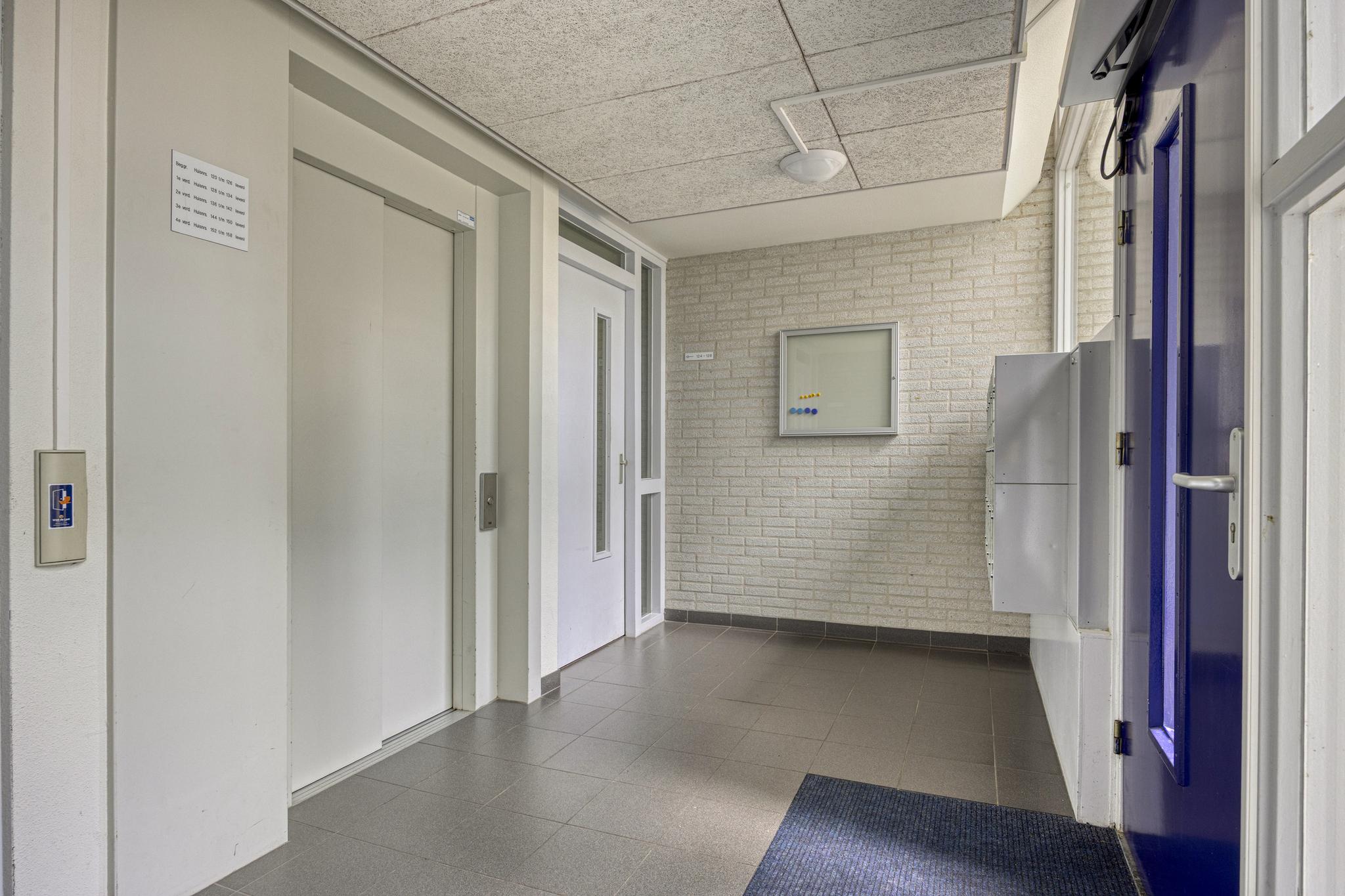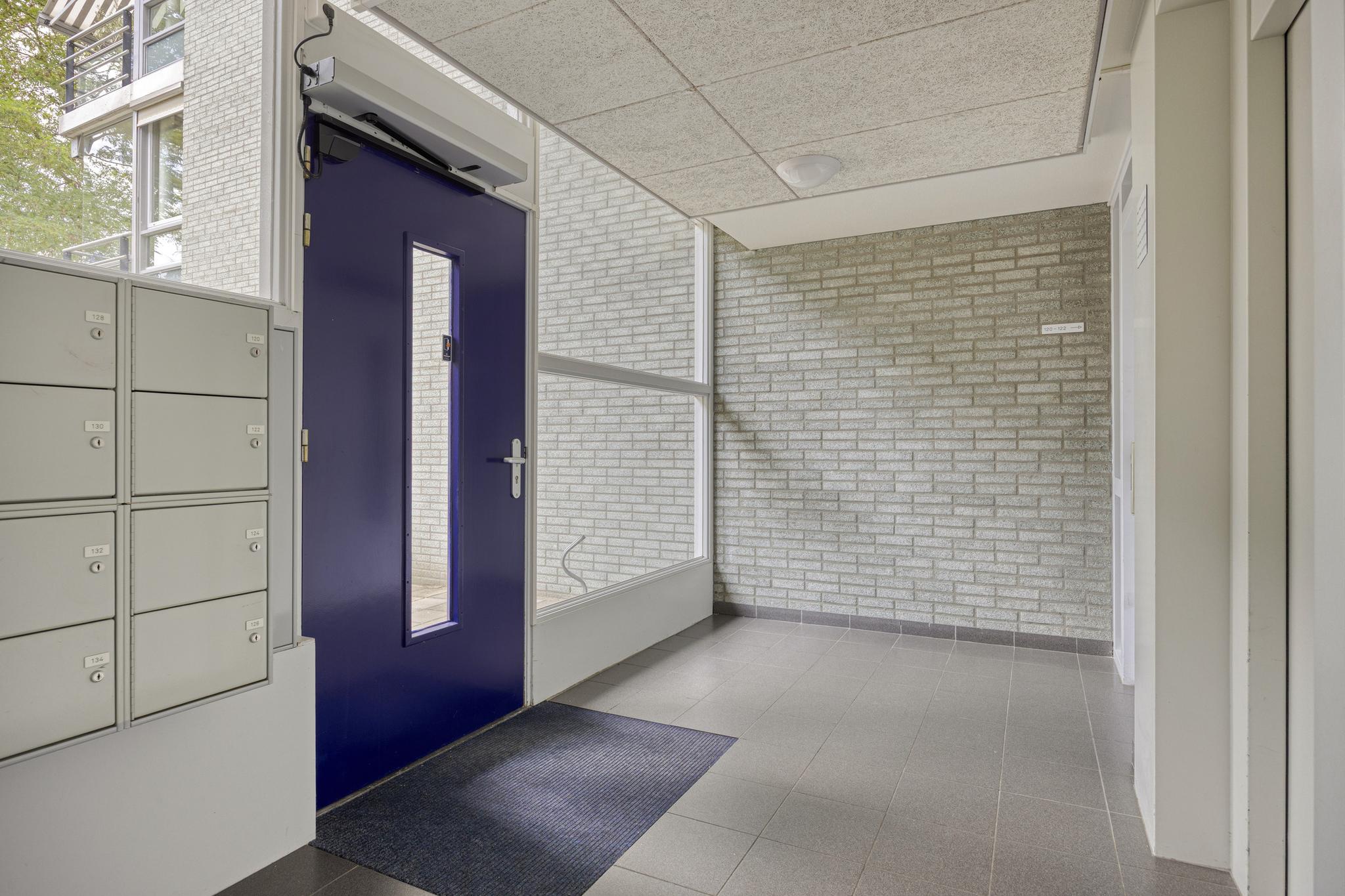 De gemeenschappelijke entree, voorzien van postbussen en bellentableau met intercominstallatie, biedt toegang tot het trappenhuis en de lift. Het appartement is gelegen op de tweede verdieping.
