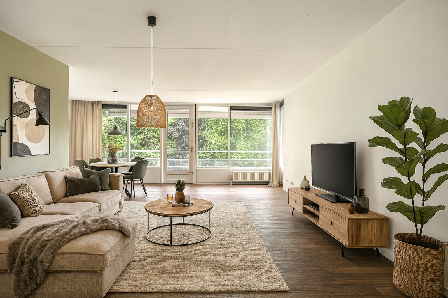 De woonkamer is gelegen aan de achterzijde van het complex, vanwaar u geniet van het prachtige uitzicht over het water en het Westerpark! De L-vormige woonkamer biedt voldoende ruimte voor het plaatsen van een zit- en eethoek. Vanuit de zithoek heeft u toegang tot het balkon. Het balkon biedt, mede door het aanwezige zonnescherm, een heerlijke plaats in zowel zon als schaduw. Vanuit de woonkamer en het balkon geniet u van het prachtige, rustgevende uitzicht over het Westerpark.