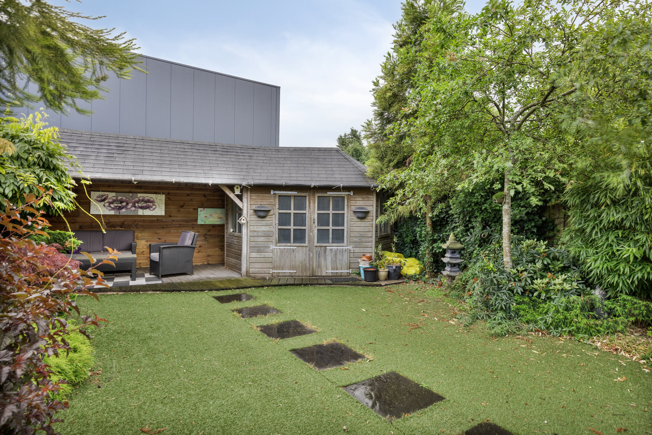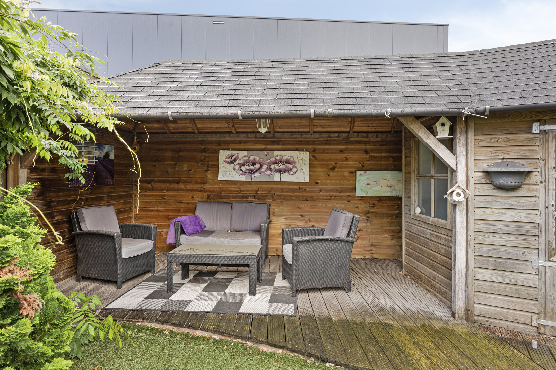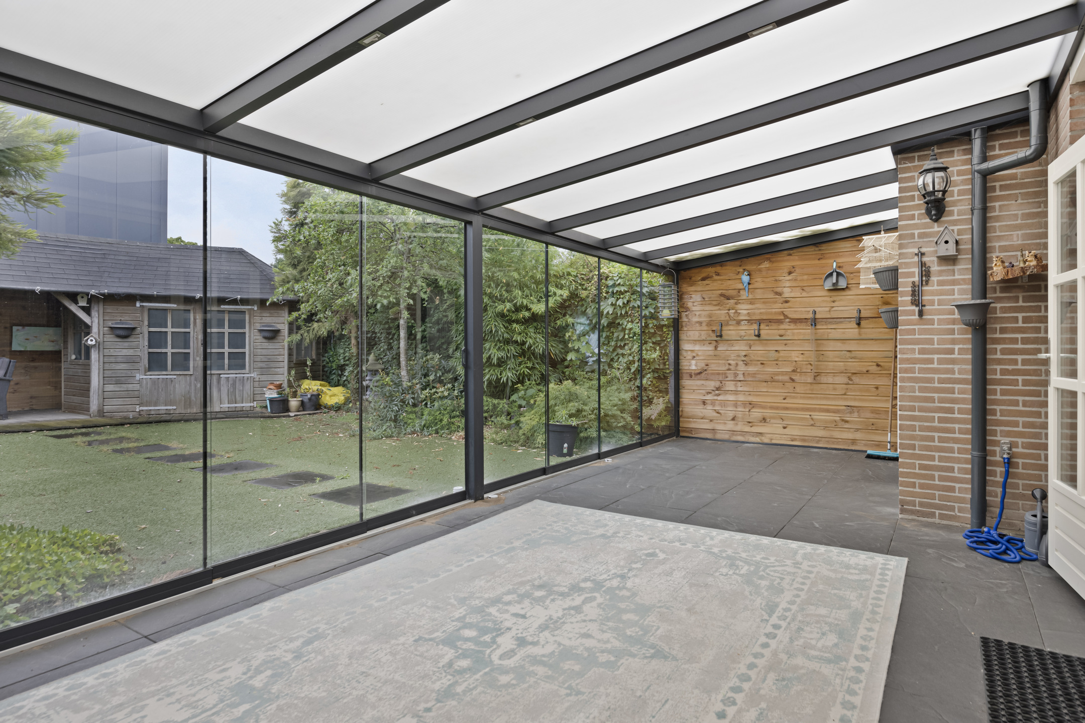Via de schuifpui in de serre stap je zo de achtertuin in. De tuin is gelegen op het oosten wat betekent dat je in de ochtend al heerlijk van de zon kunt genieten. De tuin is fraai aangelegd met onderhoudsvriendelijk kunstgras en wordt omlijst door diverse bomen en planten die zorgen voor een groene en rustige sfeer. Achterin de tuin vind je een houten schuur met overkapping waar je heerlijk kunt zitten. Dit is de ideale plek om 's avonds met vrienden een drankje te doen.