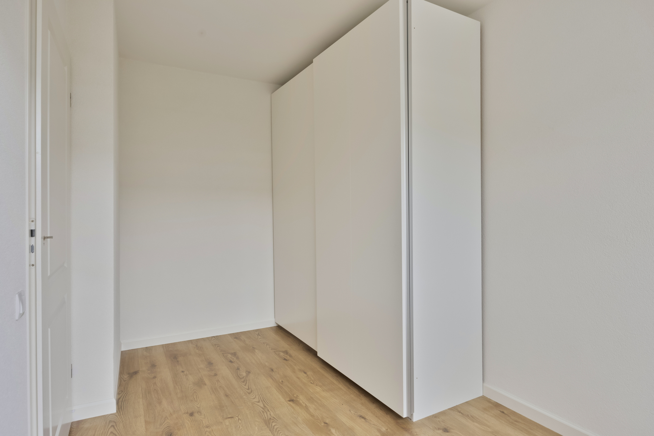 Via de overloop kom je op de eerste verdieping. Hier vind je twee slaapkamers en een moderne badkamer. De hoofdslaapkamer is royaal opgezet en strekt zich uit over de volledige breedte van de woning. Dit betekent dat er meer dan genoeg ruimte is voor een tweepersoonsbed, een kledingkast en zelfs een bureau. De tweede slaapkamer is ideaal als kinderkamer of rustige thuiswerkplek. De badkamer is modern en uitgerust met een inloopdouche met regendouche, een toilet, een dubbele wastafel met stijlvol meubel en een handdoekradiator. Bovendien is de gehele eerste verdieping uitgerust met rolluiken die zorgen voor extra privacy en verduistering.