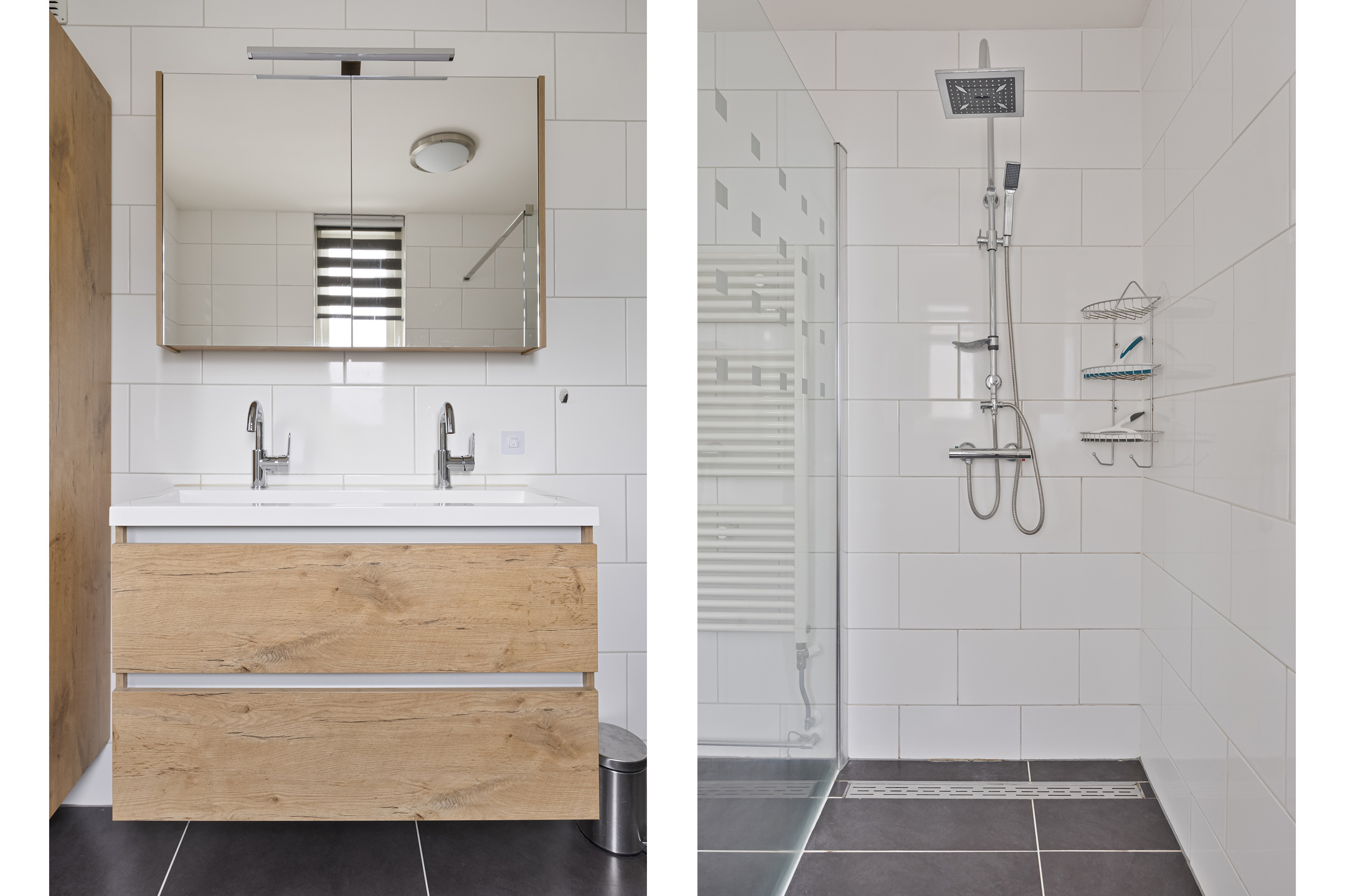- Toilet, dubbele wastafel, wastafelmeubel en inloopdouche