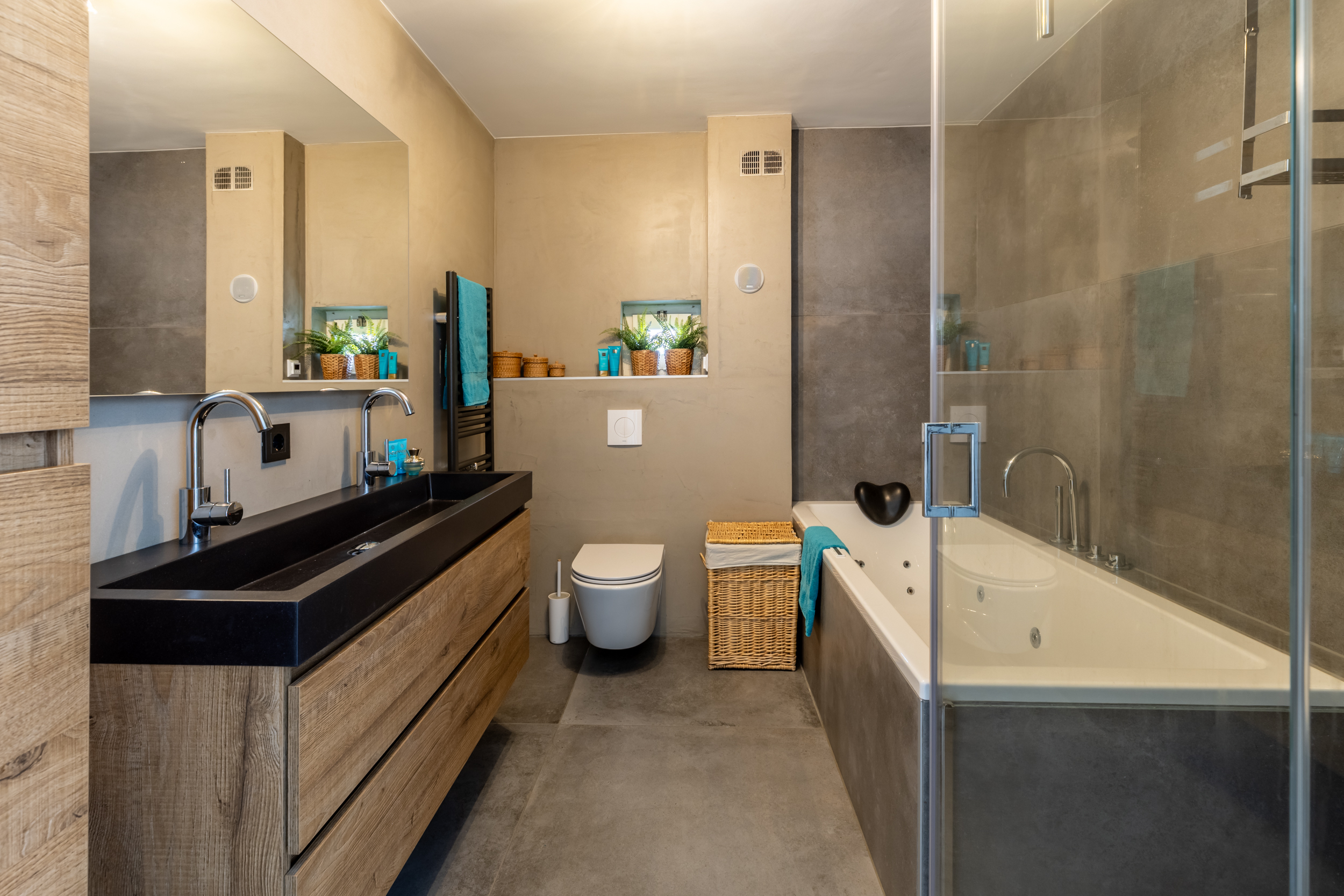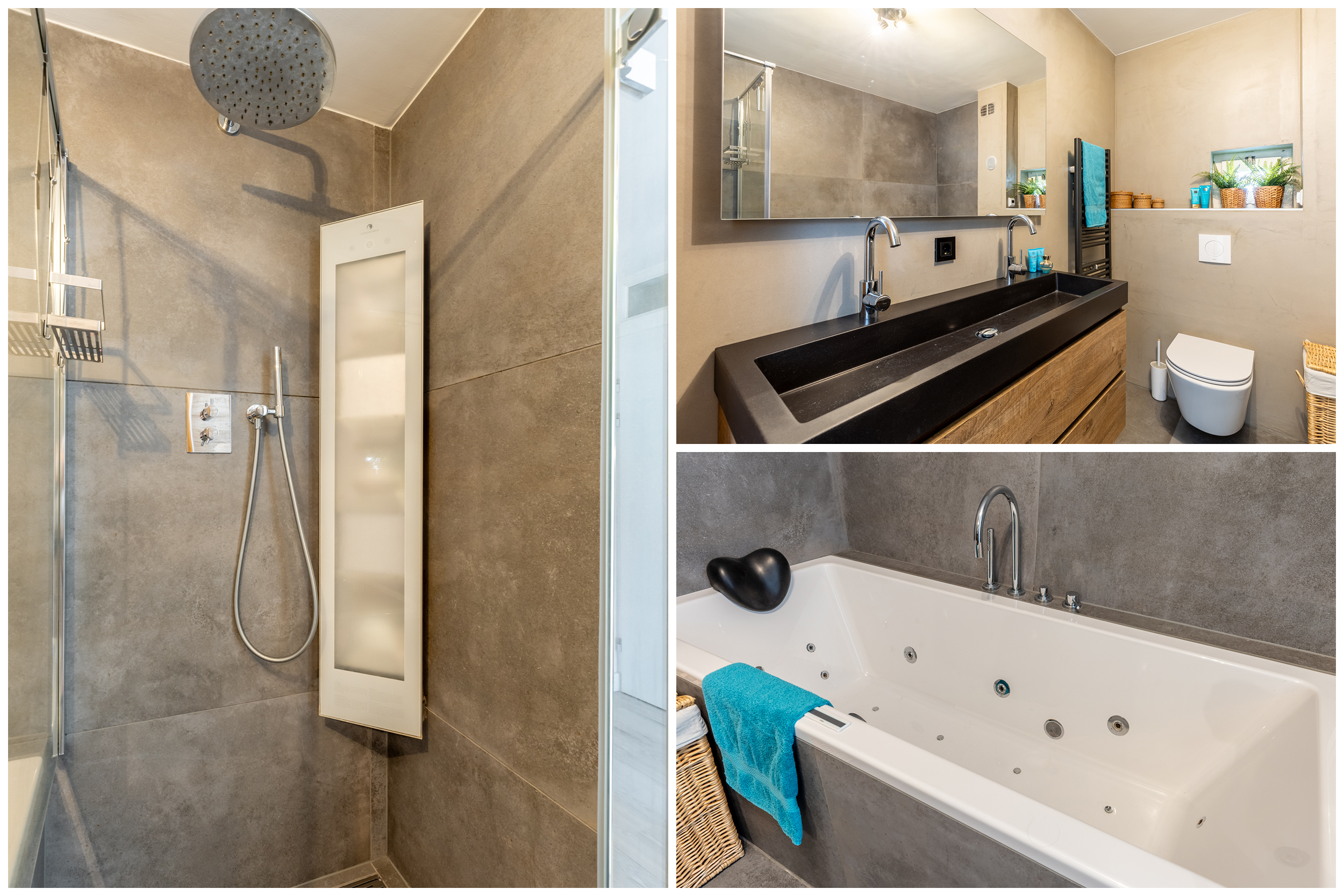 - Luxe badkamer (2019) met ligbad, inloopdouche, toilet en dubbele wastafel;