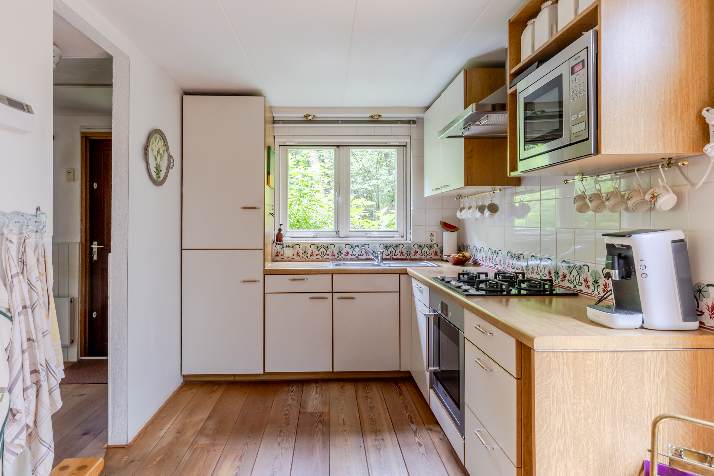 Binnen valt meteen het warme karakter op. De woonkamer is licht dankzij het grote raam dat uitzicht biedt op het omringende groen. De houten vloer en het zichtbare balkenplafond geven de ruimte een gezellige, landelijke sfeer. Aangrenzend ligt de open keuken, praktisch ingericht en voorzien van voldoende kastruimte, een gasfornuis en enkele inbouwapparatuur.