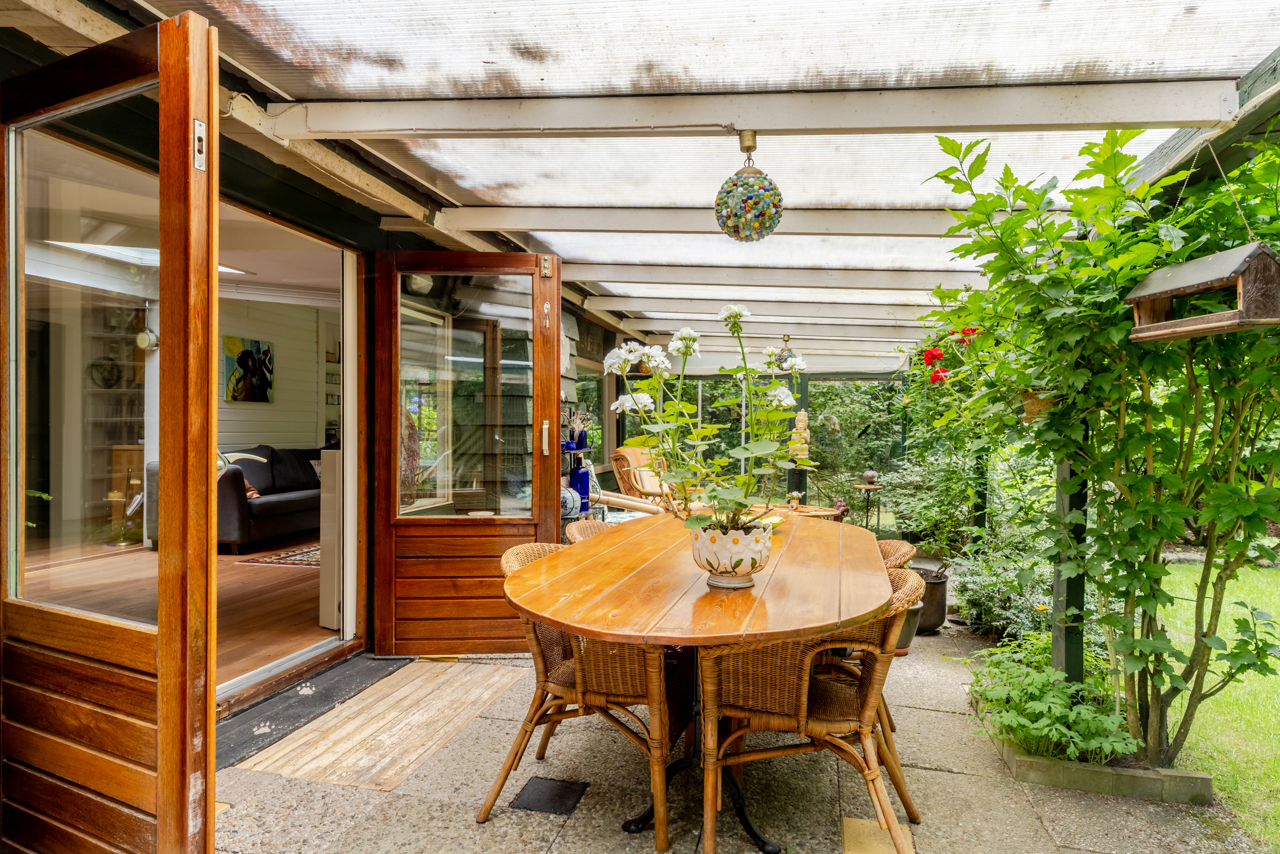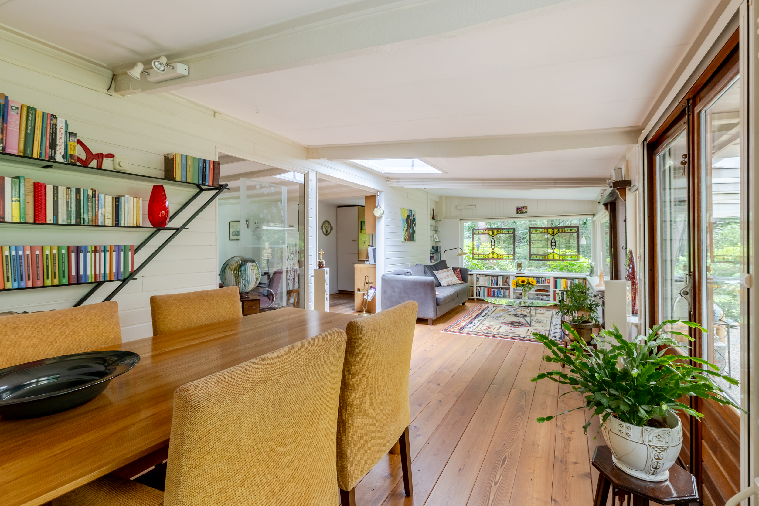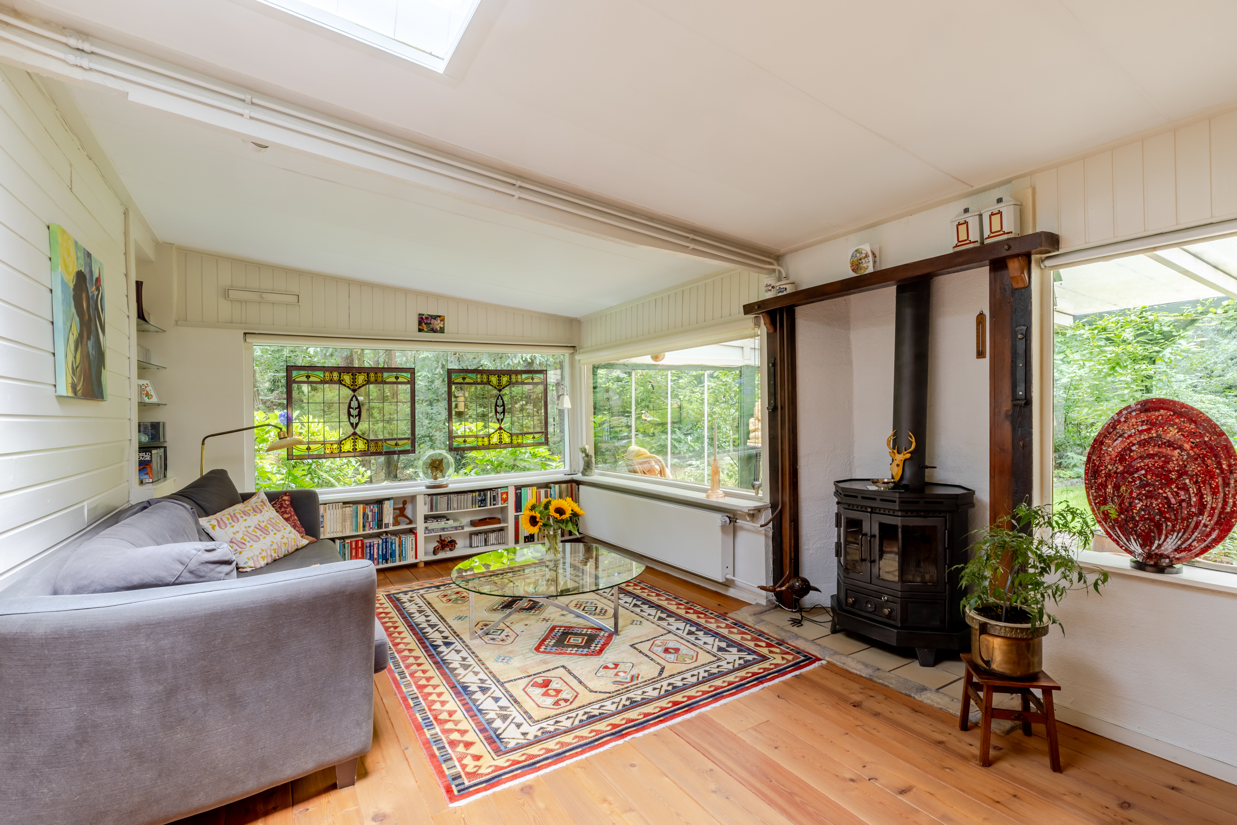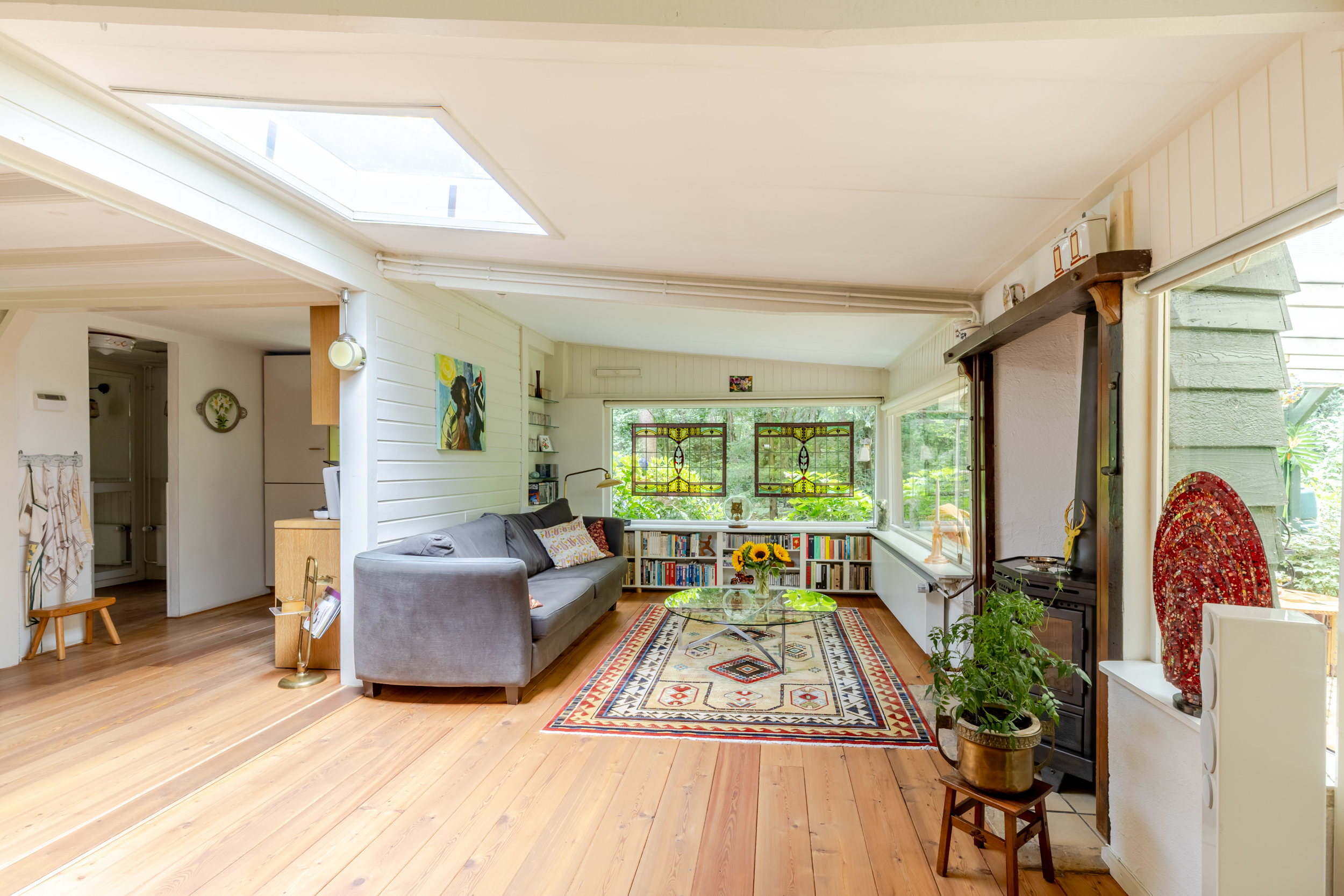 Daarnaast beschikt de woning over een bijkeuken, waar voldoende ruimte is voor een wasmachine, droger en extra opslag – praktisch en efficiënt. Aan de achterzijde van de woning bevindt zich een royale tuinkamer met lichtkoepel en houtkachel. Dit is het hele jaar een heerlijke plek om te verblijven. Vanuit deze tuinkamer stap je onder een brede overkapping zo de tuin in. Hier zit je beschut en vrij, met zicht op niets anders dan groen en vogels.