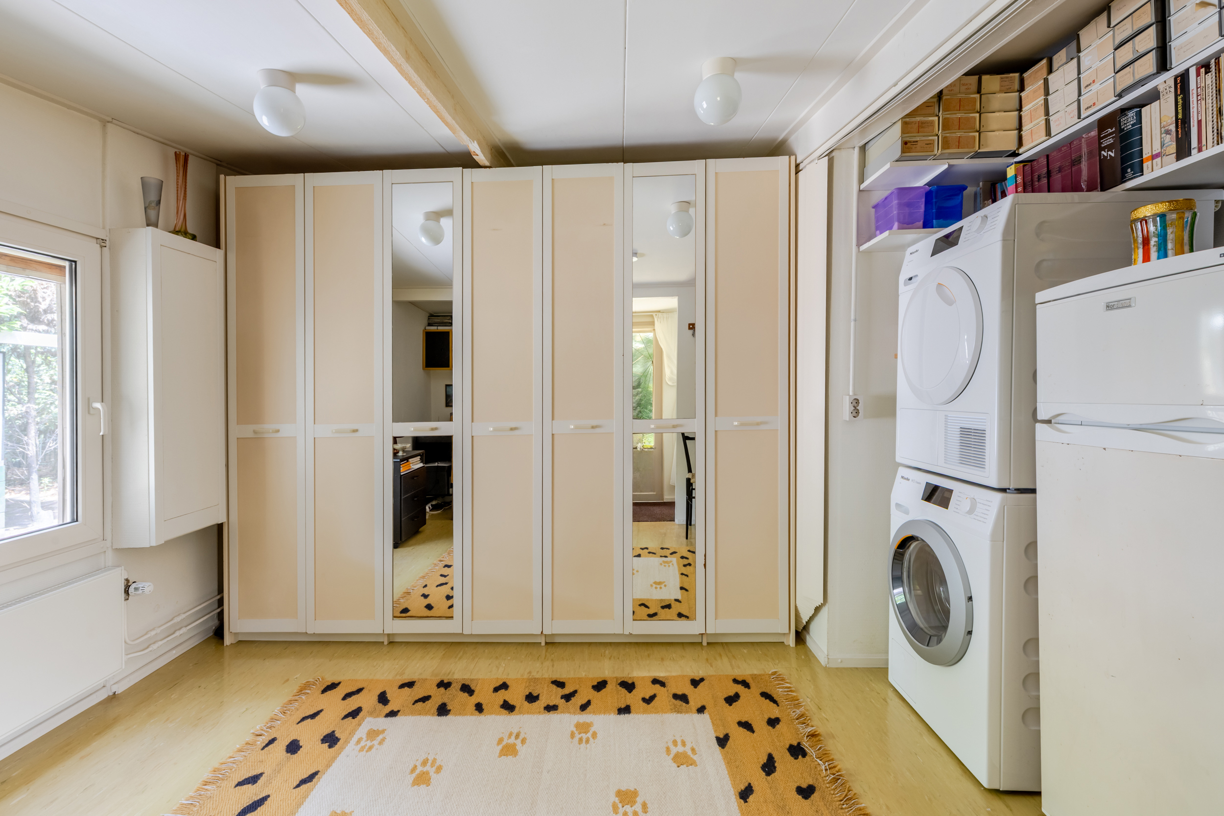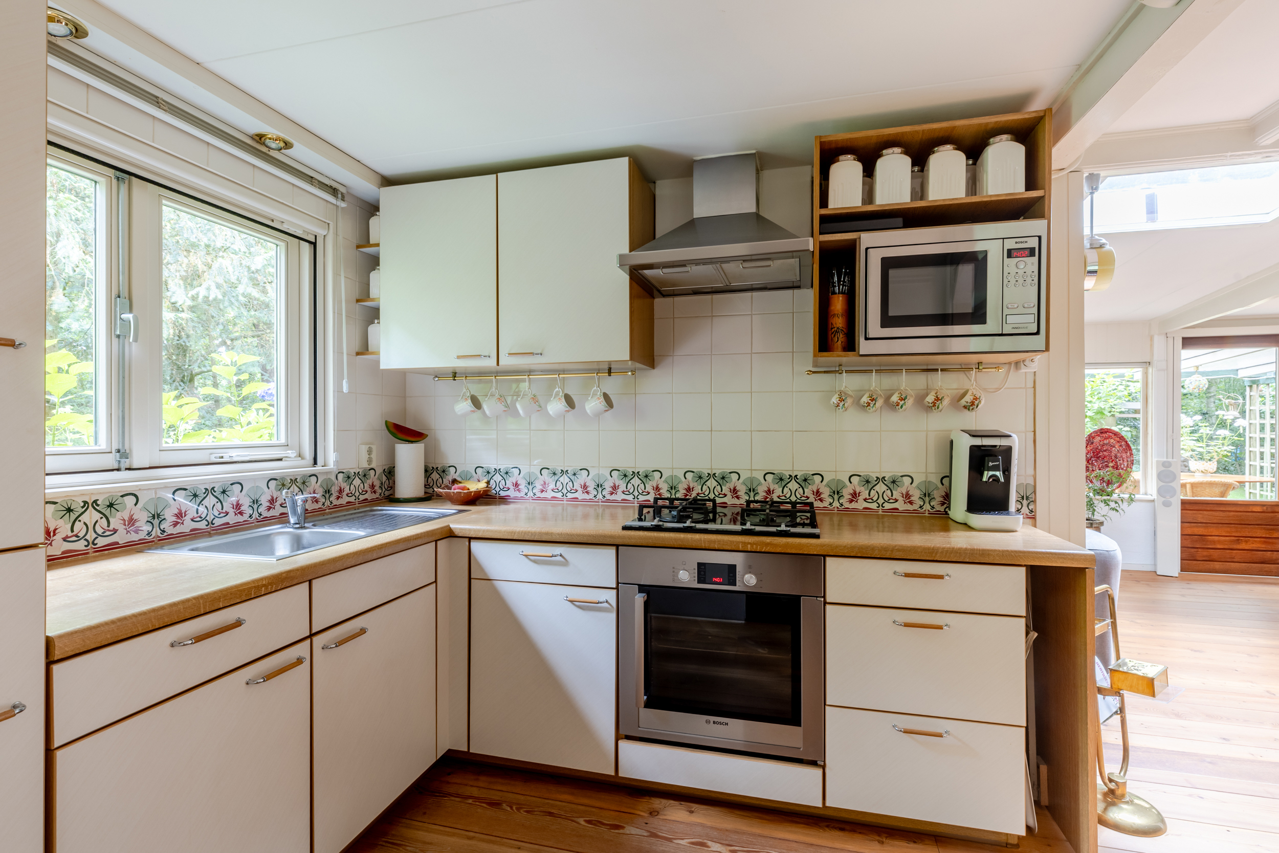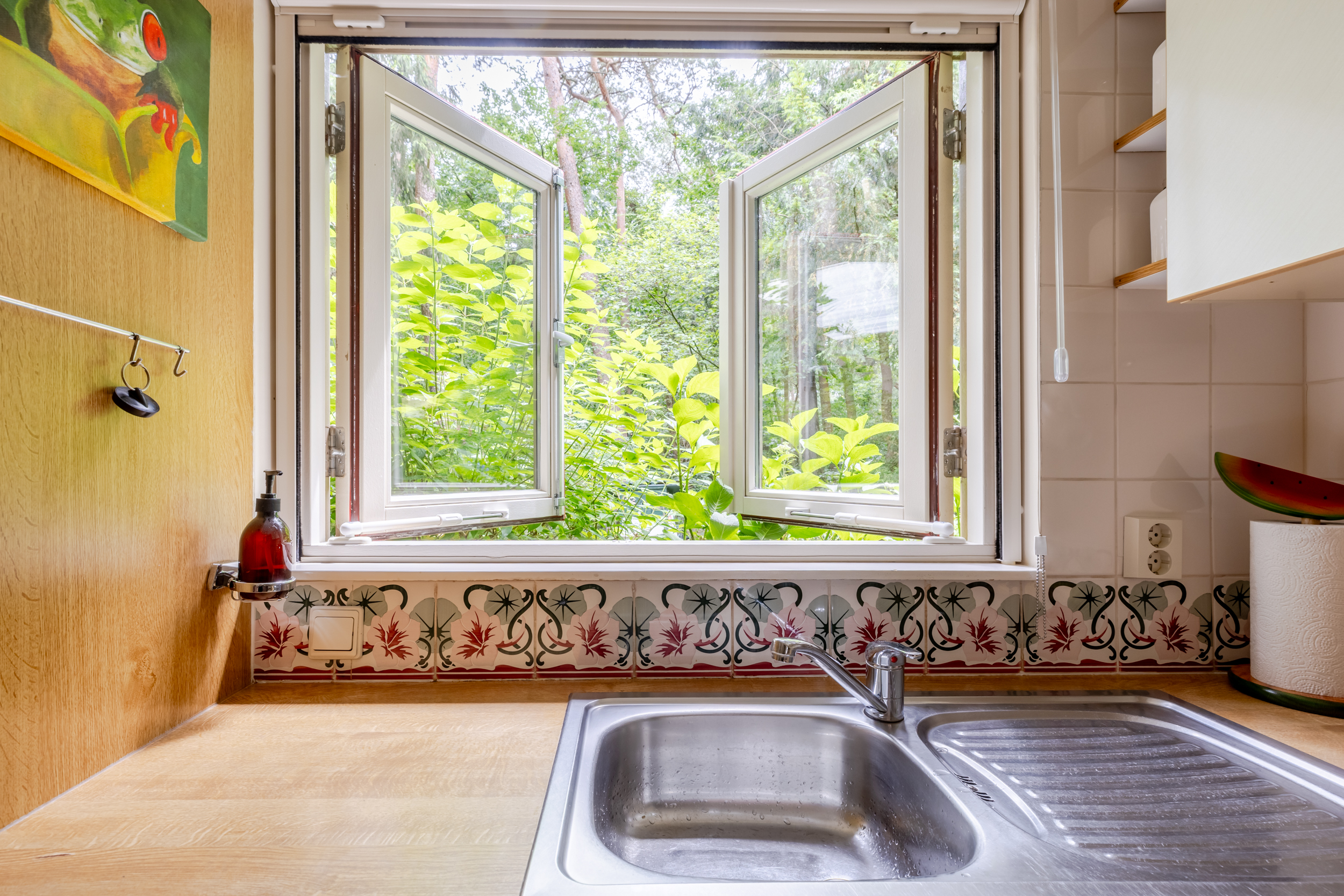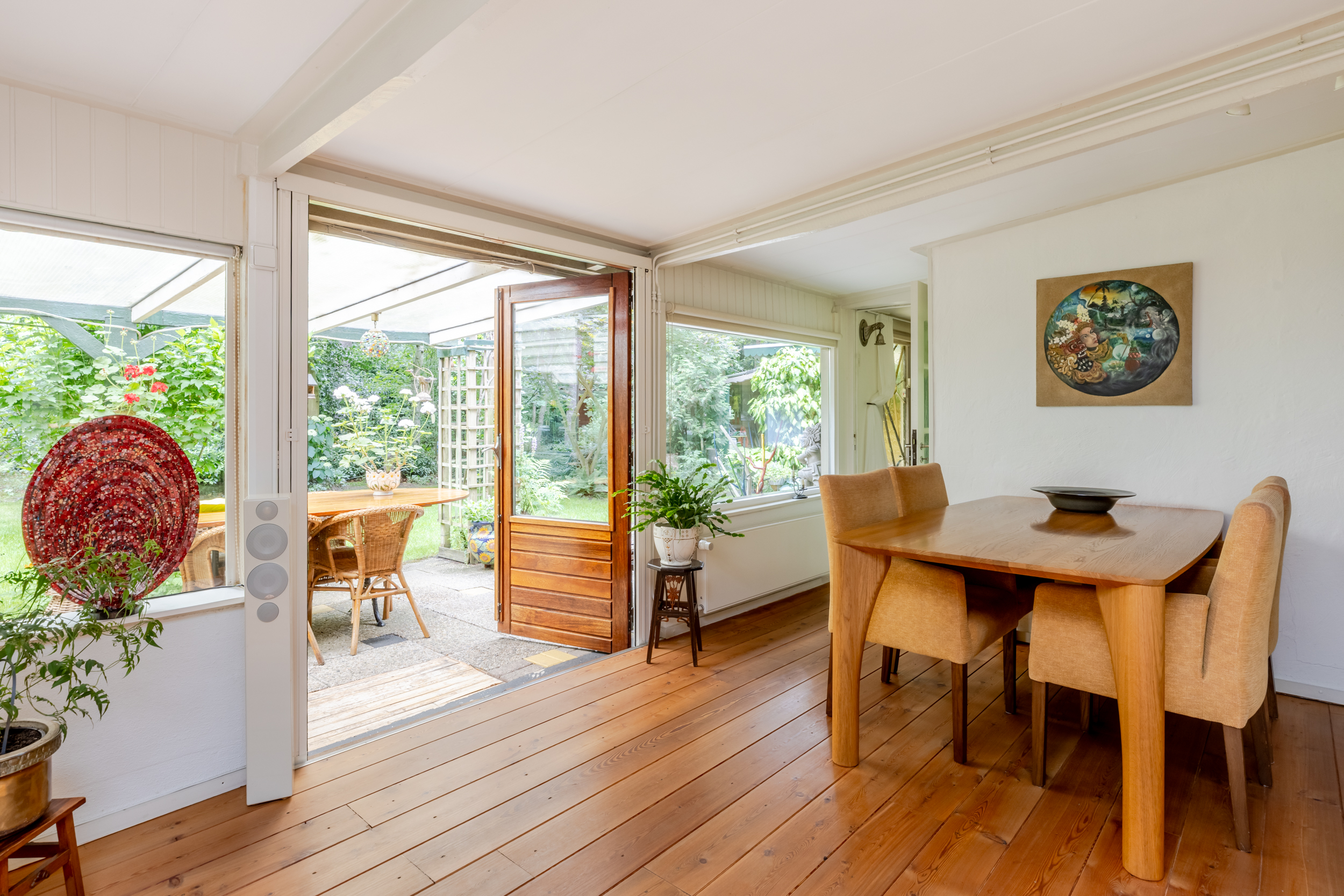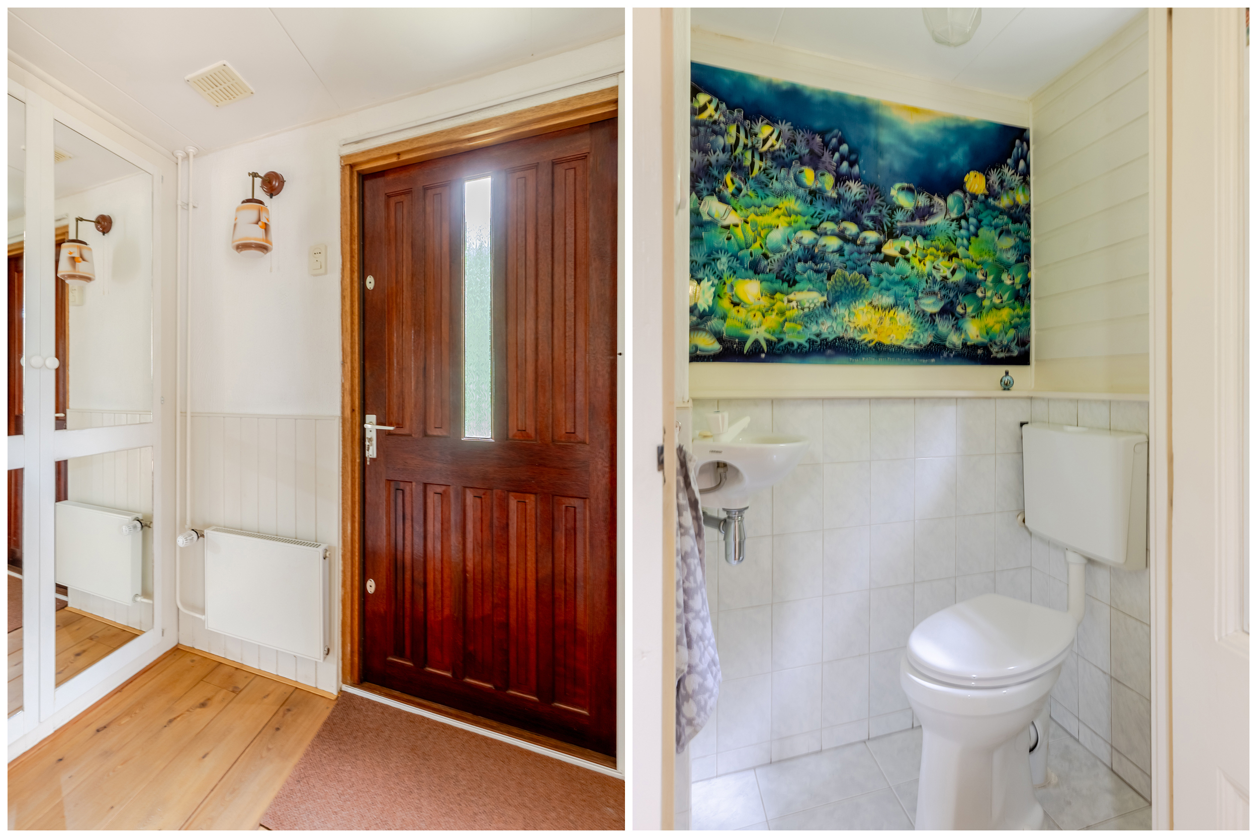 Daarnaast beschikt de woning over een bijkeuken, waar voldoende ruimte is voor een wasmachine, droger en extra opslag – praktisch en efficiënt. Aan de achterzijde van de woning bevindt zich een royale tuinkamer met lichtkoepel en houtkachel. Dit is het hele jaar een heerlijke plek om te verblijven. Vanuit deze tuinkamer stap je onder een brede overkapping zo de tuin in. Hier zit je beschut en vrij, met zicht op niets anders dan groen en vogels.