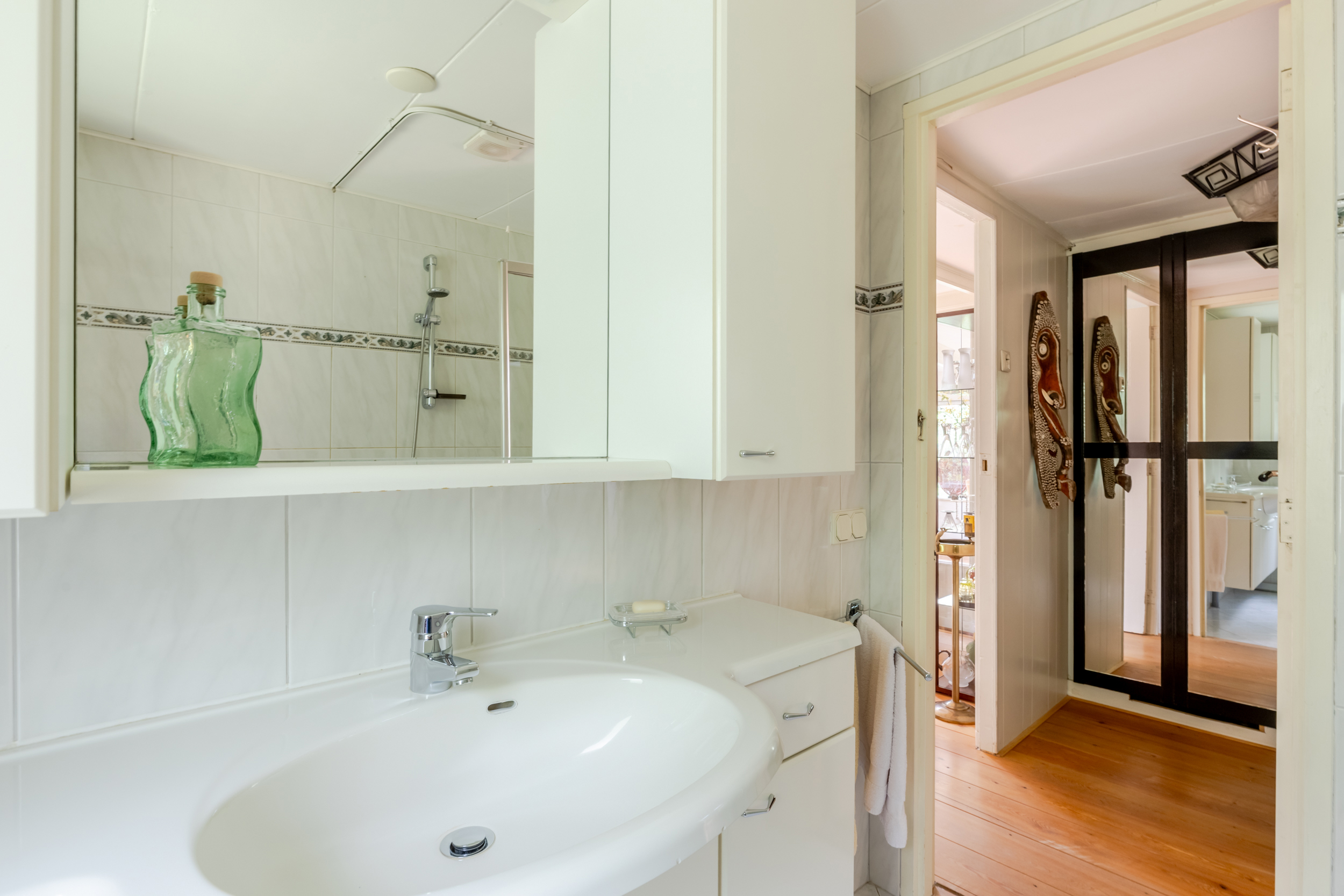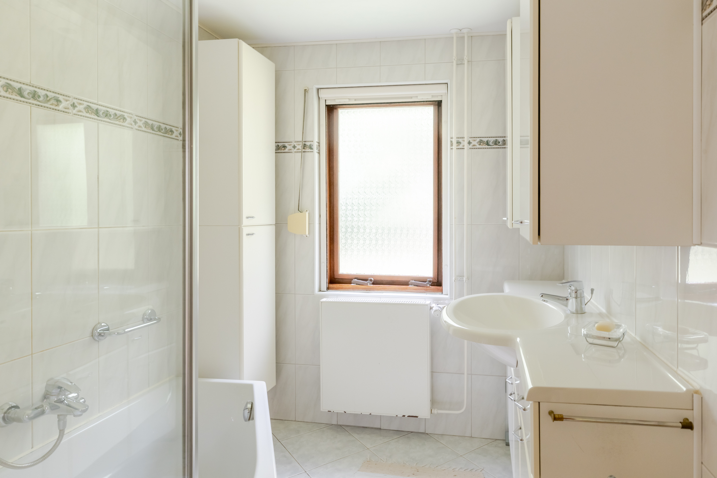 Vanuit de woonkamer is via de hal de badkamer te bereiken. Ook de badkamer is netjes en functioneel met een ligbad/douchecombinatie, een wastafelmeubel en een raam voor natuurlijke ventilatie. De ruimte is licht en overzichtelijk en vormt een fijne plek voor het dagelijks comfort.