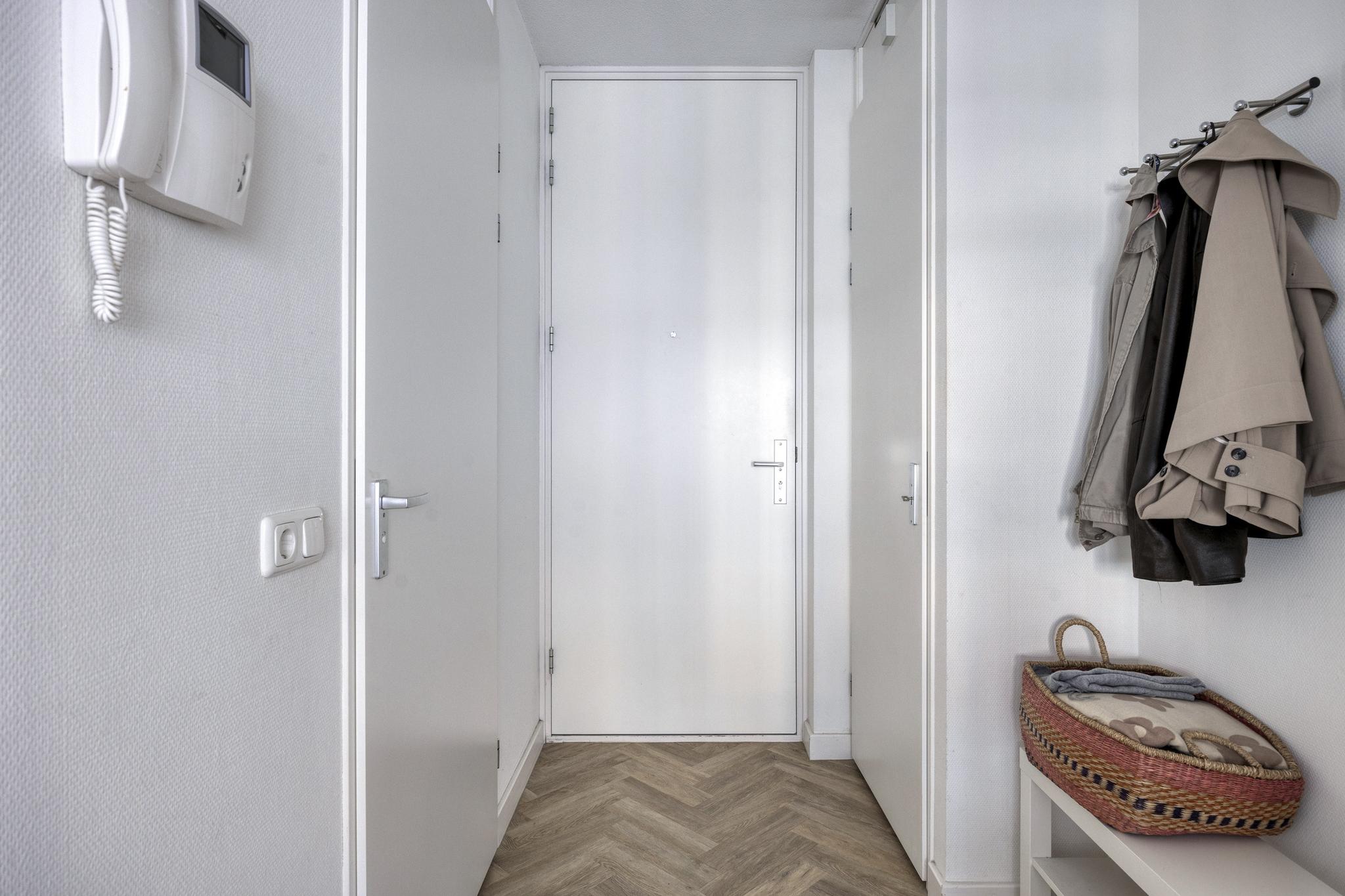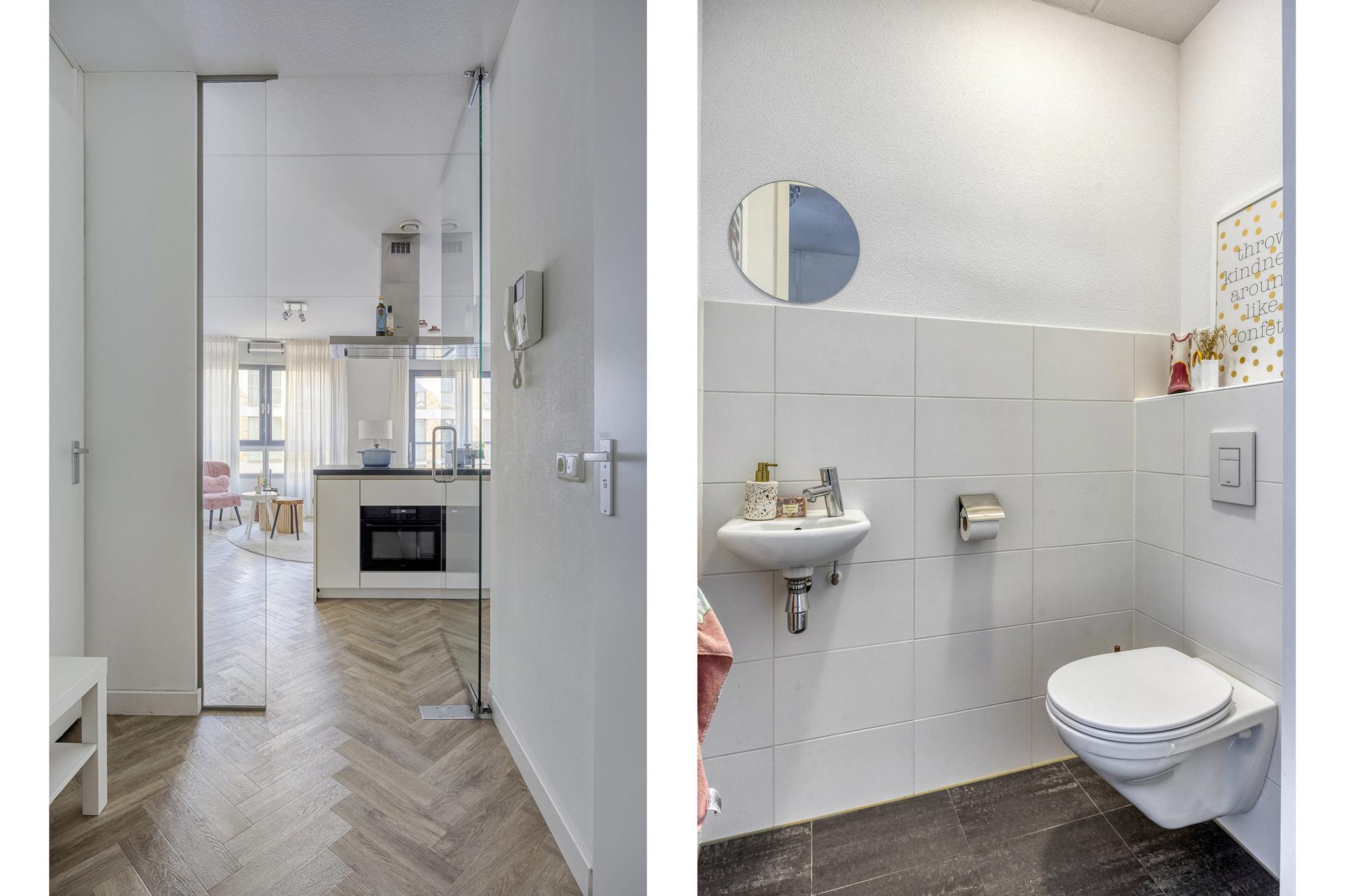 Bij binnenkomst in het appartement merk je direct de luxe die dit appartement te bieden heeft. De jassen kun je mooi ophangen in de daarvoor bestemde nis en het toilet is als modern te omschrijven met een wandcloset, fonteintje en gedeeltelijk betegeld. In de bergkast treffen we de mechanische ventilatie unit en de stadsverwarmingsunit.