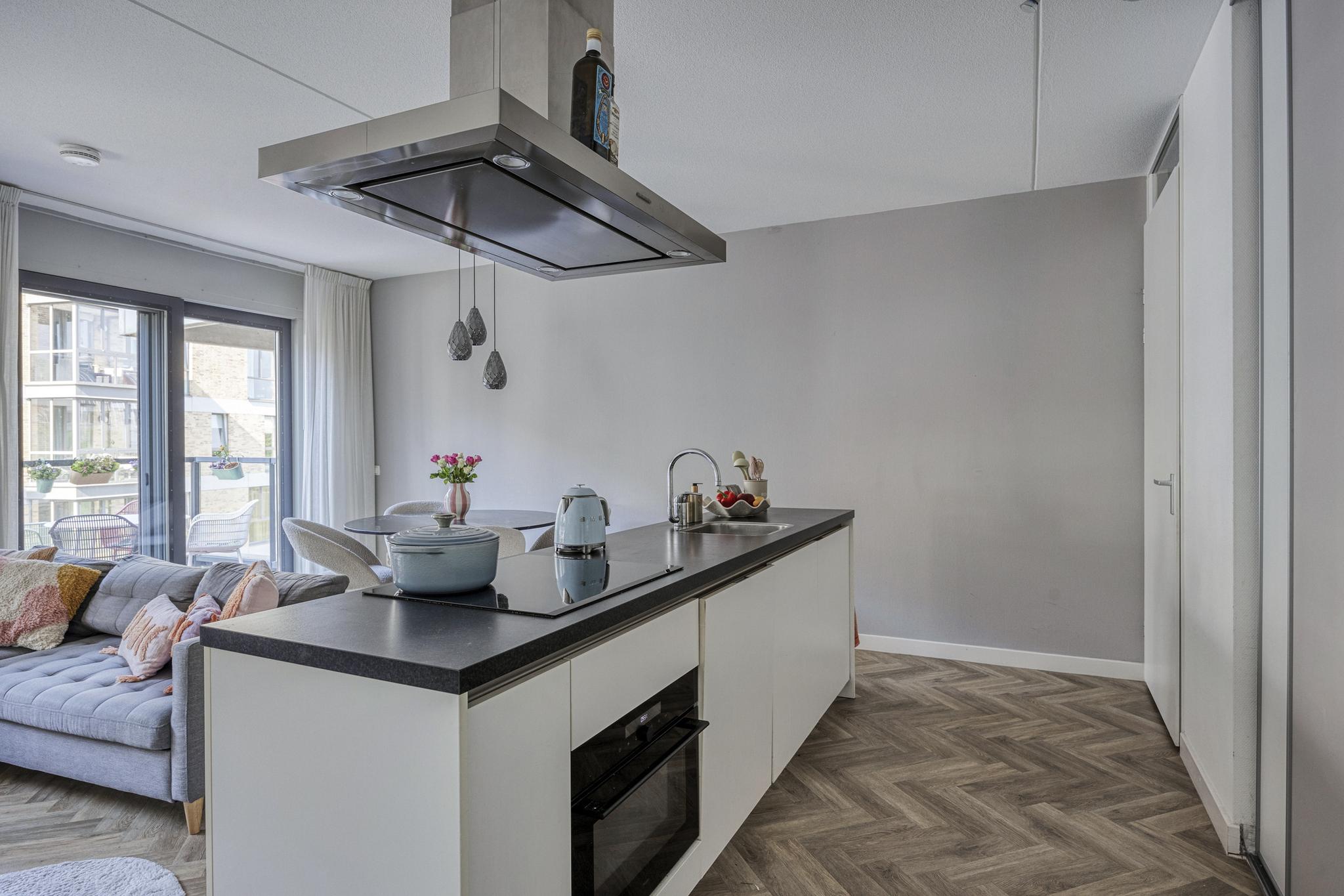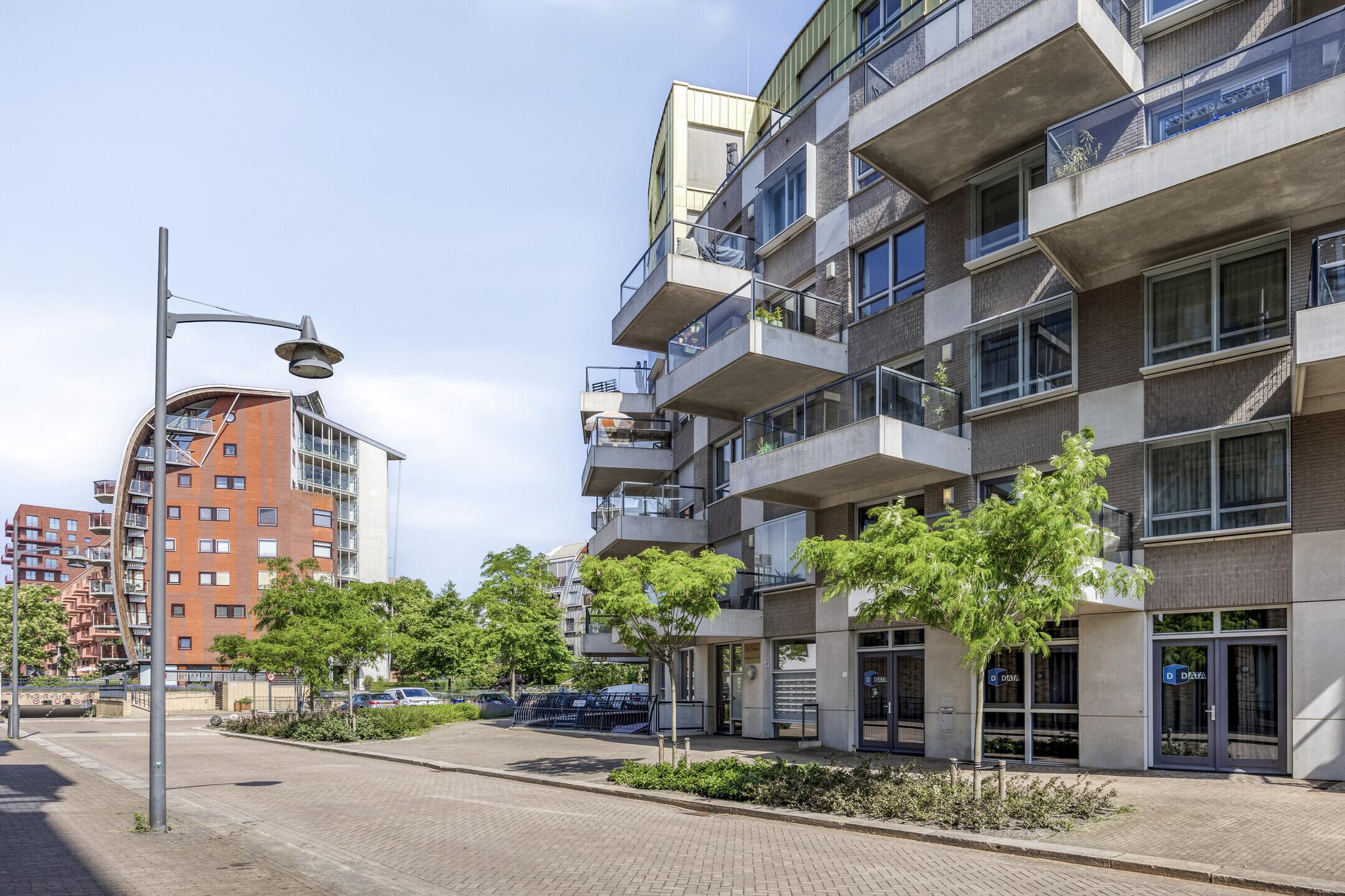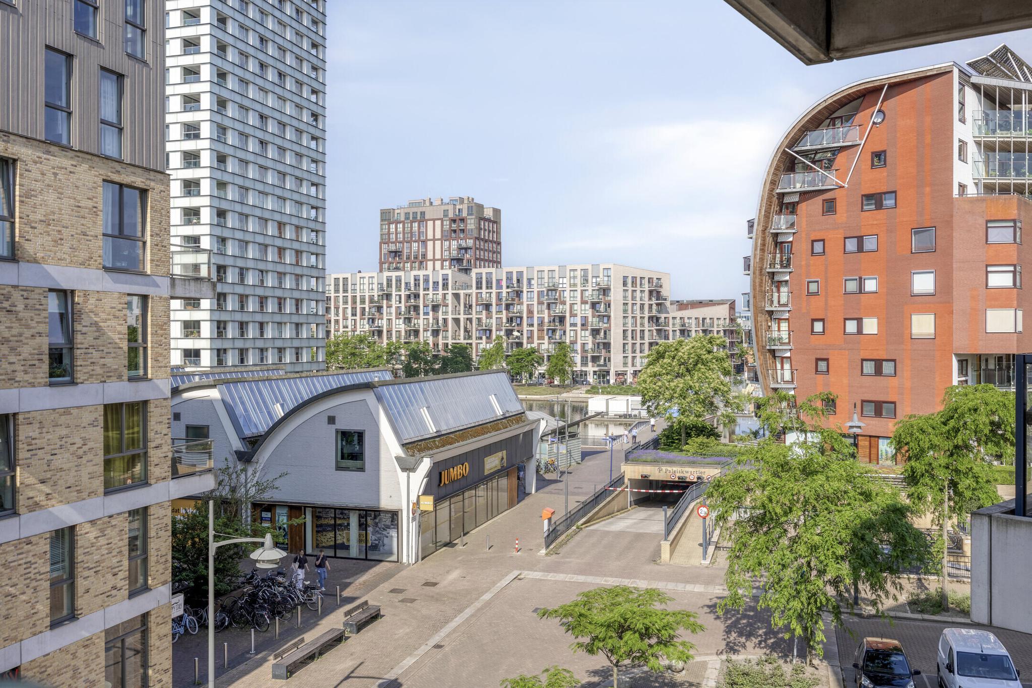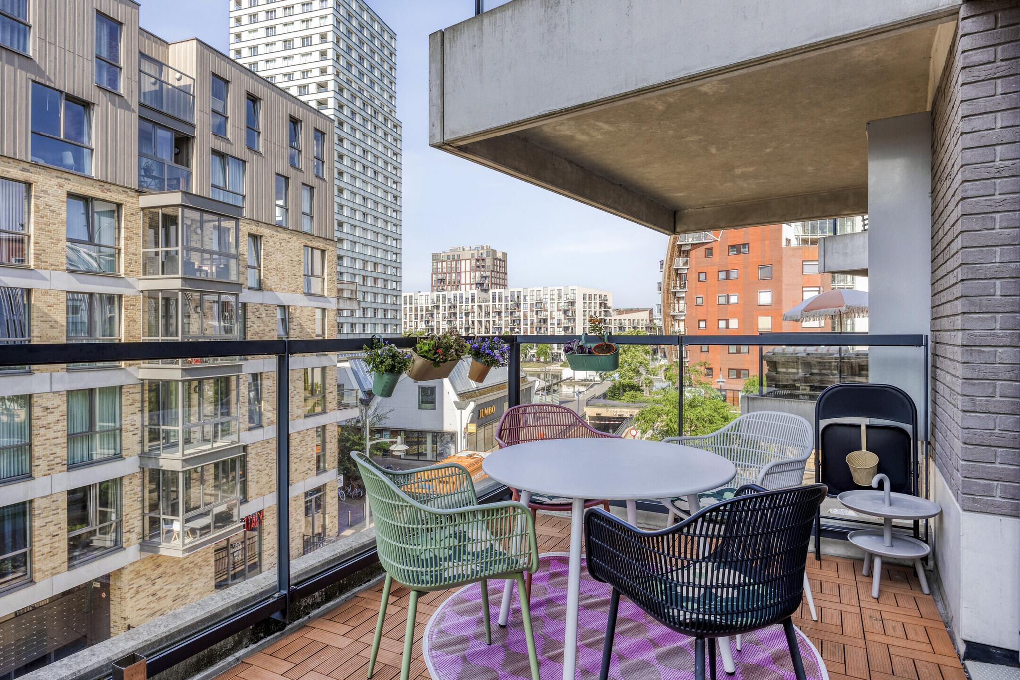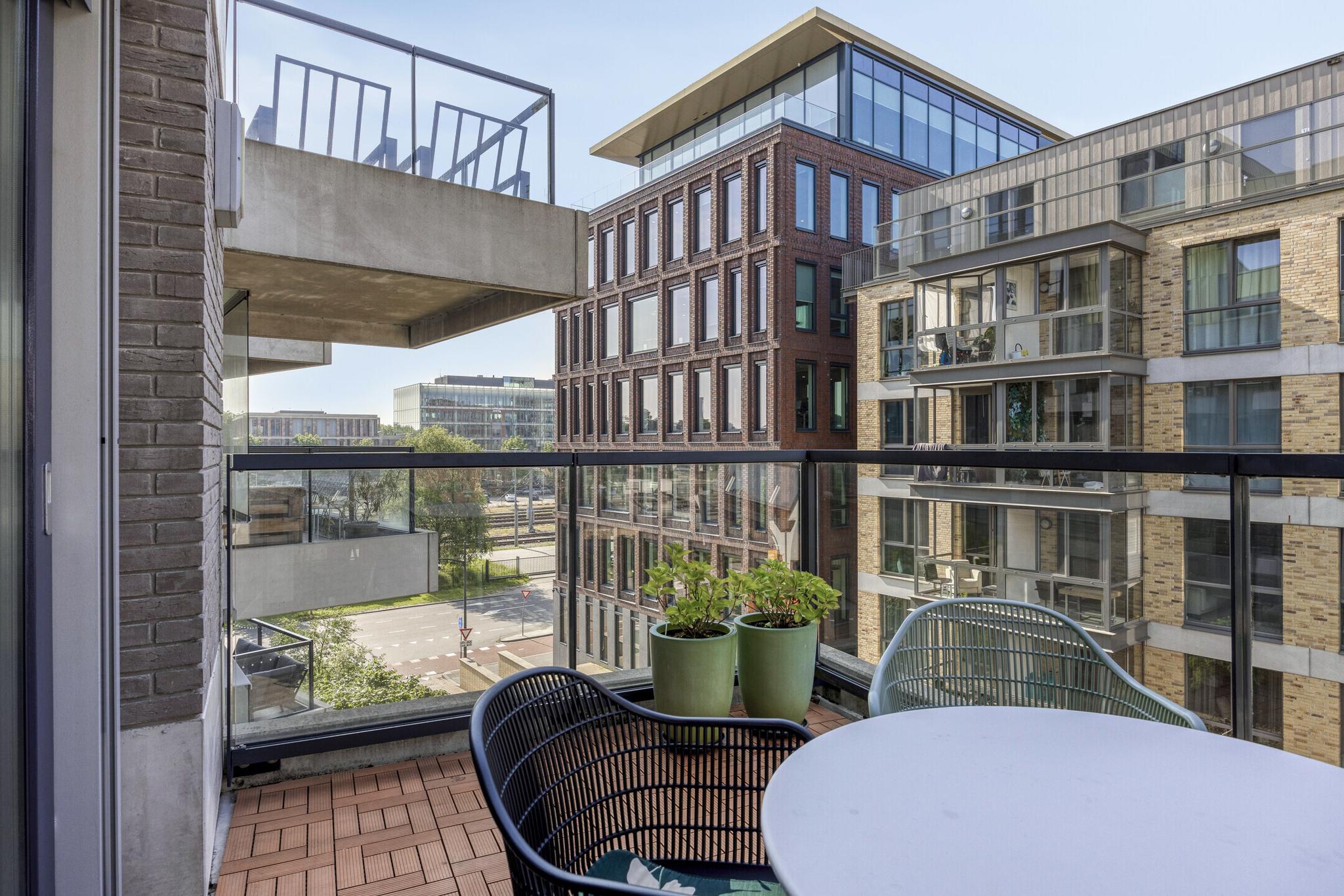 Via een schuifpui bereik je het ruime balkon. Door de zuidwestelijke ligging heb je aan zon geen gebrek. Hier heb je een fantastisch zicht over het Paleiskwartier en kun je eindeloos genieten van het stadse leven om je heen.