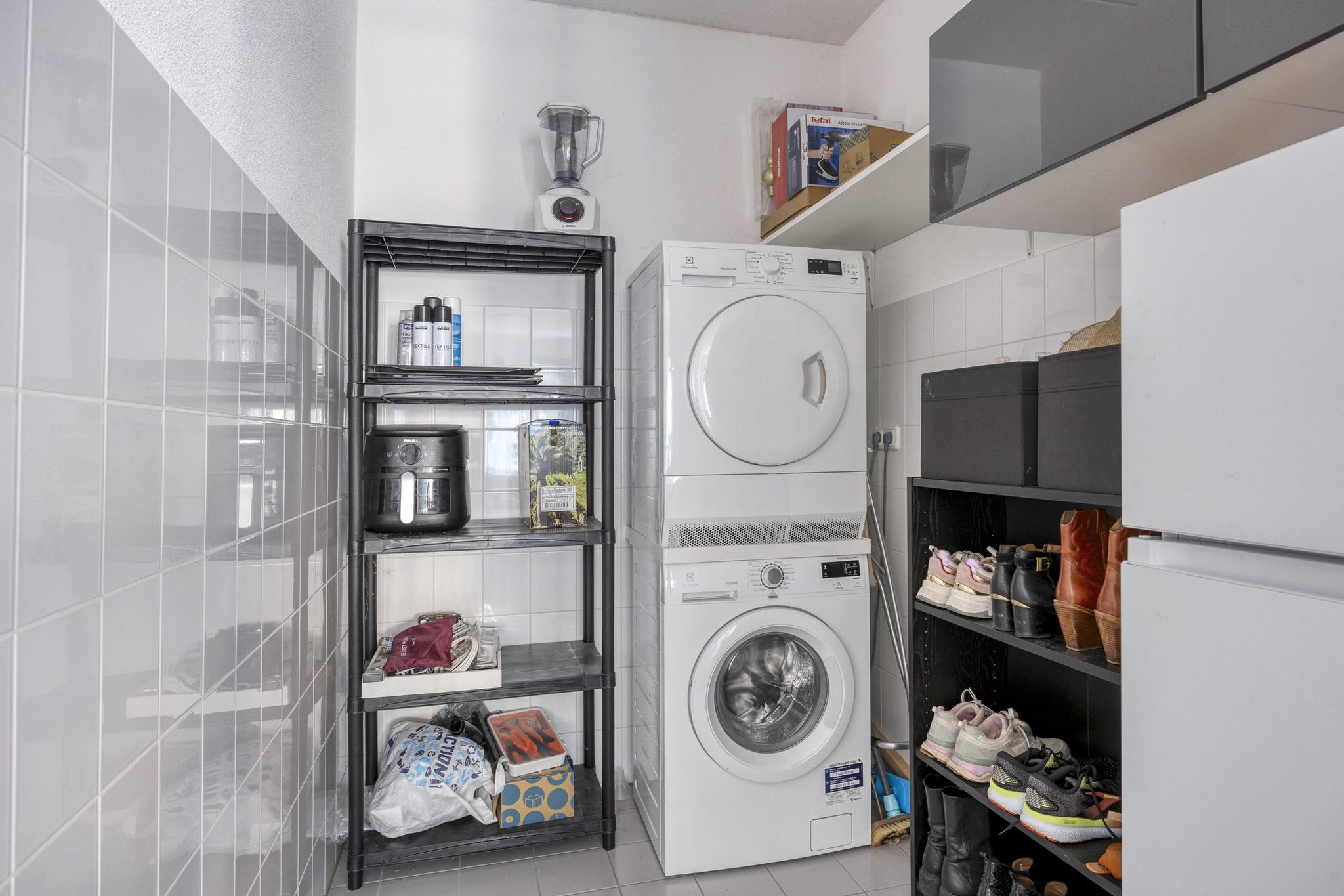 Het kookeiland zorgt voor een gezellige scheiding van de keuken en de woonkamer. De keuken is zeer compleet met diverse inbouwapparatuur in het kookeiland zoals een inductie kookplaat, afzuigkap, koelkast, een combi-oven/magnetron en een vaatwasser. Enorm praktisch zijn de stopcontacten die uit het strakke aanrechtblad komen. In de keuken is een nis aanwezig waar een maatwerkkast is gemaakt. Daarnaast is er nog veel bergruimte in de grote inpandige berging die aan de keuken grenst. Ook is hier ruimte voor de wasmachine/droger.