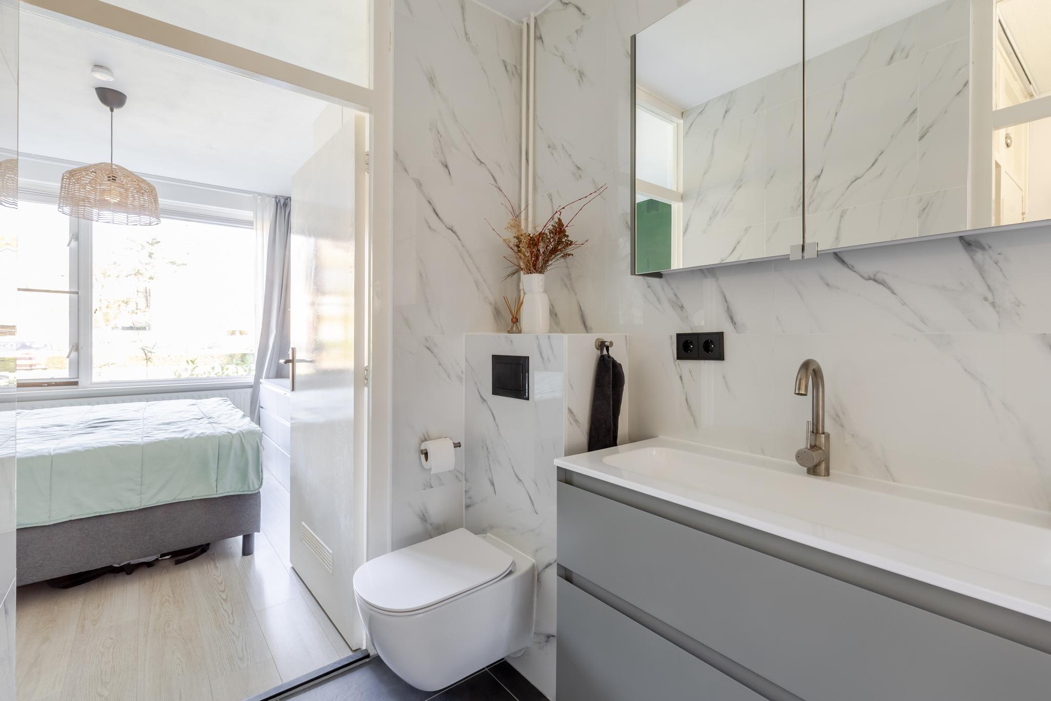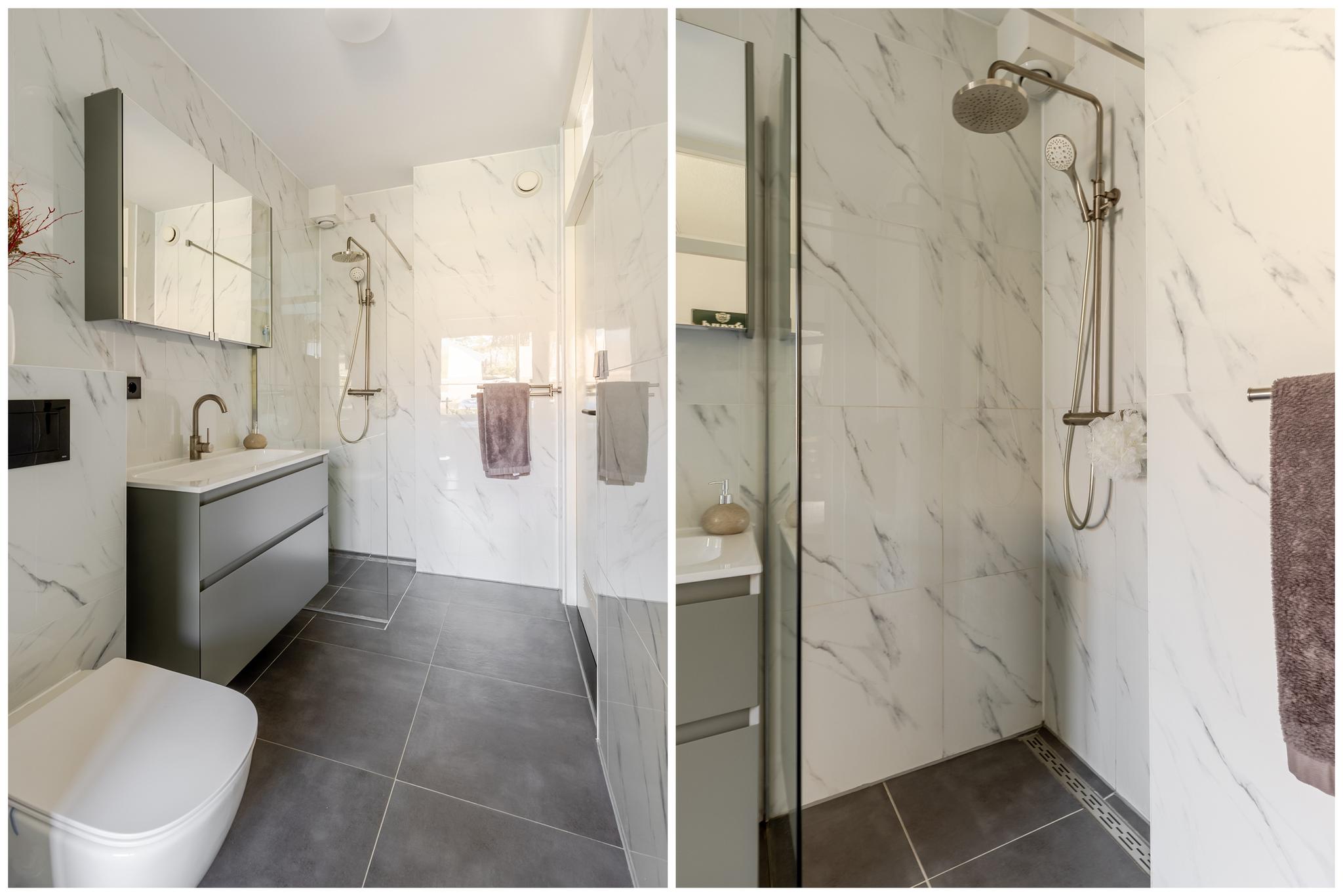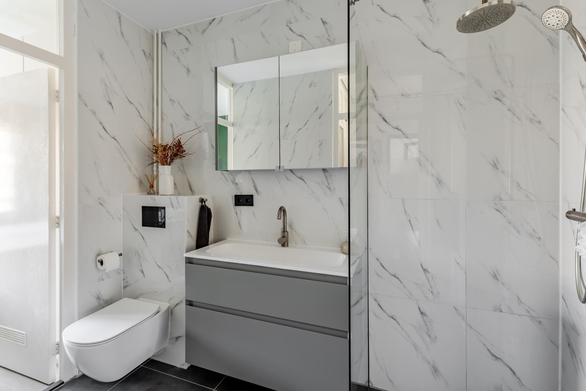 De badkamer is in 2023 volledig vernieuwd en stijlvol afgewerkt met licht marmeren wandtegels en een donkergrijze tegelvloer. De ruimte is uitgerust met een modern zwevend toilet, een strak wastafelmeubel en een comfortabele inloopdouche. Direct naast de voordeur bevindt zich bovendien een praktische, eigen berging.