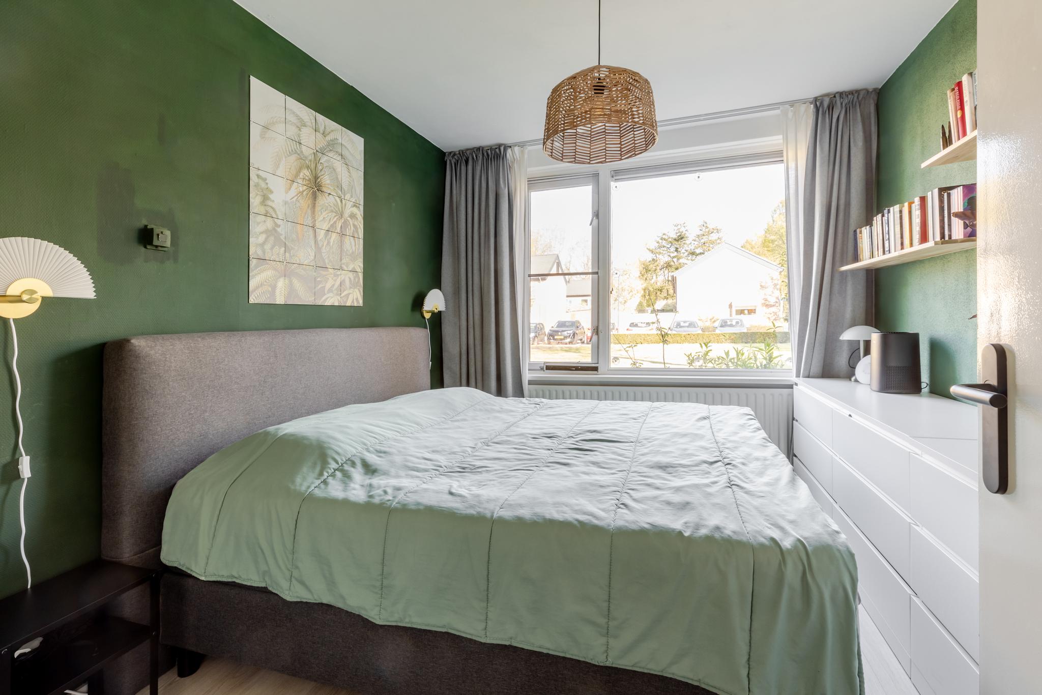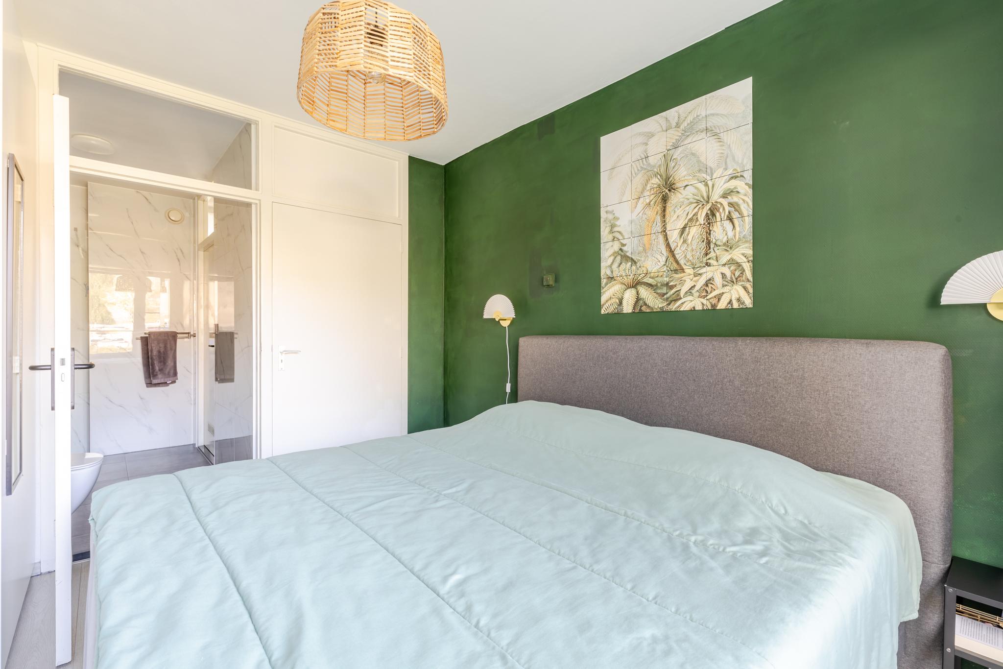 De slaapkamer is bereikbaar via de badkamer en beschikt dankzij de grote raampartij over veel natuurlijk licht.