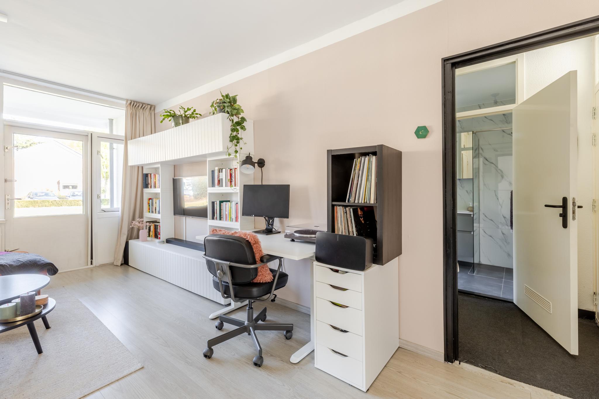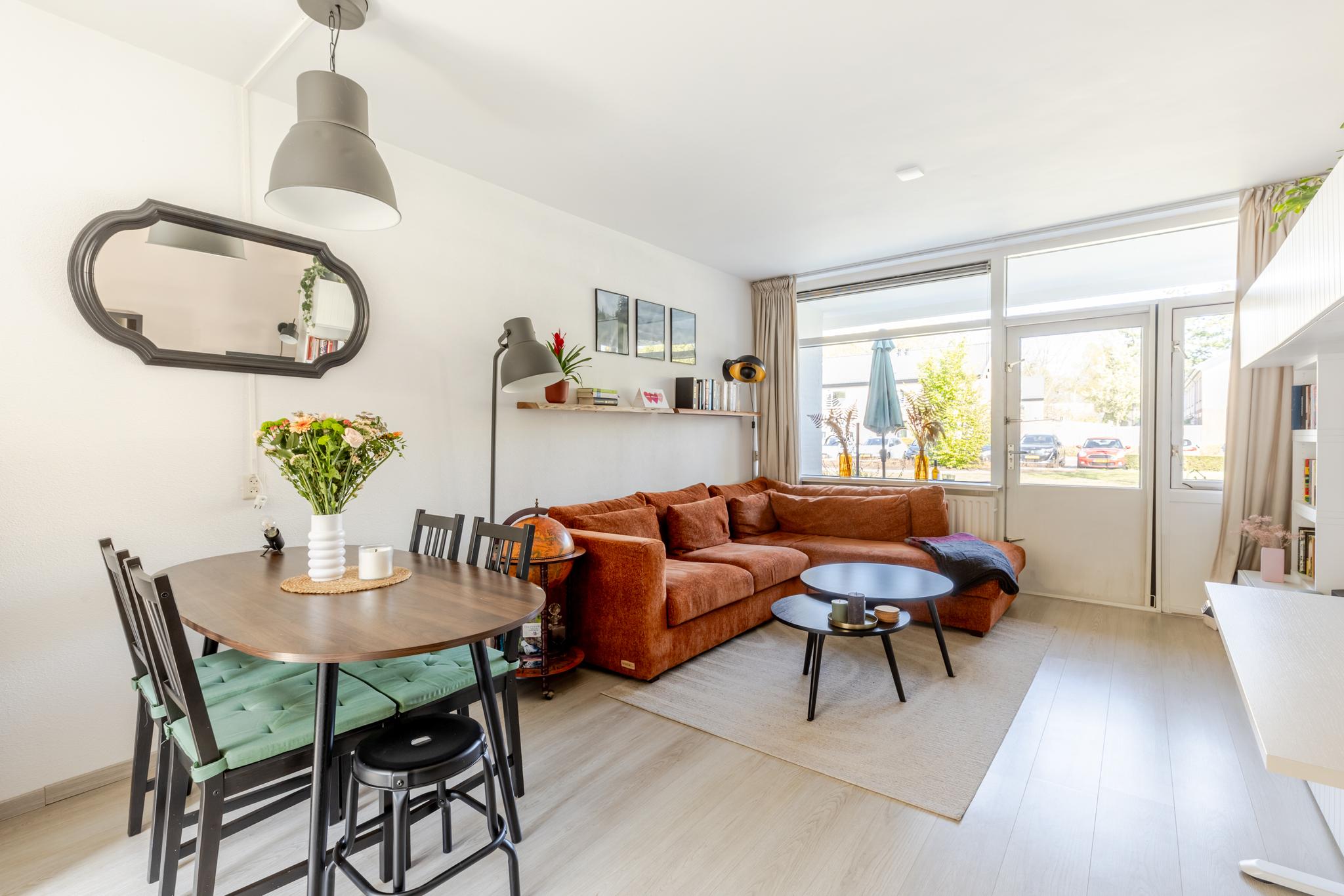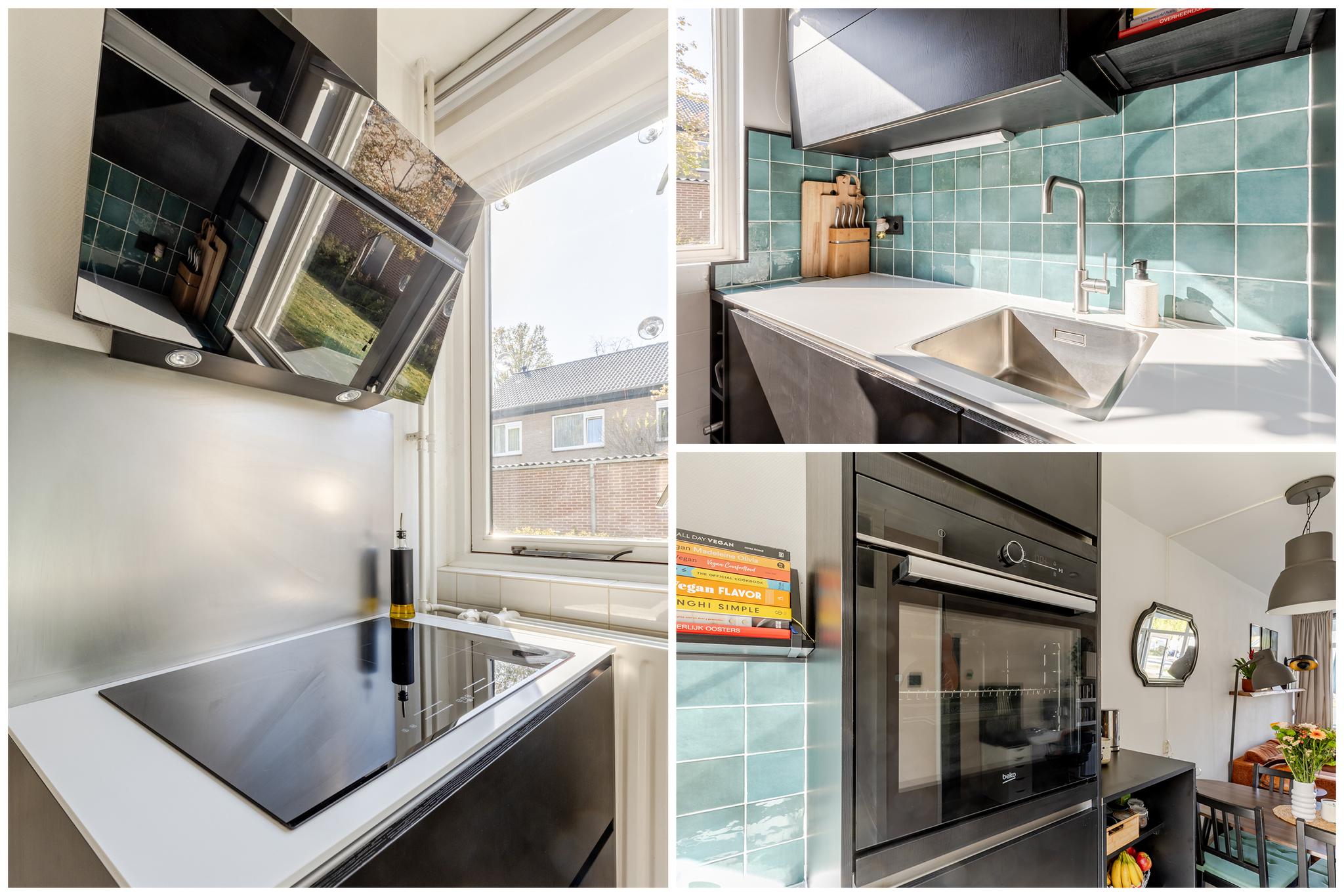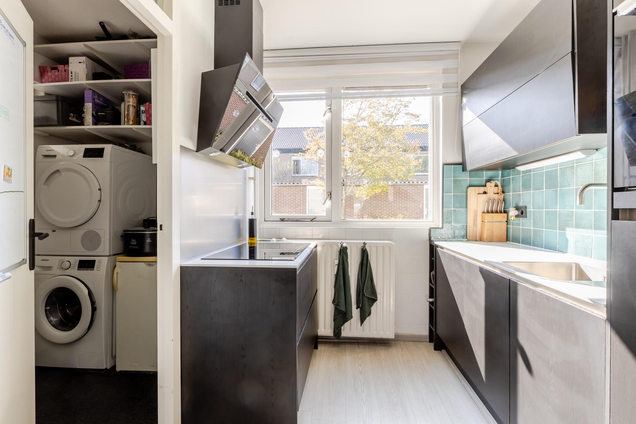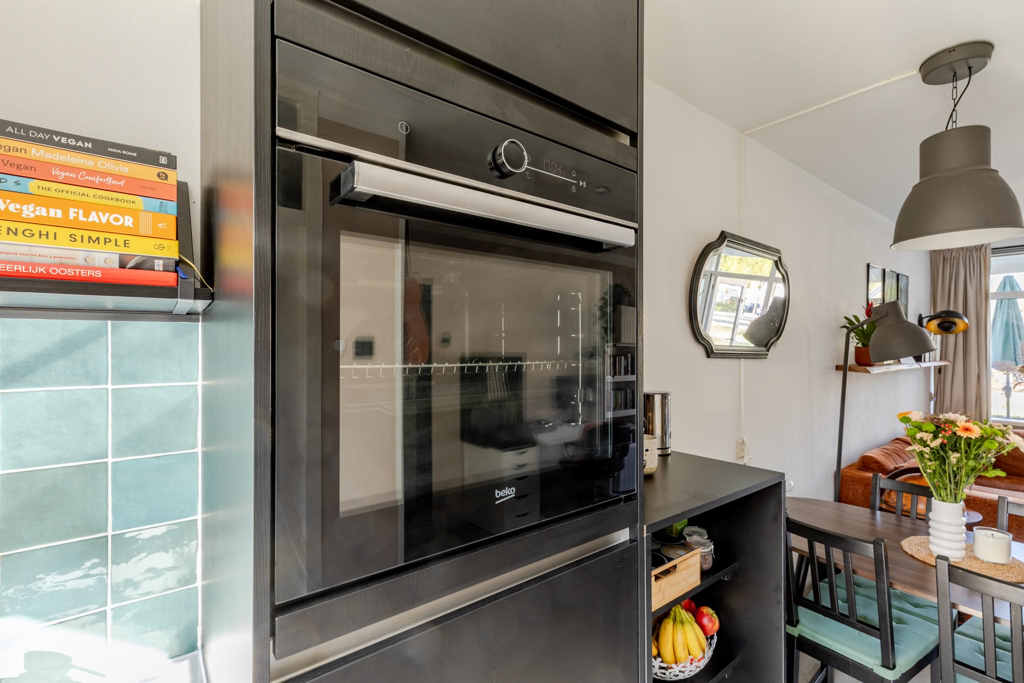 De woonkamer is tuingericht en biedt toegang tot de open keuken. Deze keuken uit 2023 is praktisch en efficiënt ingedeeld en voorzien van moderne inbouwapparatuur, waaronder een inductiekookplaat, spoelbak, ingebouwde koelkast en combimagnetron. Daarnaast is er volop opbergruimte dankzij de strakke boven- en onderkasten, wat zorgt voor een opgeruimd en functioneel geheel.