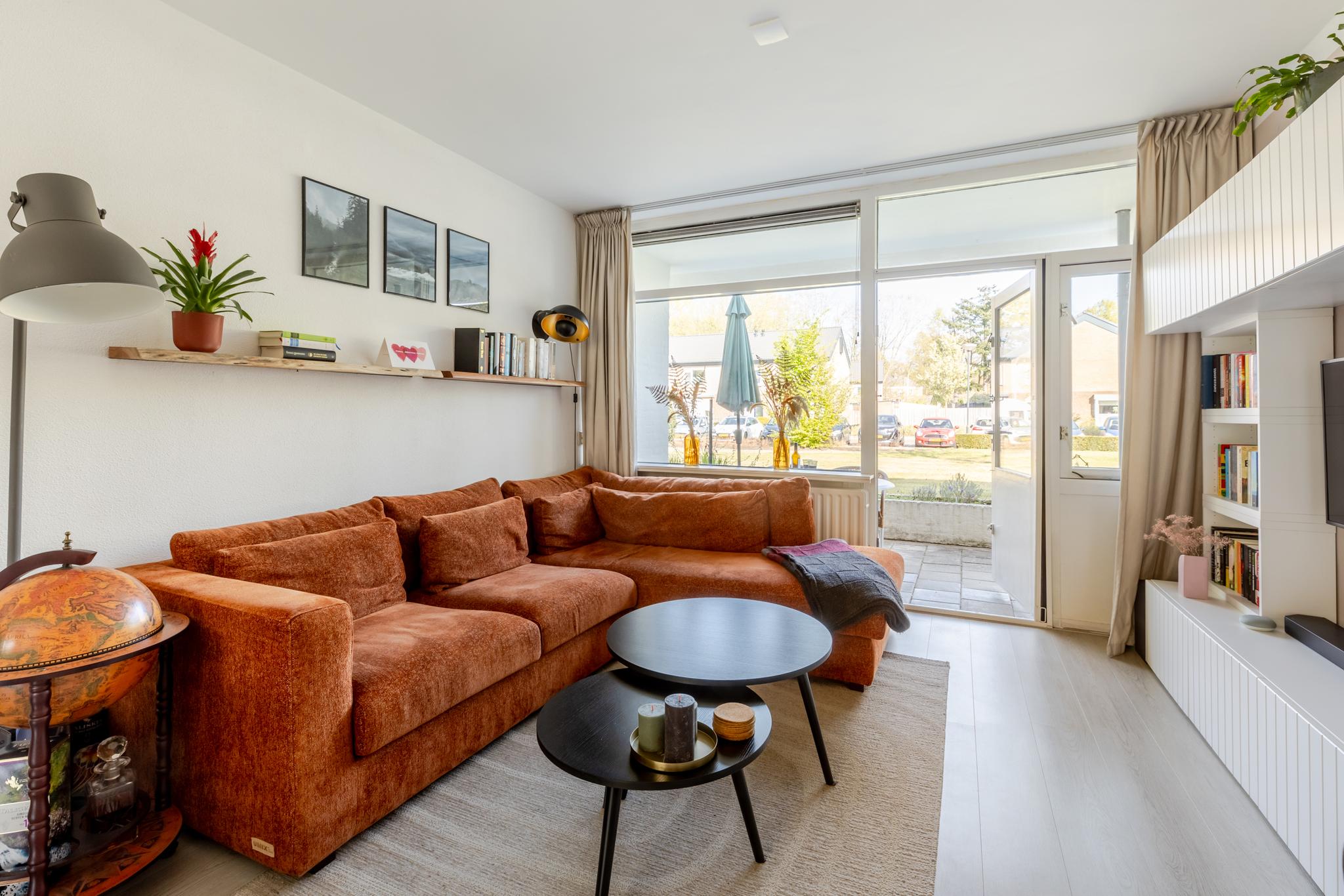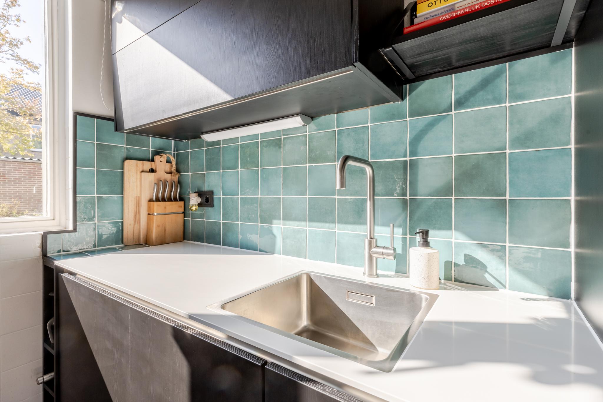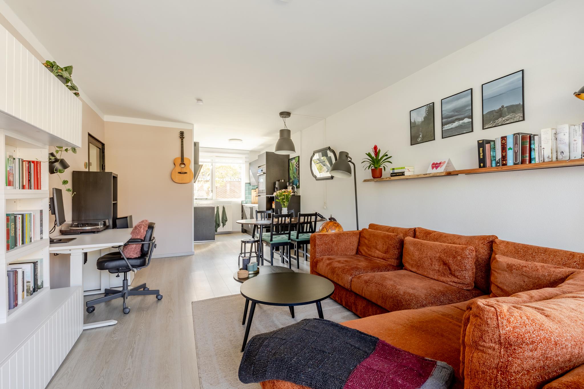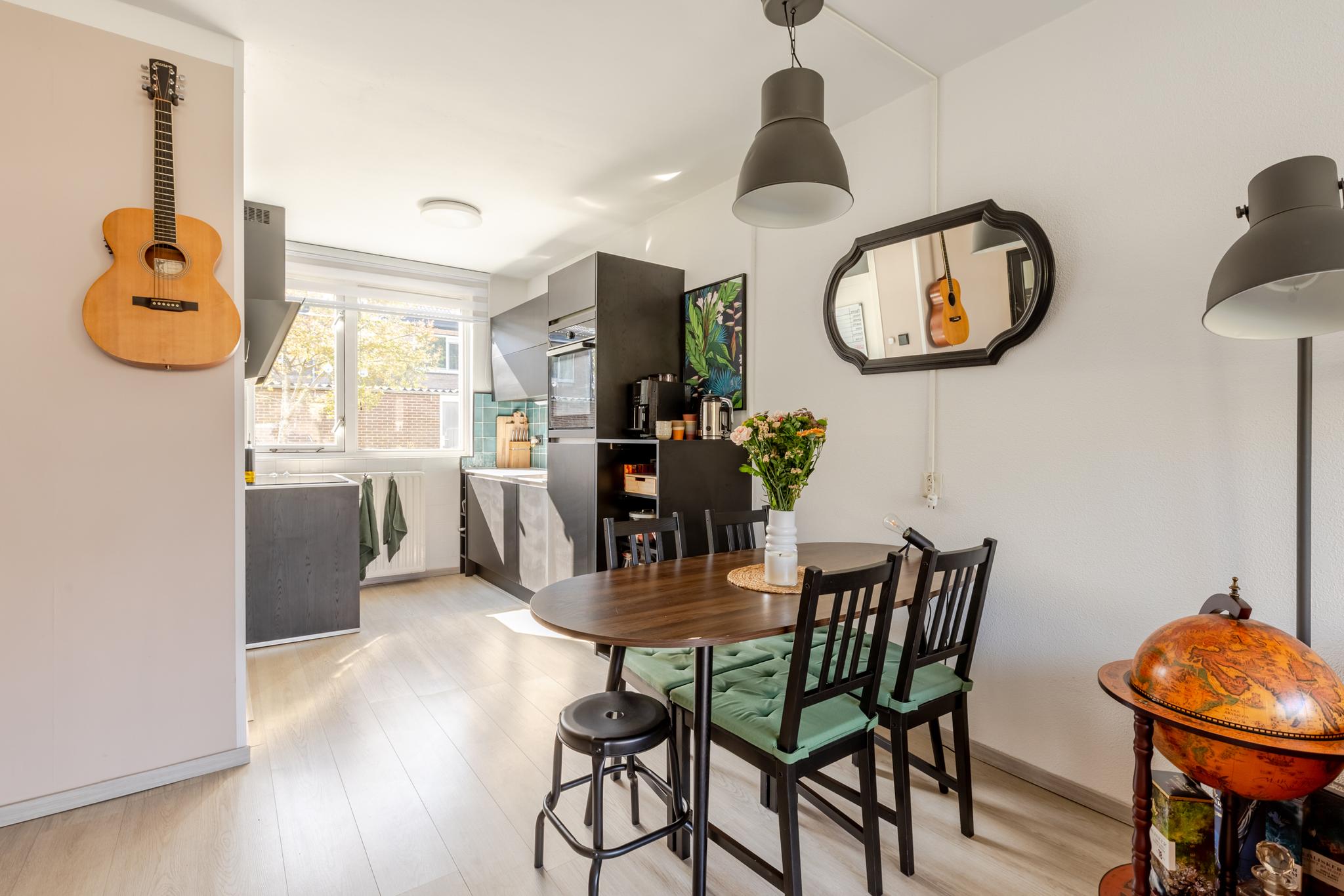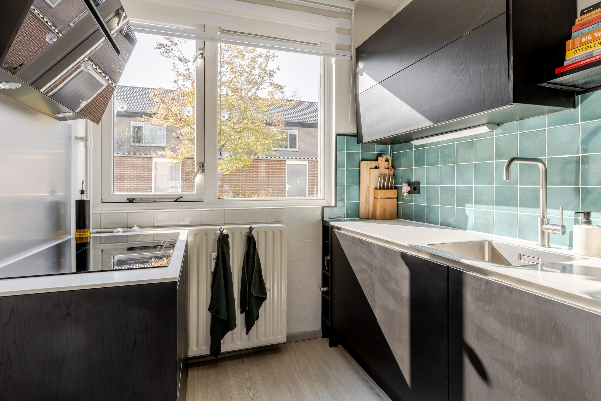 De woonkamer is tuingericht en biedt toegang tot de open keuken. Deze keuken uit 2023 is praktisch en efficiënt ingedeeld en voorzien van moderne inbouwapparatuur, waaronder een inductiekookplaat, spoelbak, ingebouwde koelkast en combimagnetron. Daarnaast is er volop opbergruimte dankzij de strakke boven- en onderkasten, wat zorgt voor een opgeruimd en functioneel geheel.