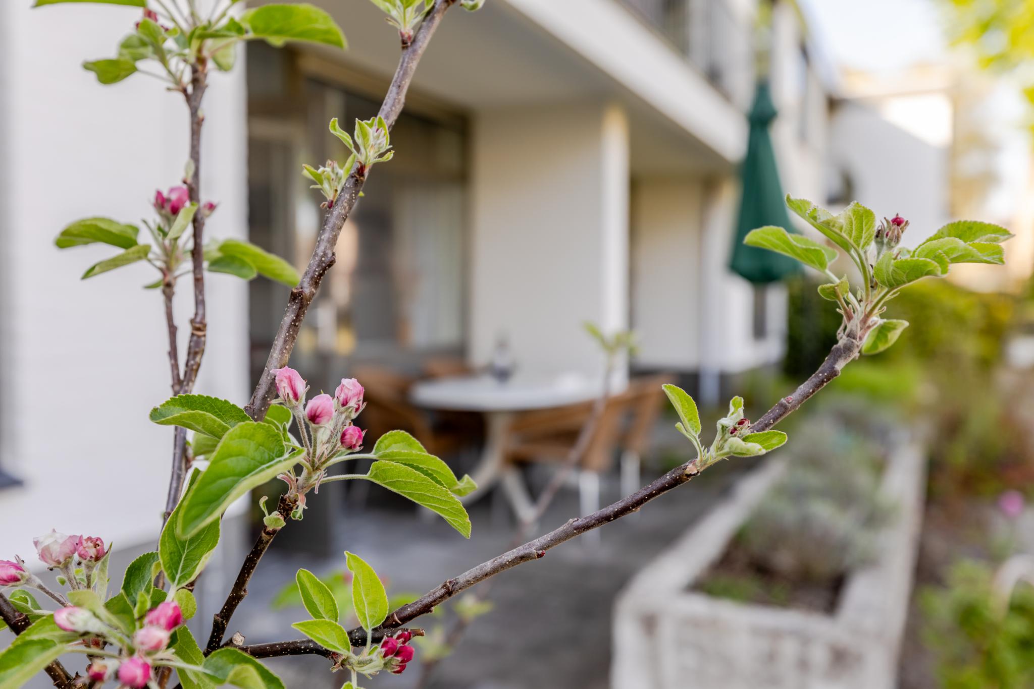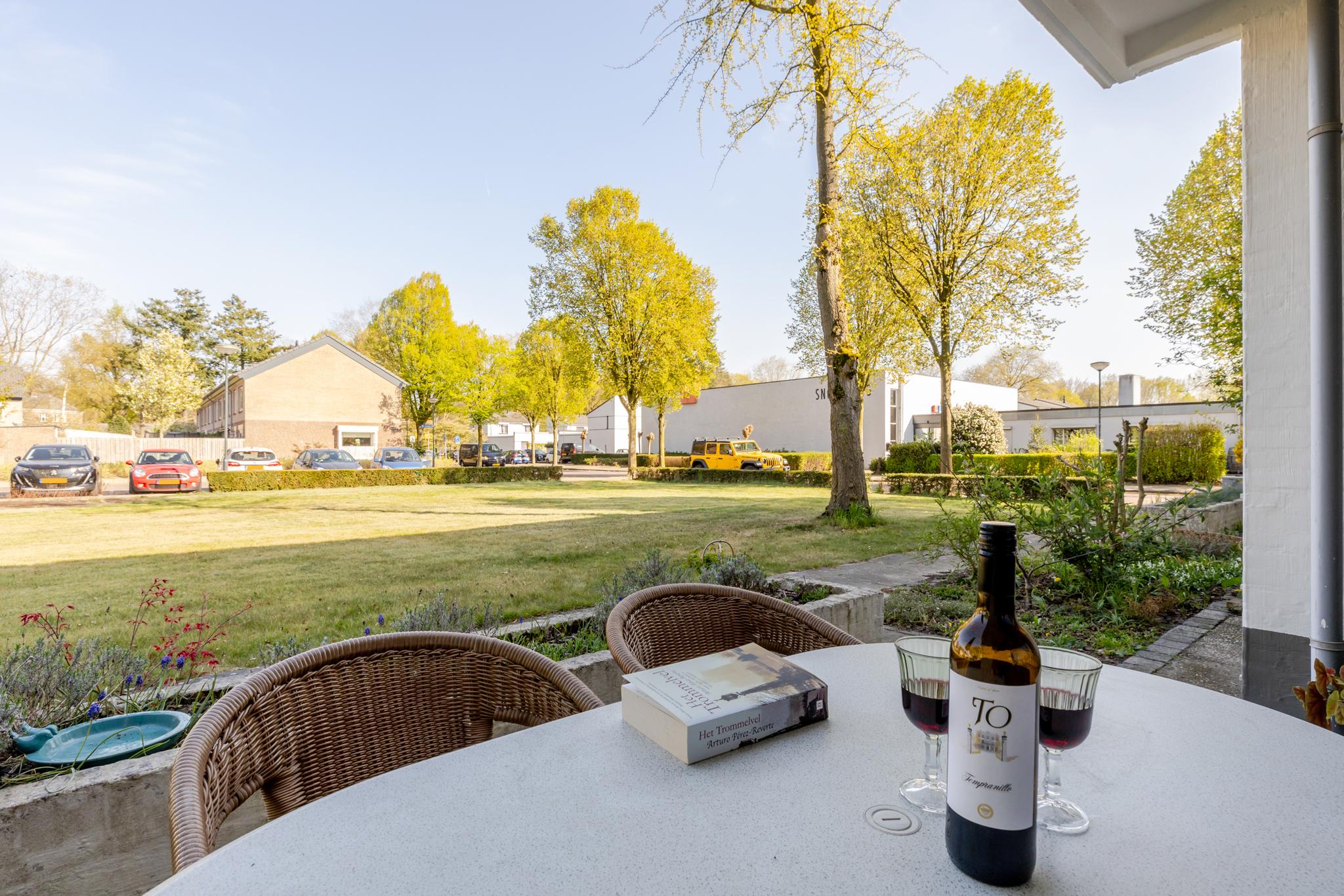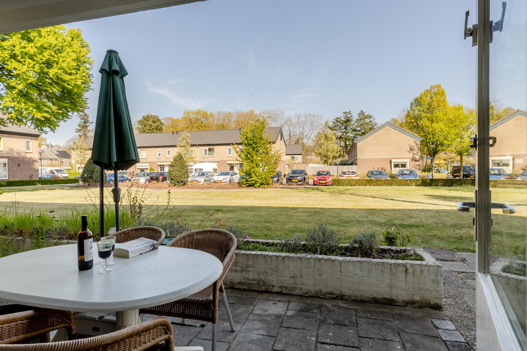 Het terras is gelegen op het oosten en biedt uitzicht over een groen grasveld.