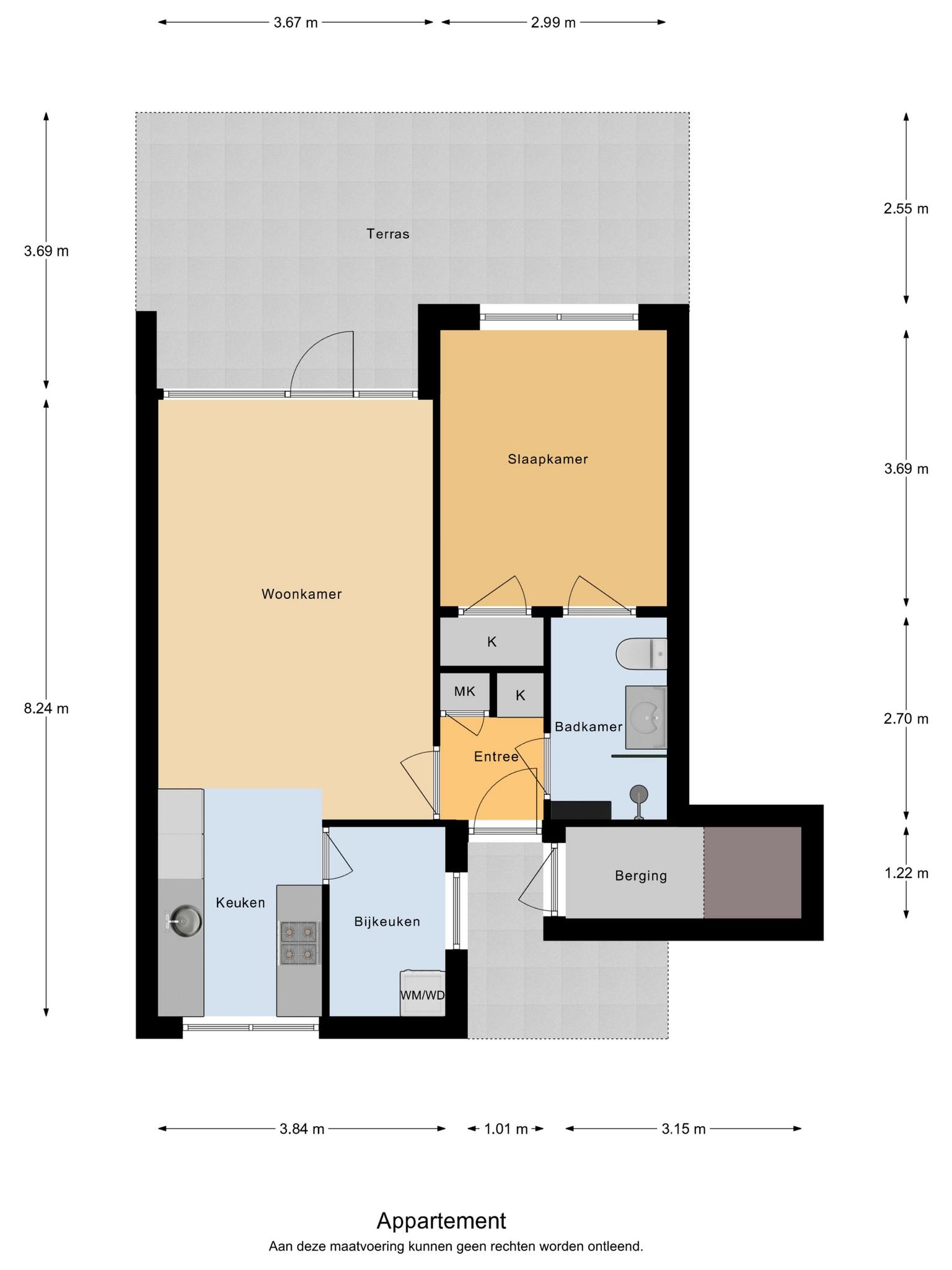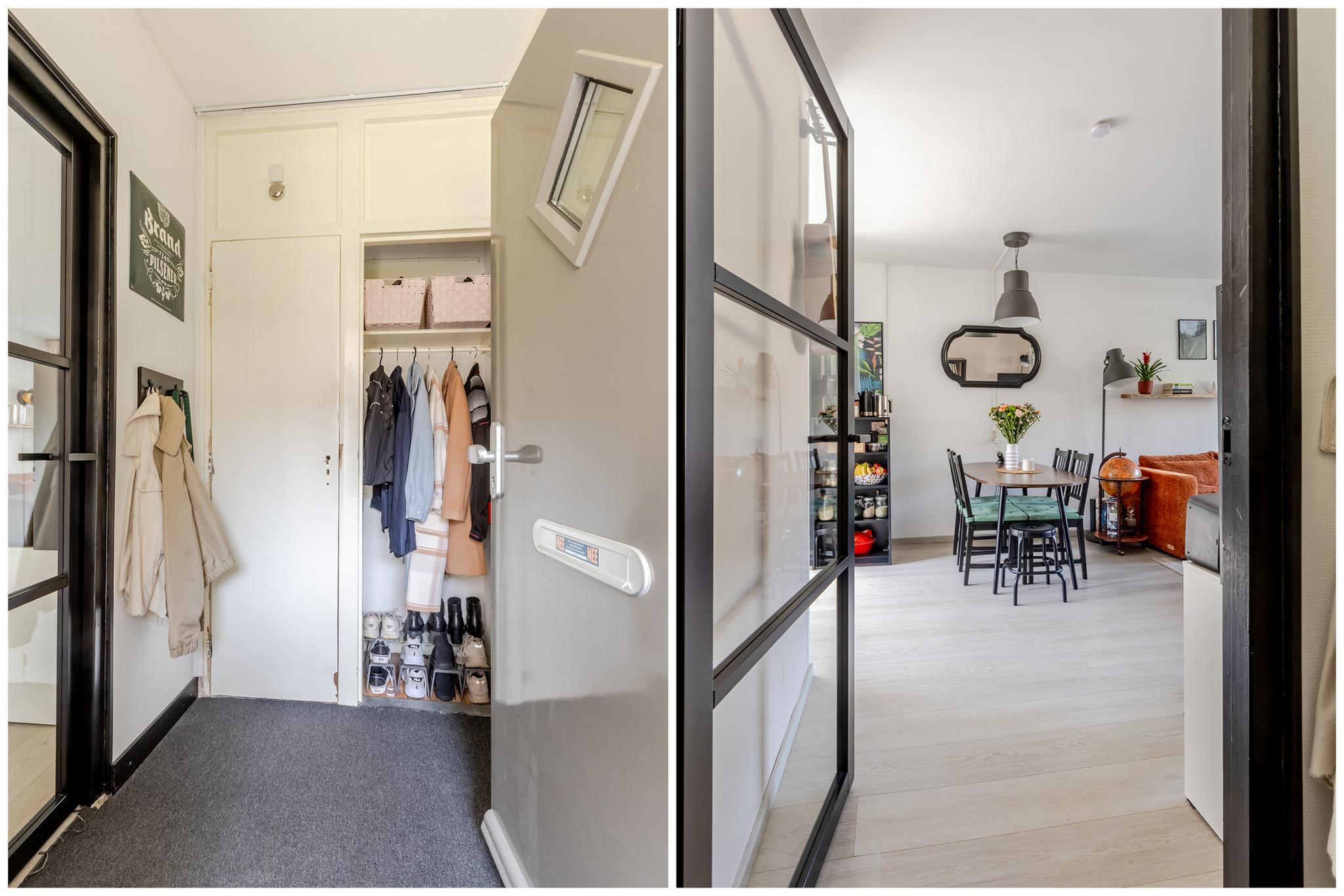 Eigen entree naar hal met vaste garderobekast en meterkast. Vanuit de entreehal zijn de badkamer en de woonkamer bereikbaar.