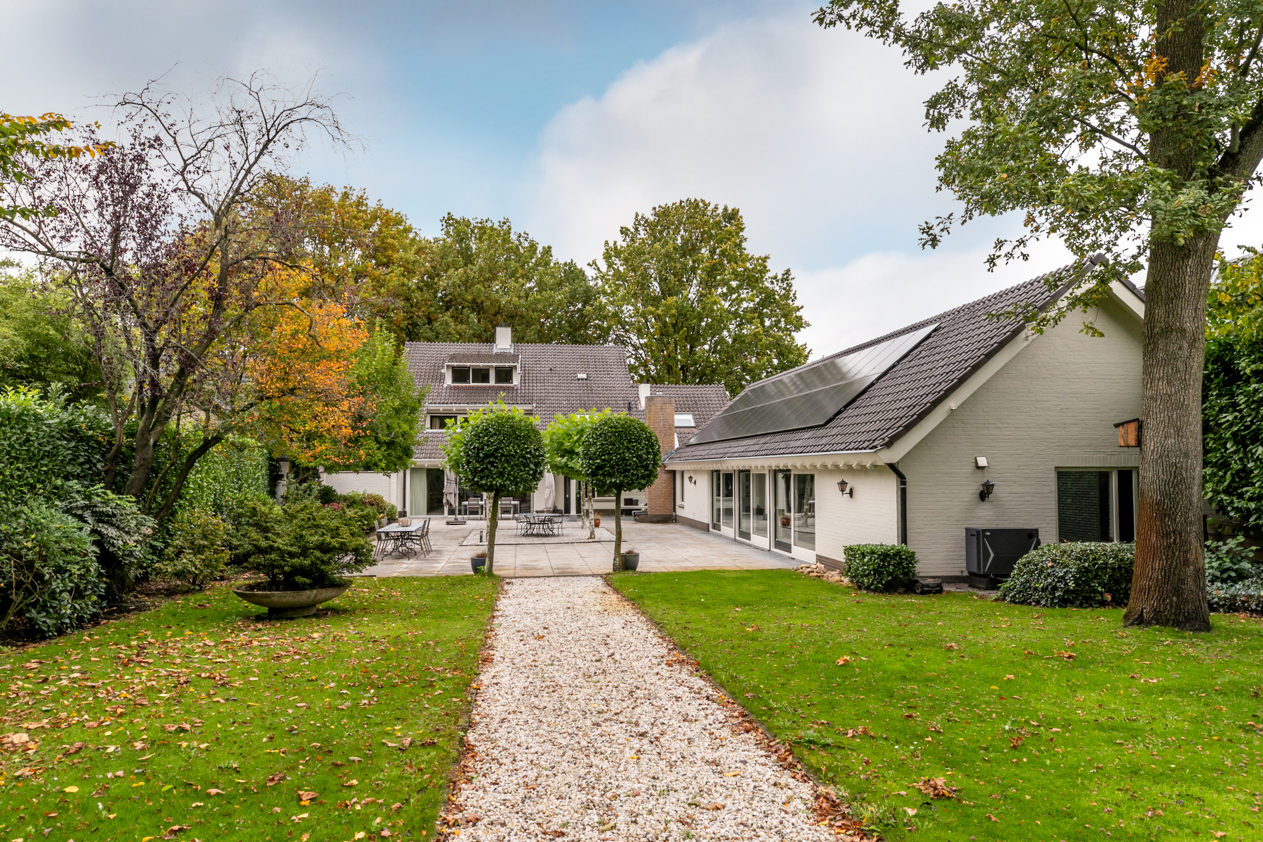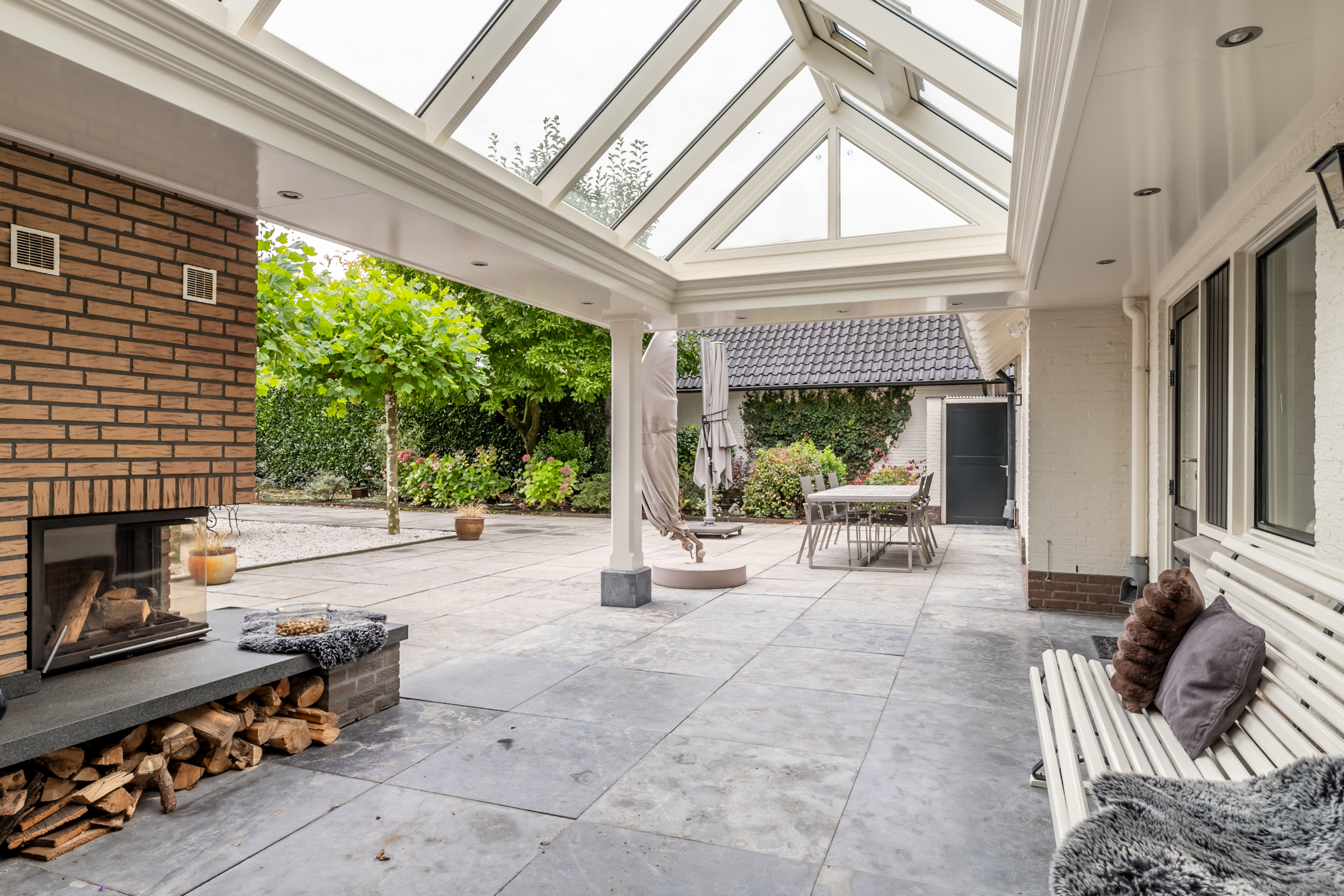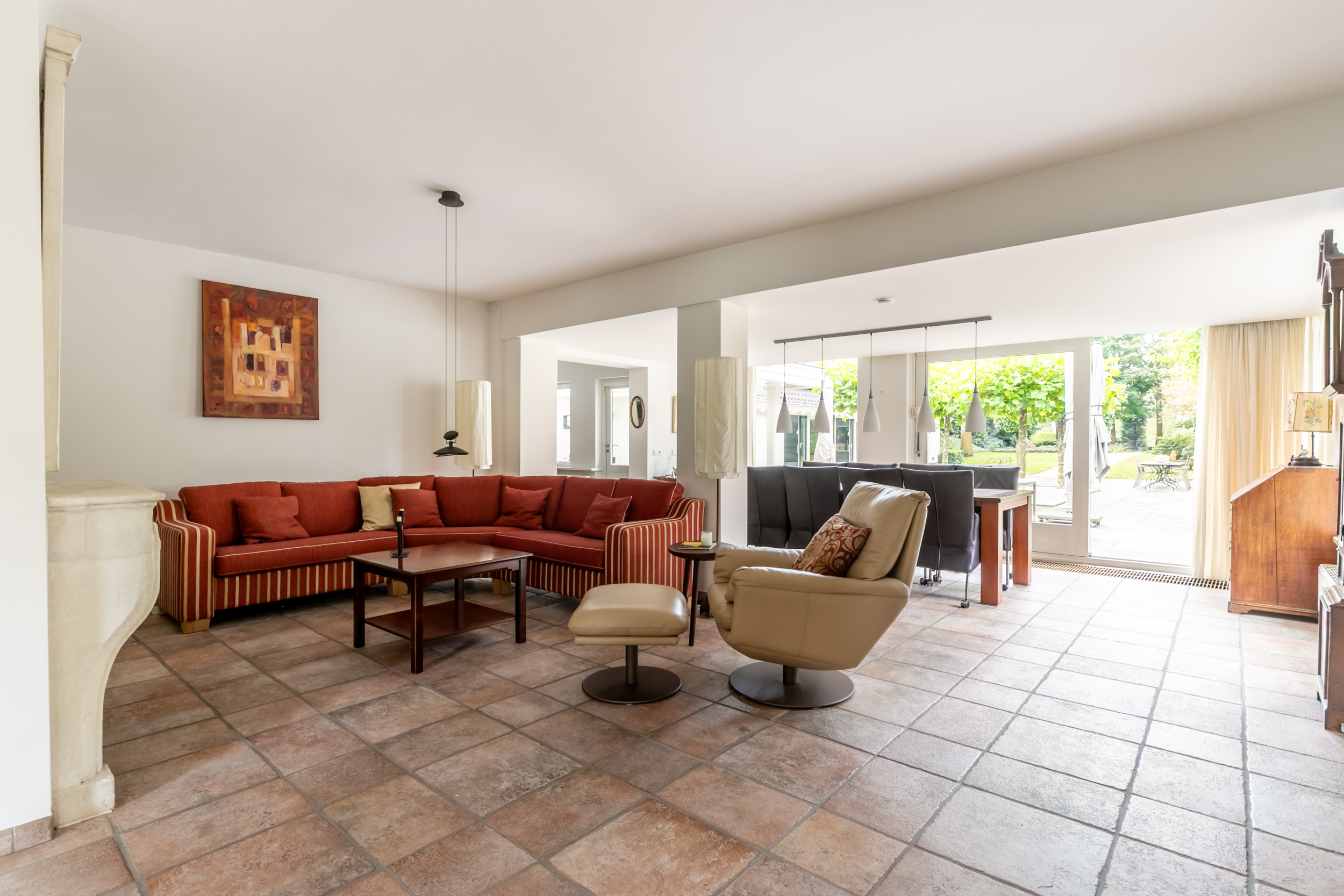 Royaal zonneterras deels overkapt door glazen veranda met heater en open haard en prachtig uitzicht over de parkachtige tuin met volwassen bomen en mogelijkheid tot het houden van paarden of ander klein vee. U loopt of rijdt vanaf uw eigen perceel zo de Loonse- en Drunense Duinen in!